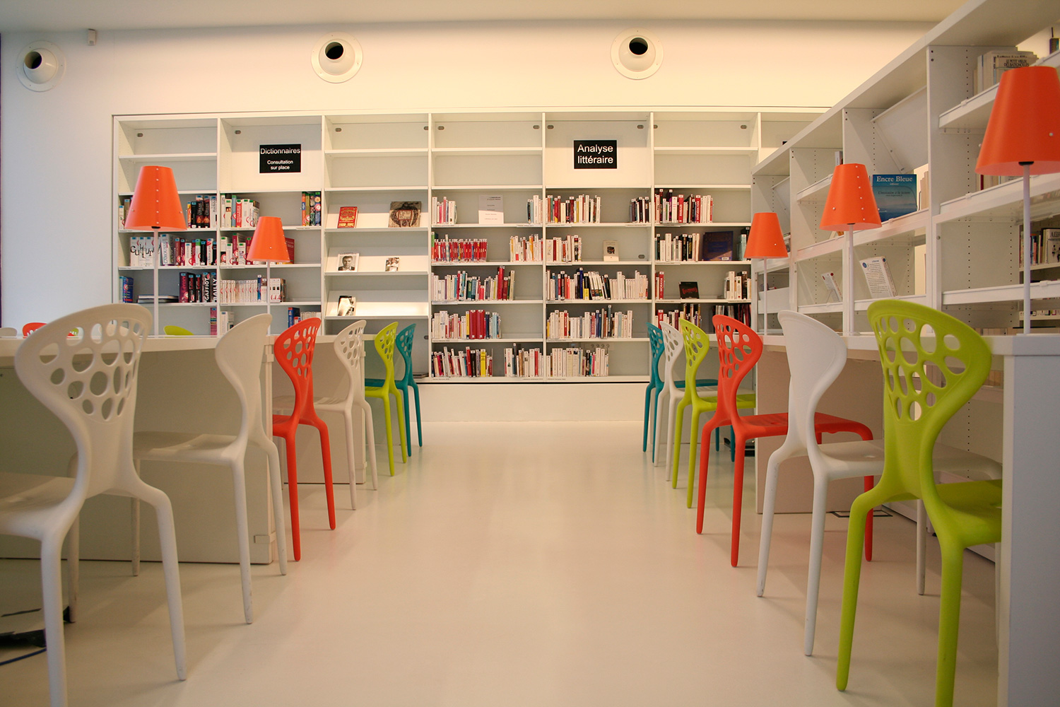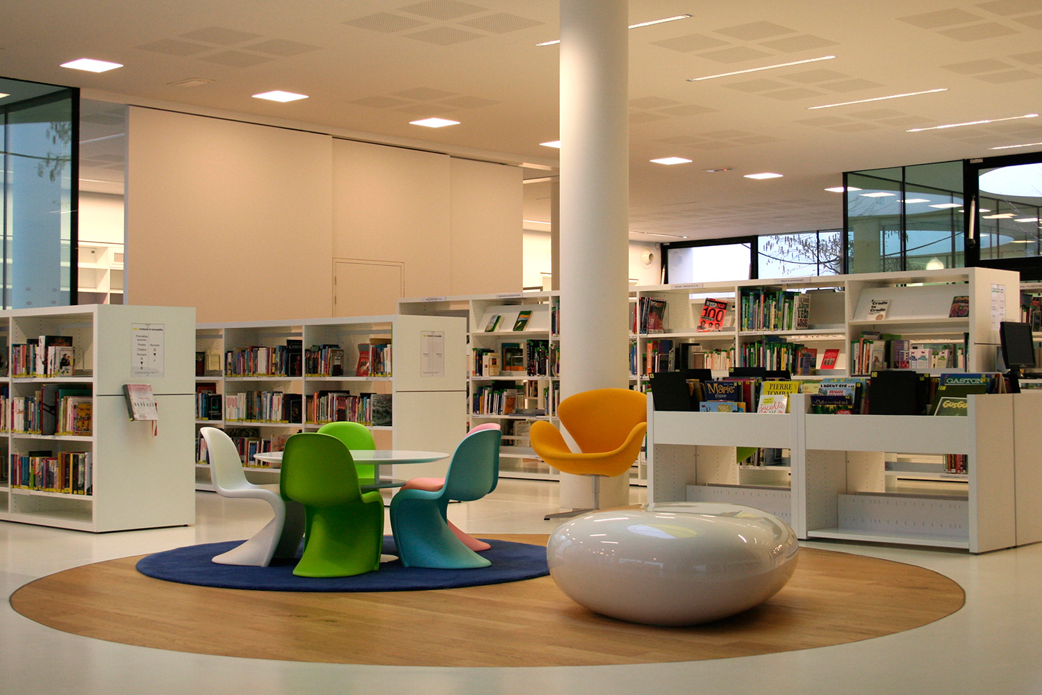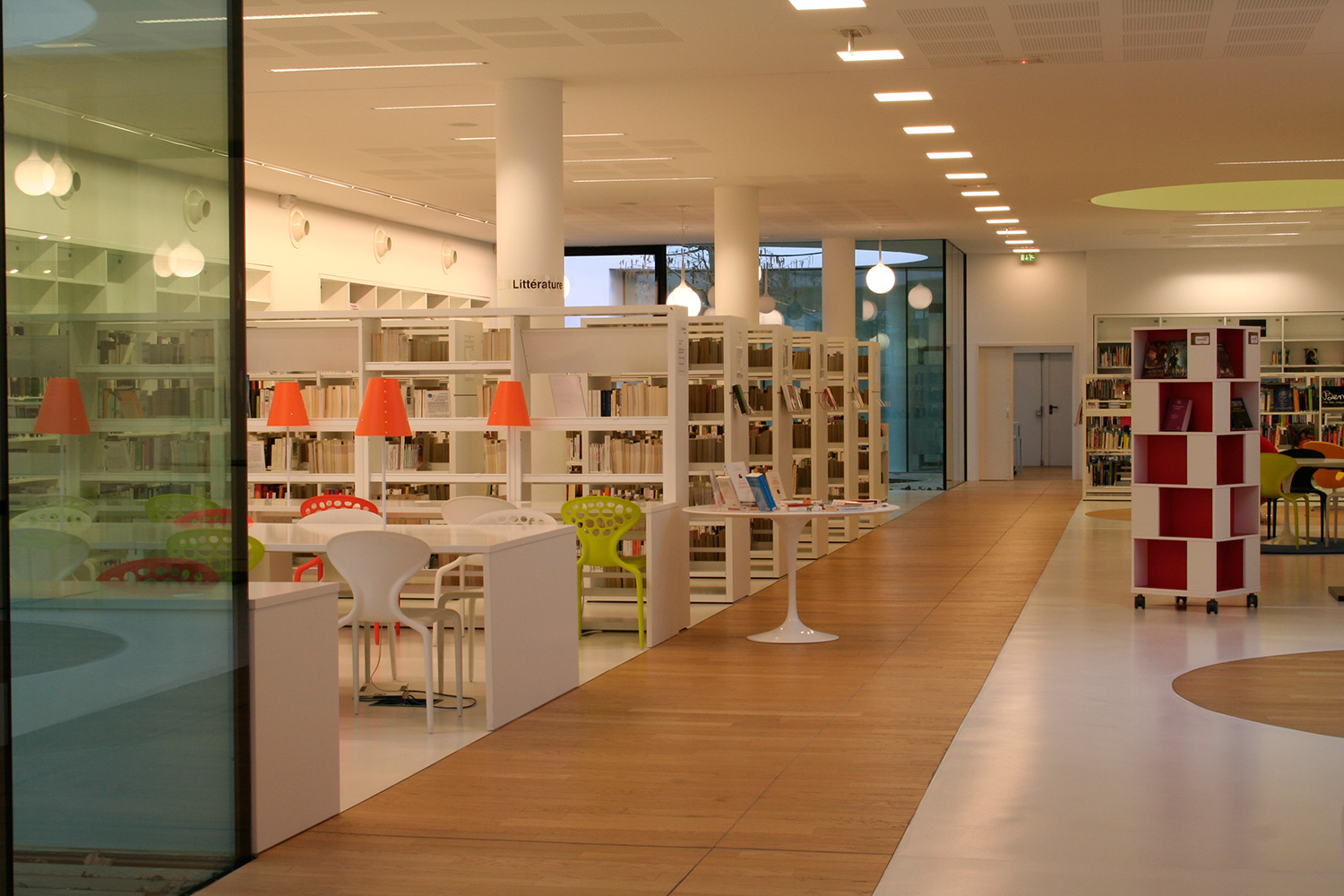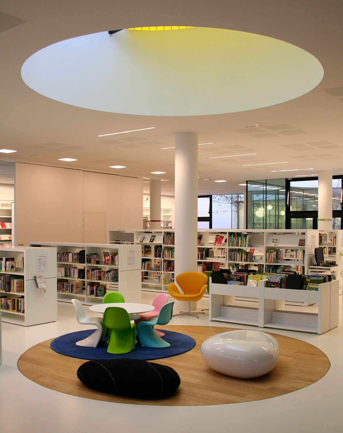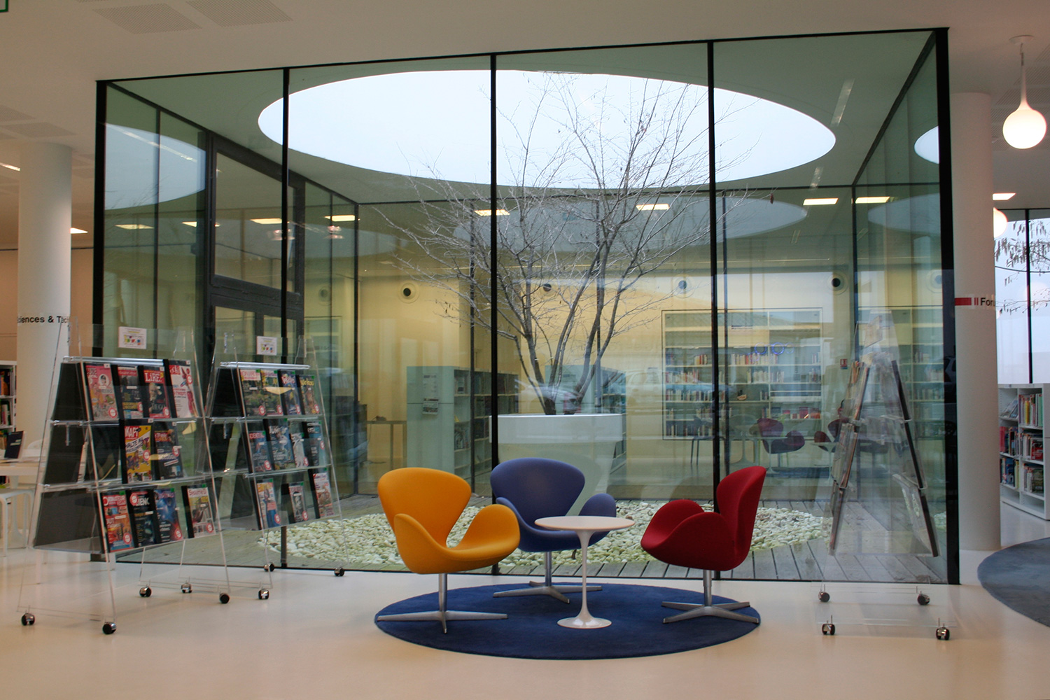 Due to the building being placed into a slope, the architects have made the exterior of the building transparent with large sections of windows allowing the light to flood in. The interior of the library is dominantly white, with a line of oak in the floor crossing through the entire library. Only the seating and a couple of carpets bring a splash of colour to the interior.
