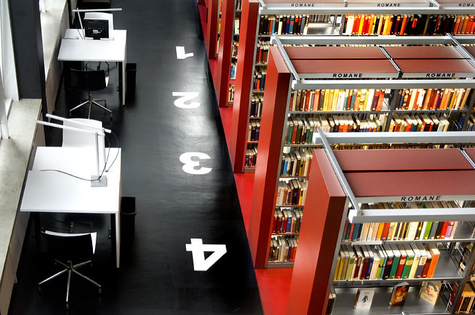 This library has two entrances, one for all library users, and one that leads directly into the adjacent grammar school. Thus the students have access to numerous additional media from the library to