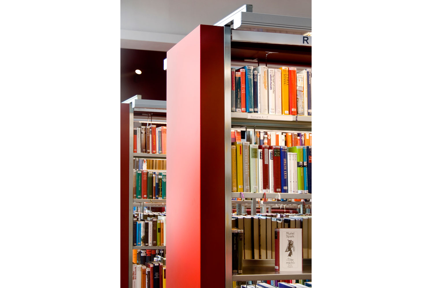 Our shelving system UNIFLEX is an integral part of the colour concept due to its coloured side panels and cover boards. An outstanding orientation is guaranteed by the integrated shelf lighting, combined with numerous graphic elements such as inscriptions on shelves, walls and floors.