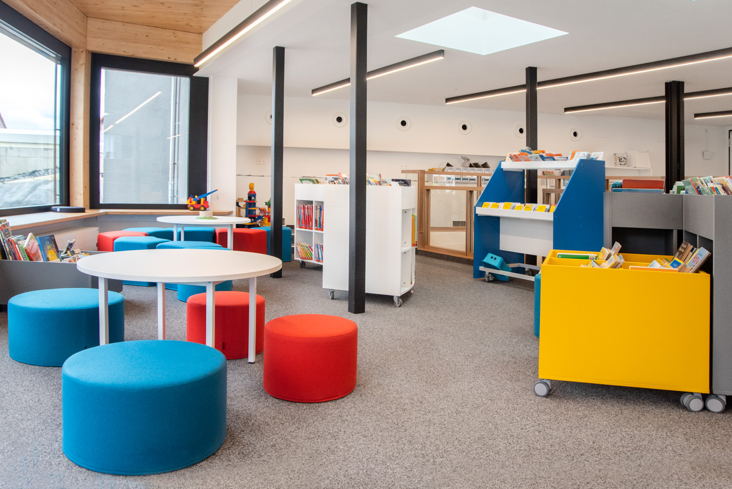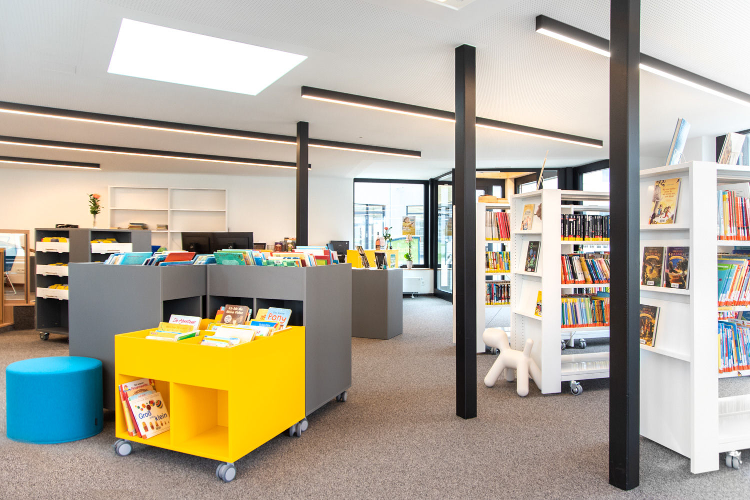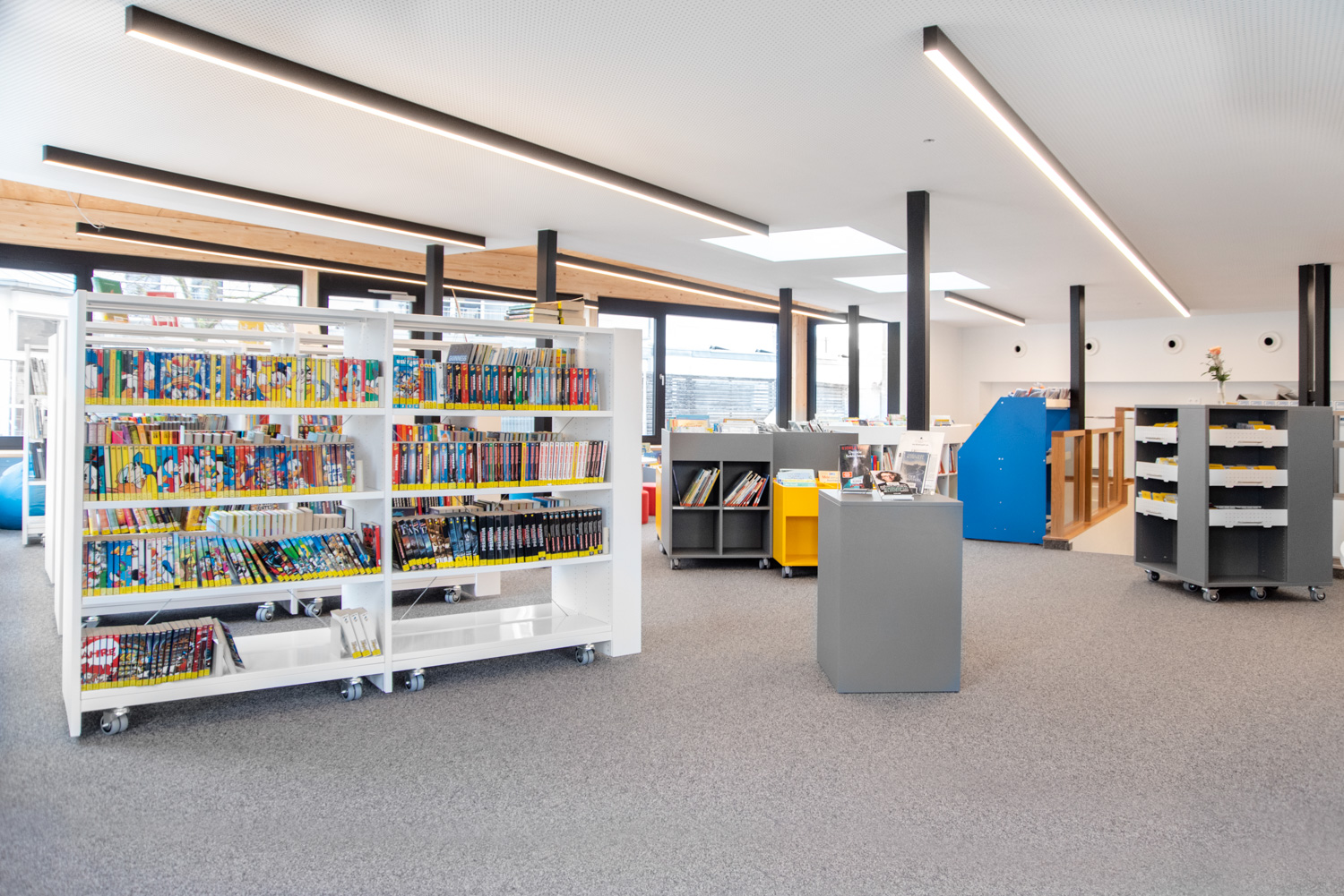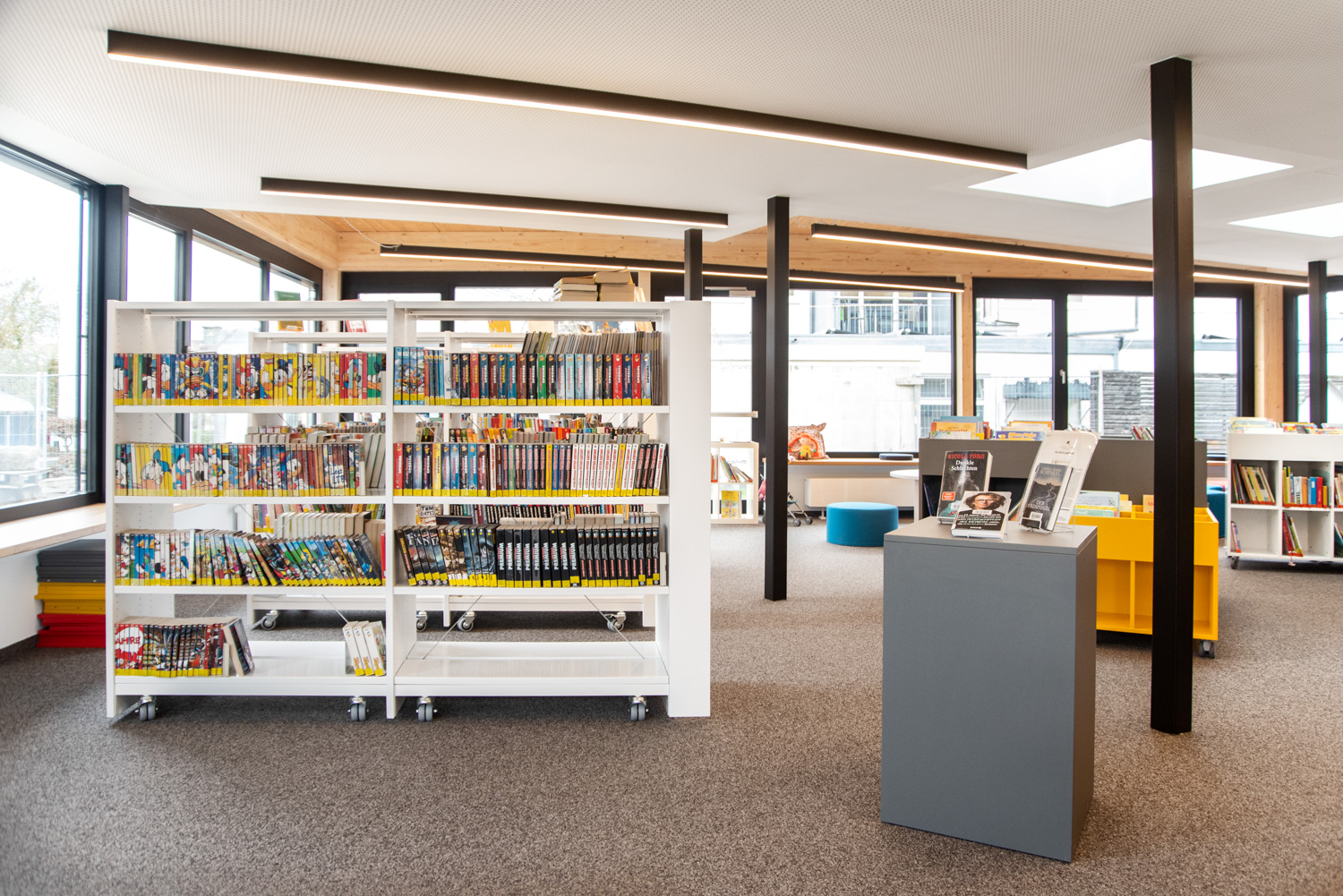 Rot am See Library is located in a modern building in the heart of the town of Rot am See. The library encompasses everything a modern library should have within a relatively small space.