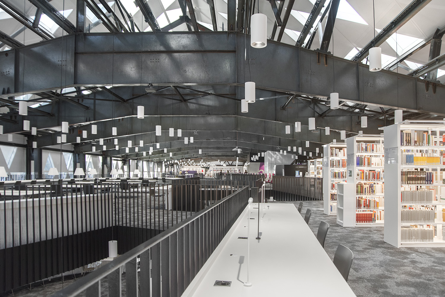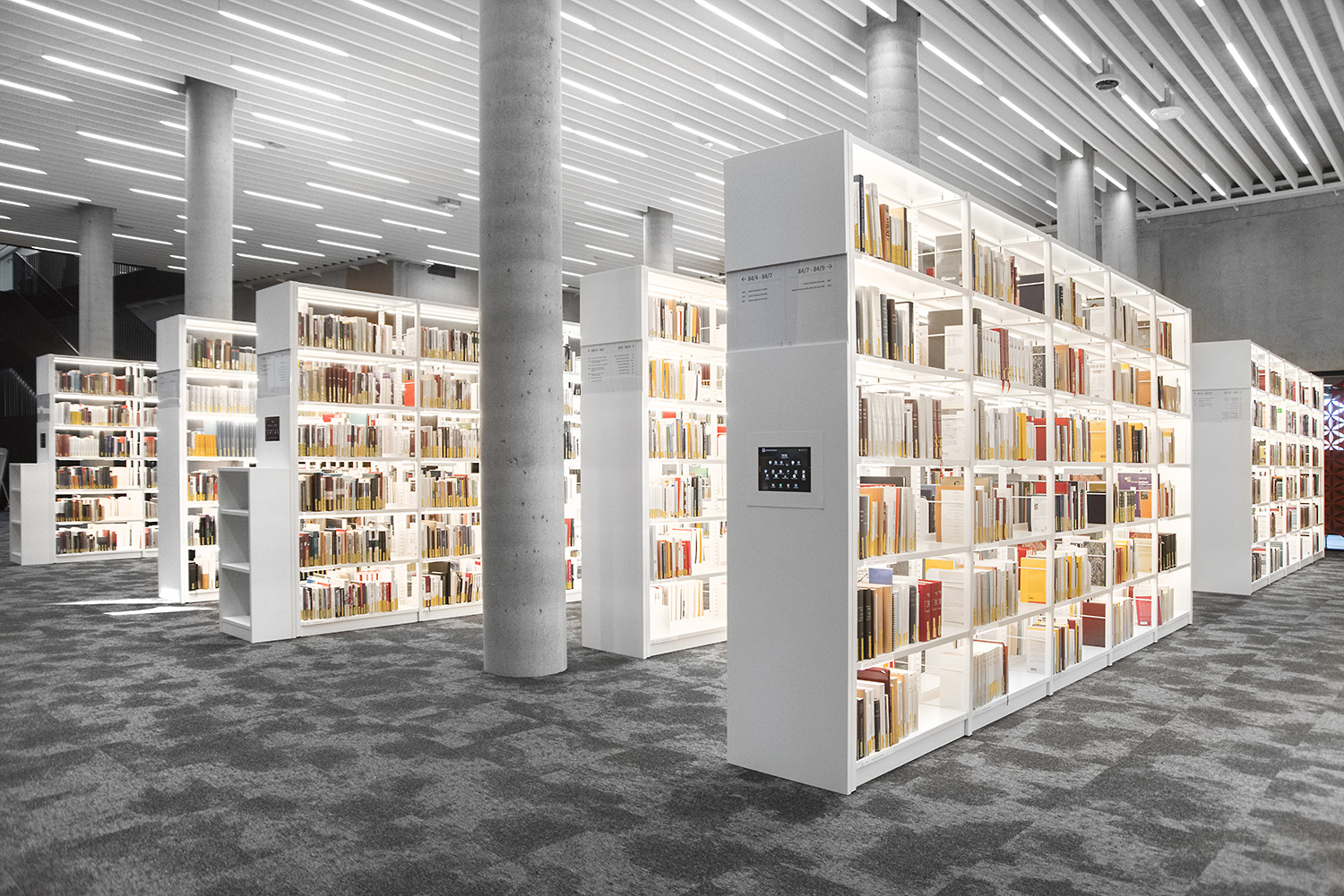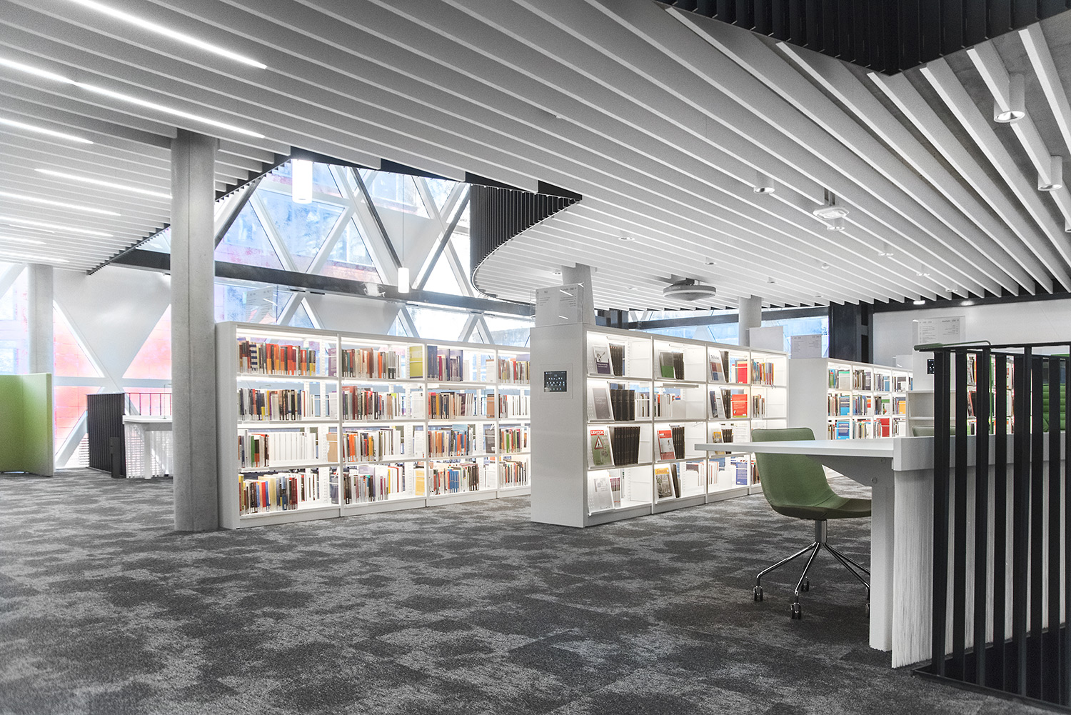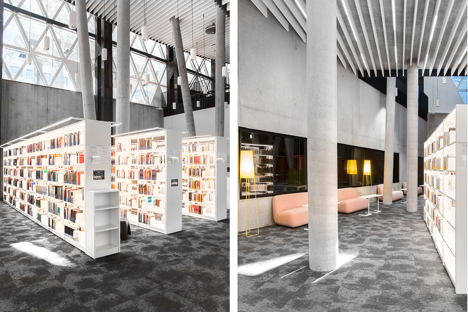 With its clear design and practical all day usability our Uniflex Shelving System with integrated LED lighting provides 10.7 km of shelf capacity spread over 5 floors.