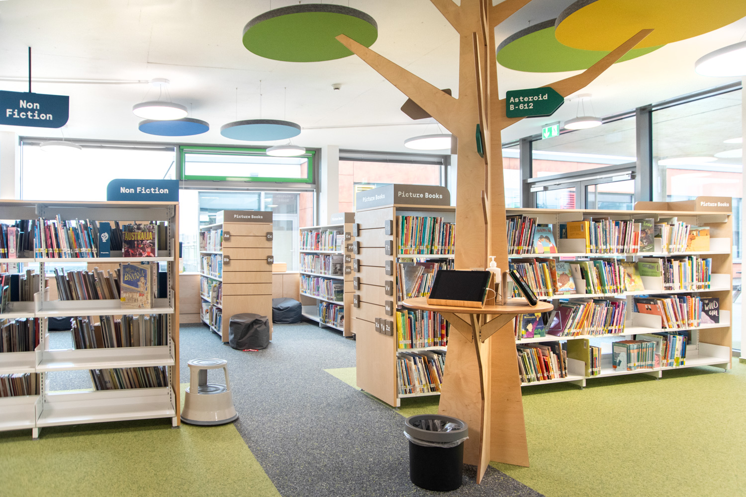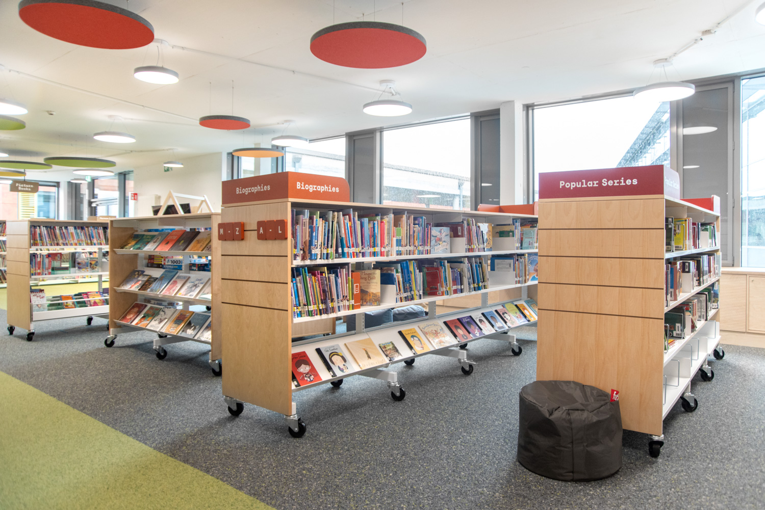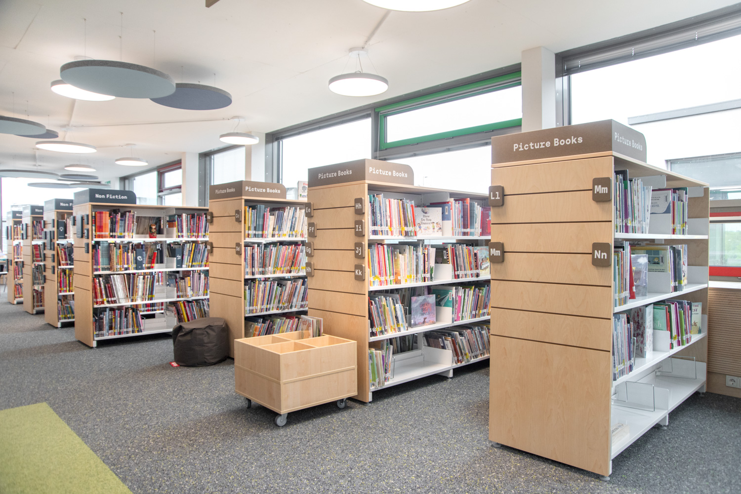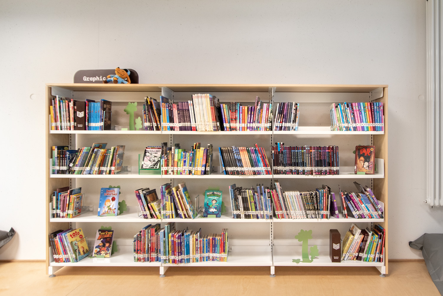 The shelving's slotted end panels allow for attractive signage, customized to meet the needs of visitors. In this thoughtfully designed library, children are supported in their journey to become information-savvy global citizens.