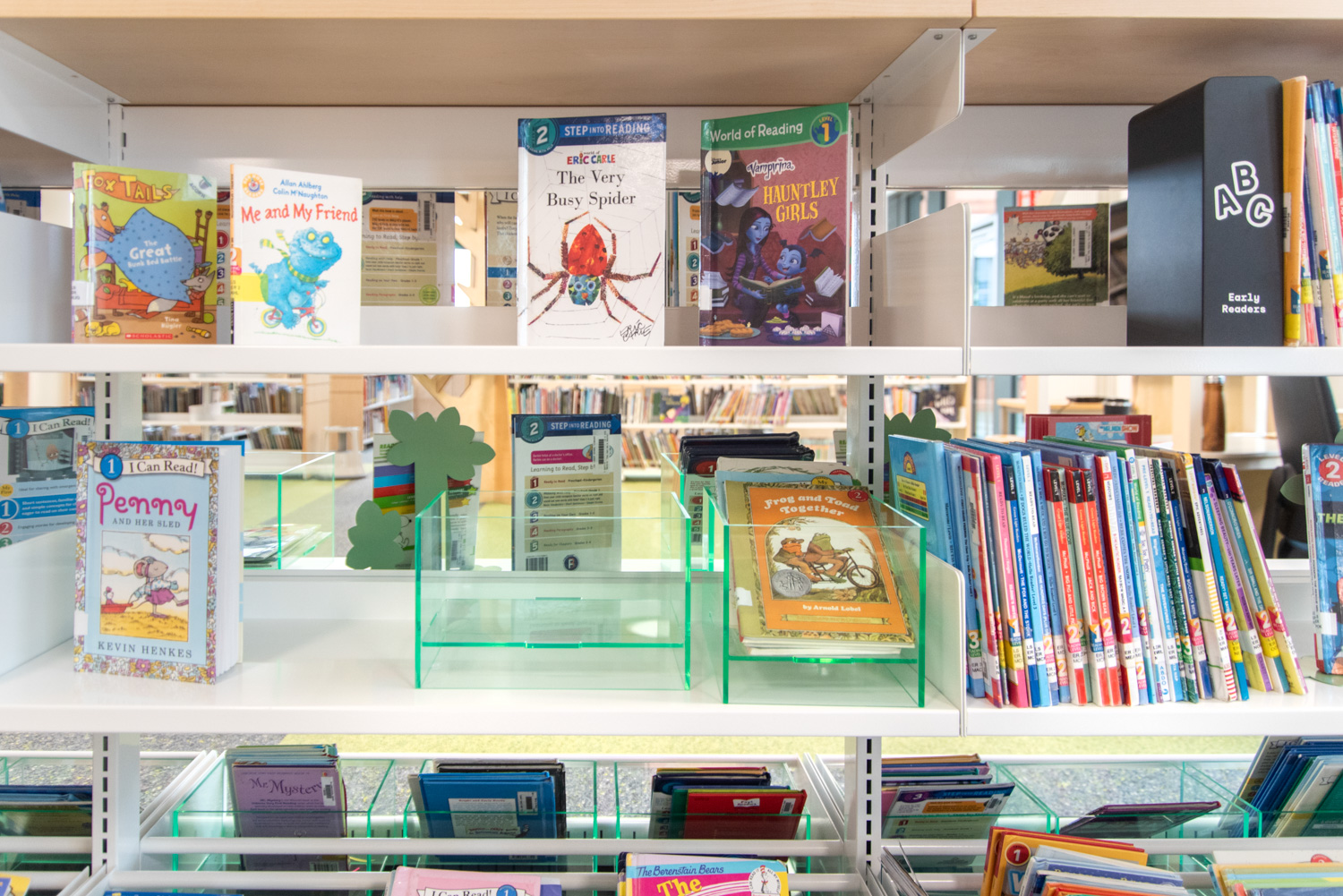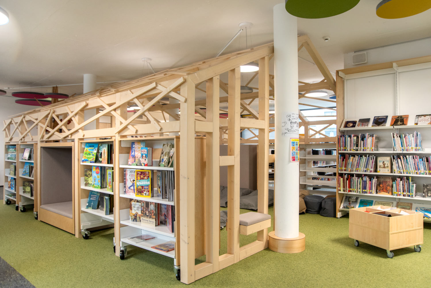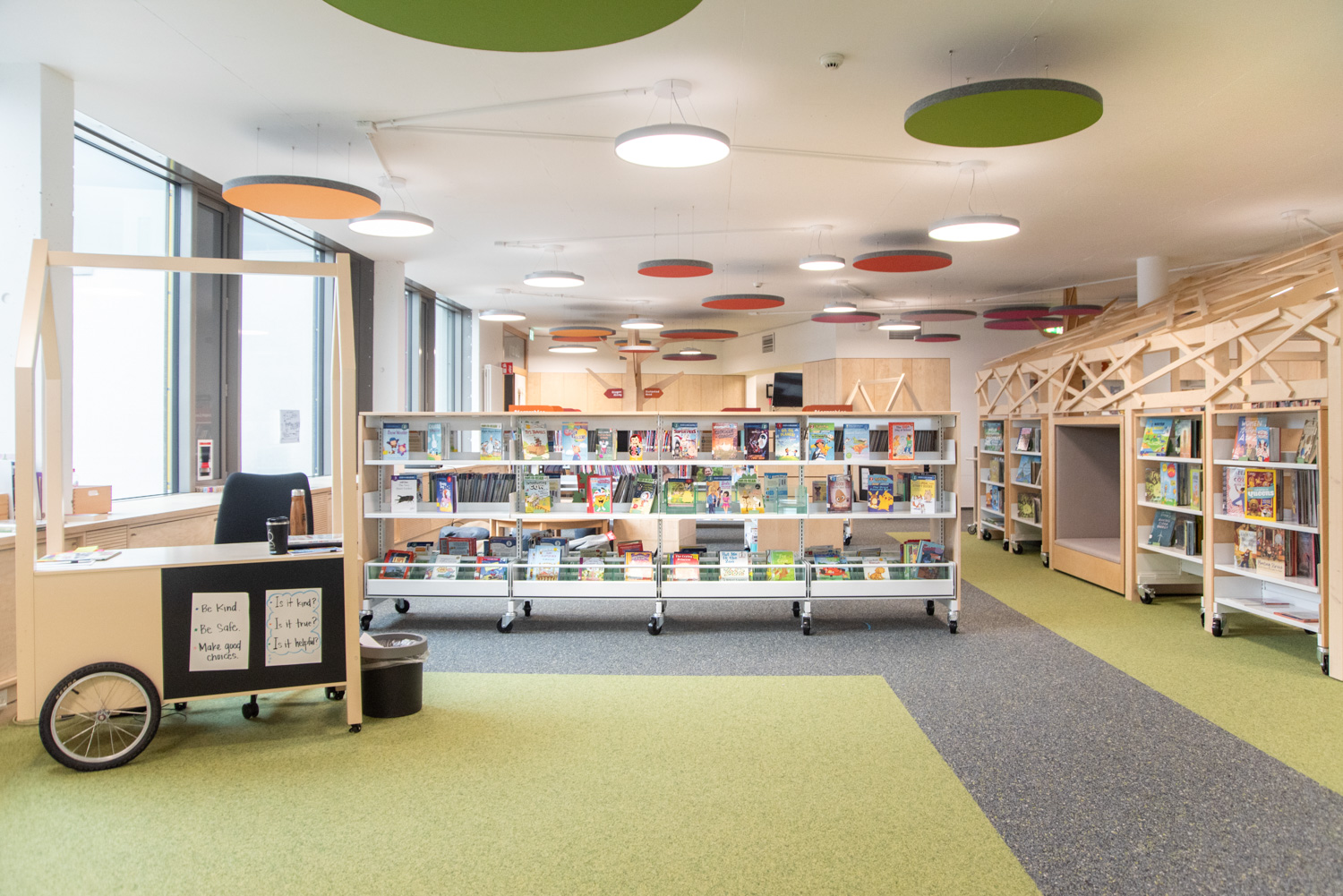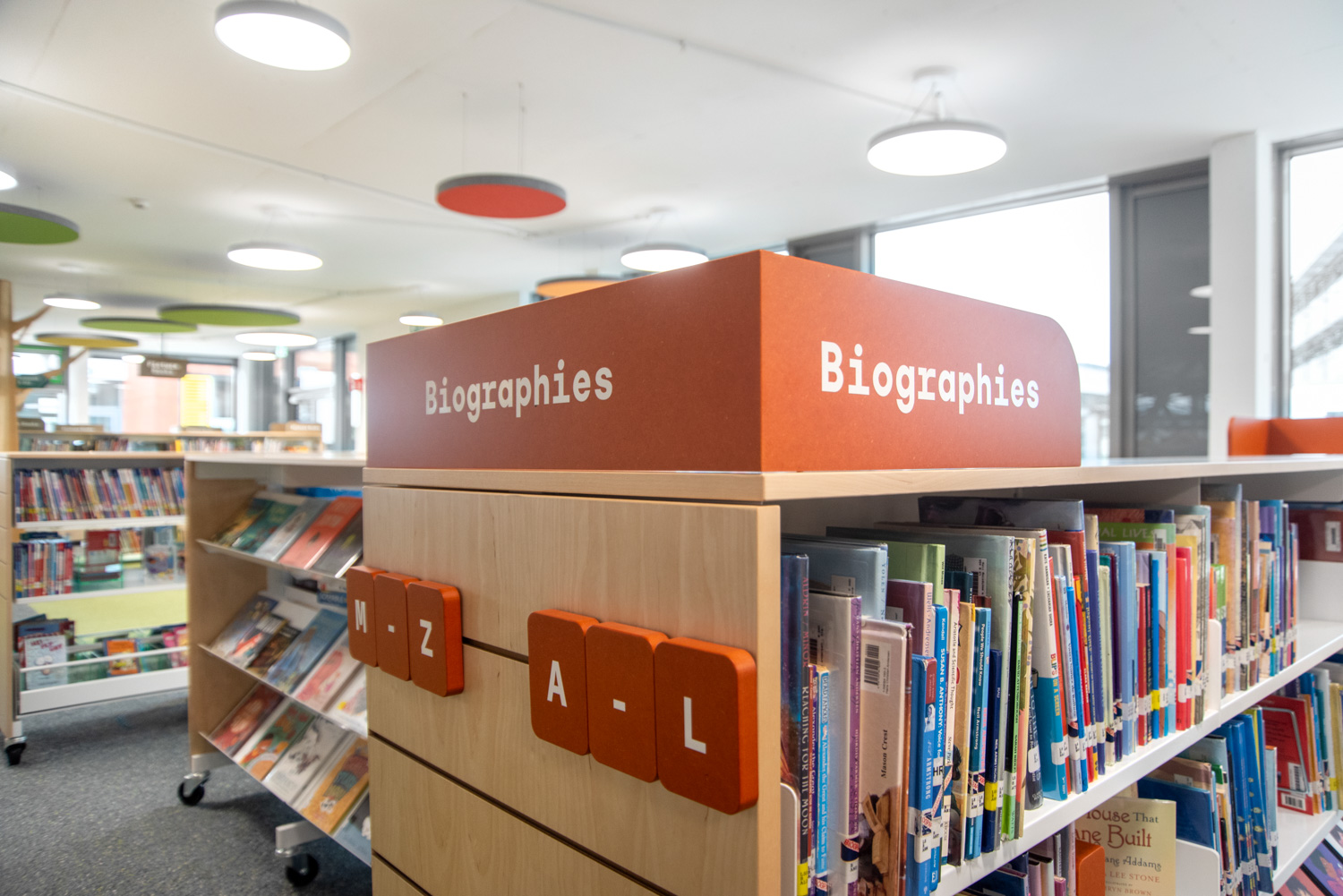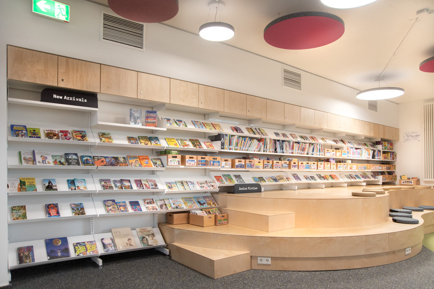 The shelving's slotted end panels allow for attractive signage, customized to meet the needs of visitors. In this thoughtfully designed library, children are supported in their journey to become information-savvy global citizens.