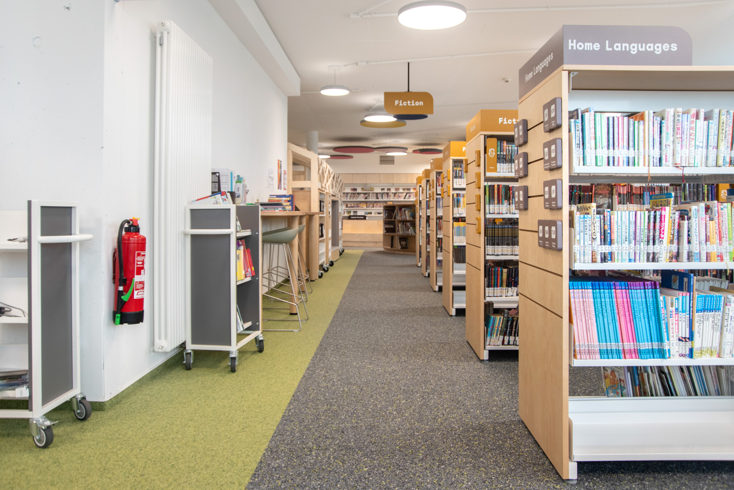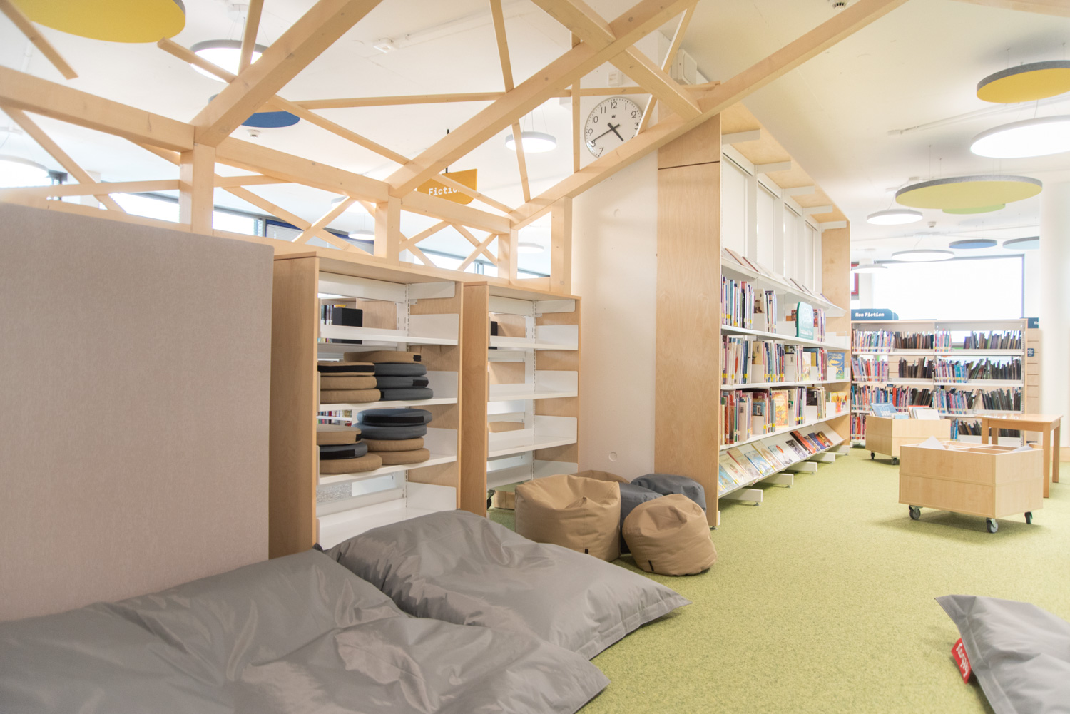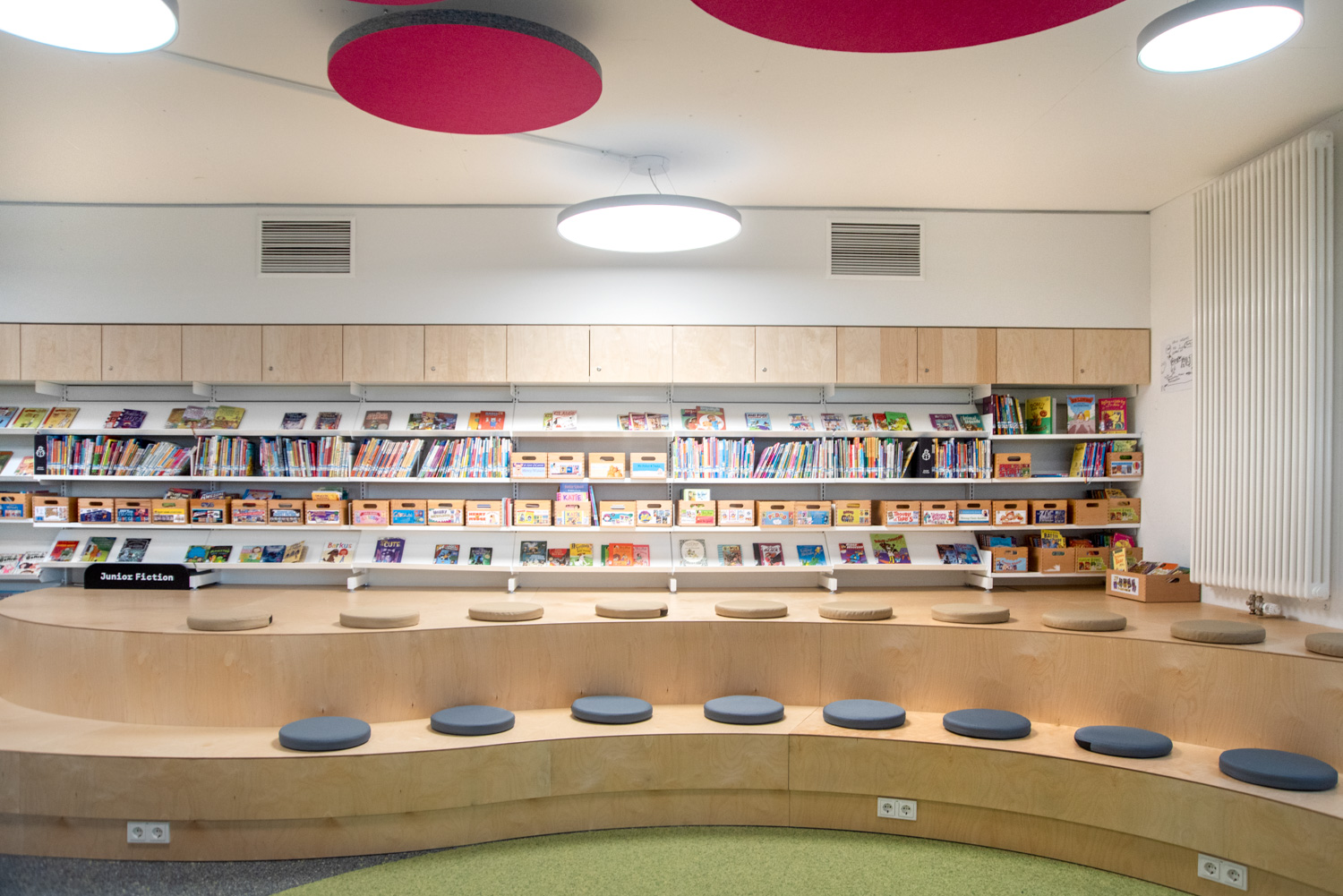 The collection is displayed on metal 60/30 shelving with a wooden finish or integrated into custom-made furniture. The use of bright white alongside warm wood directs focus towards the books. Acoustic ceiling islands add colourful accents that beautifully complement the flooring.