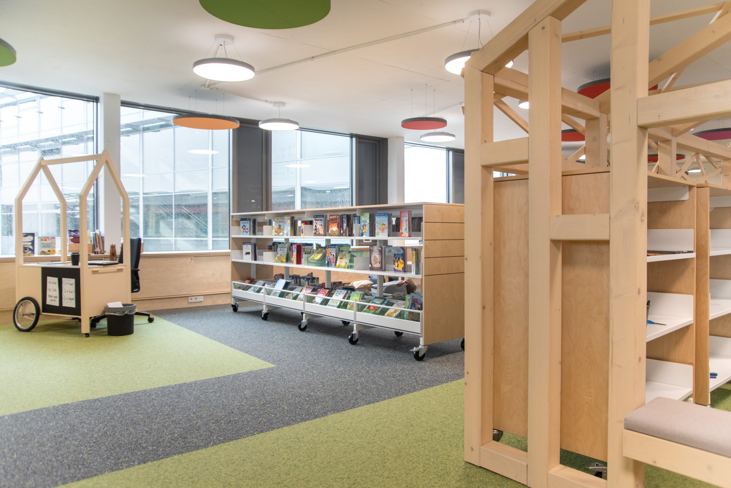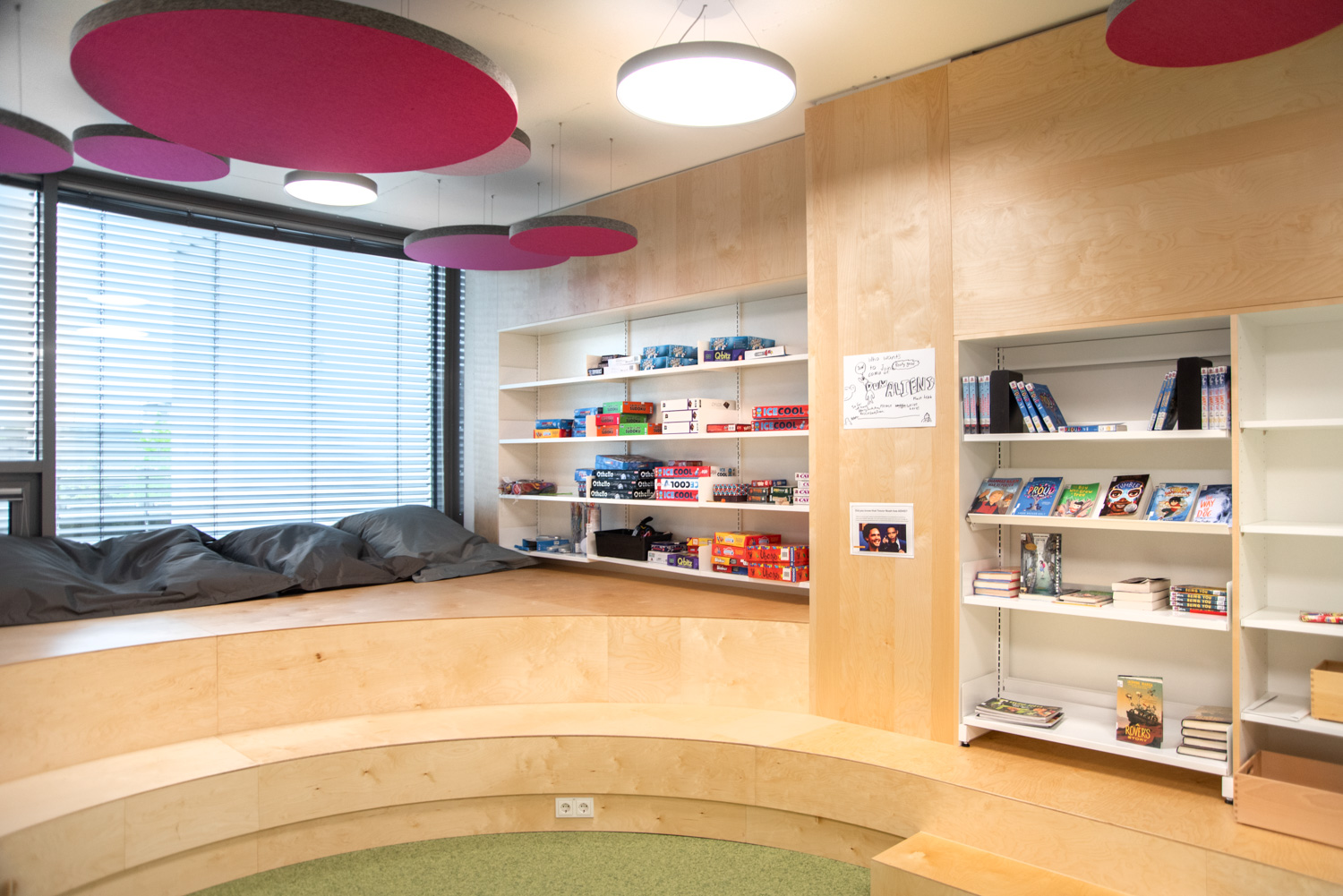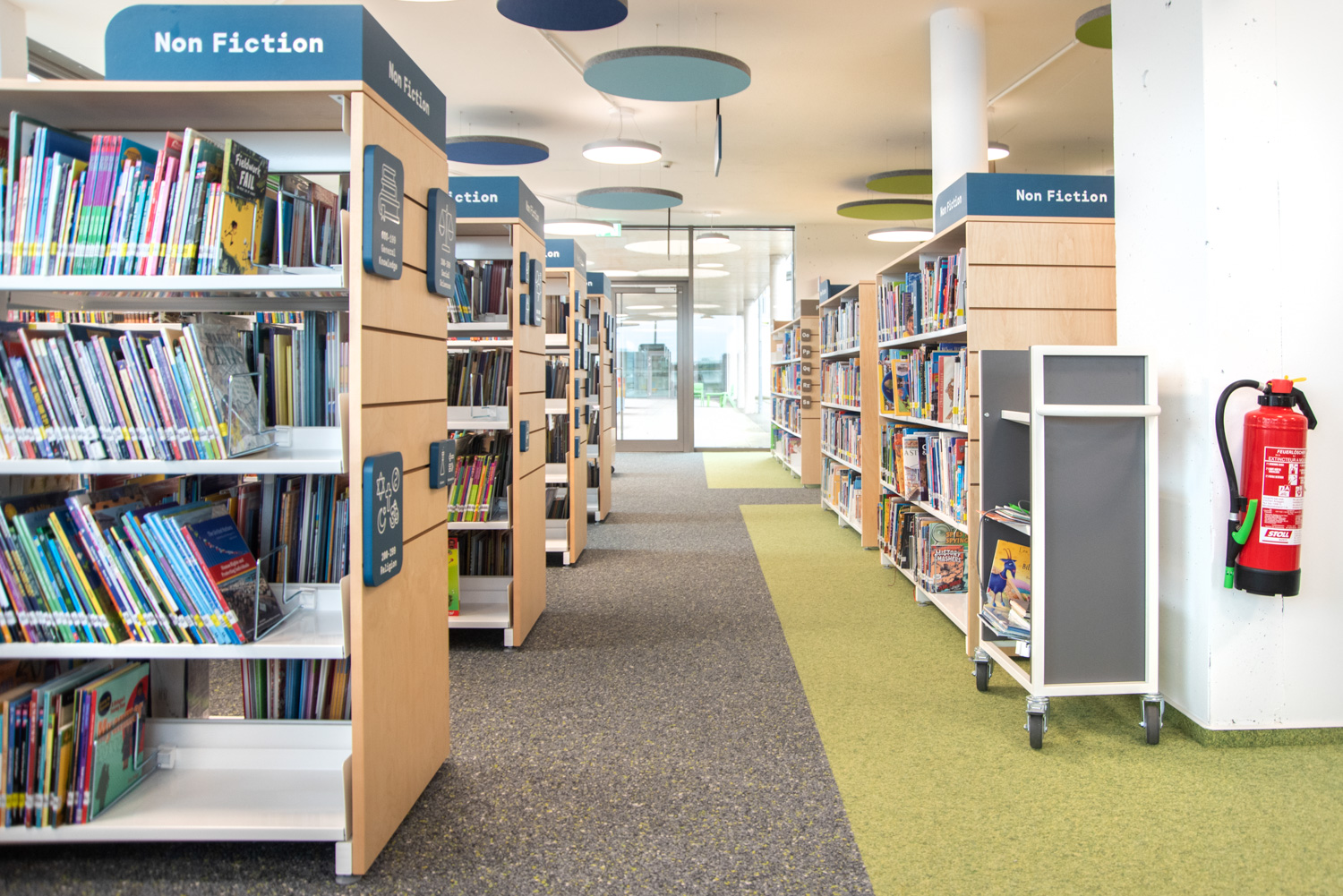 The collection is displayed on metal 60/30 shelving with a wooden finish or integrated into custom-made furniture. The use of bright white alongside warm wood directs focus towards the books. Acoustic ceiling islands add colourful accents that beautifully complement the flooring.