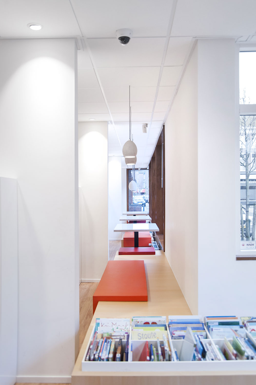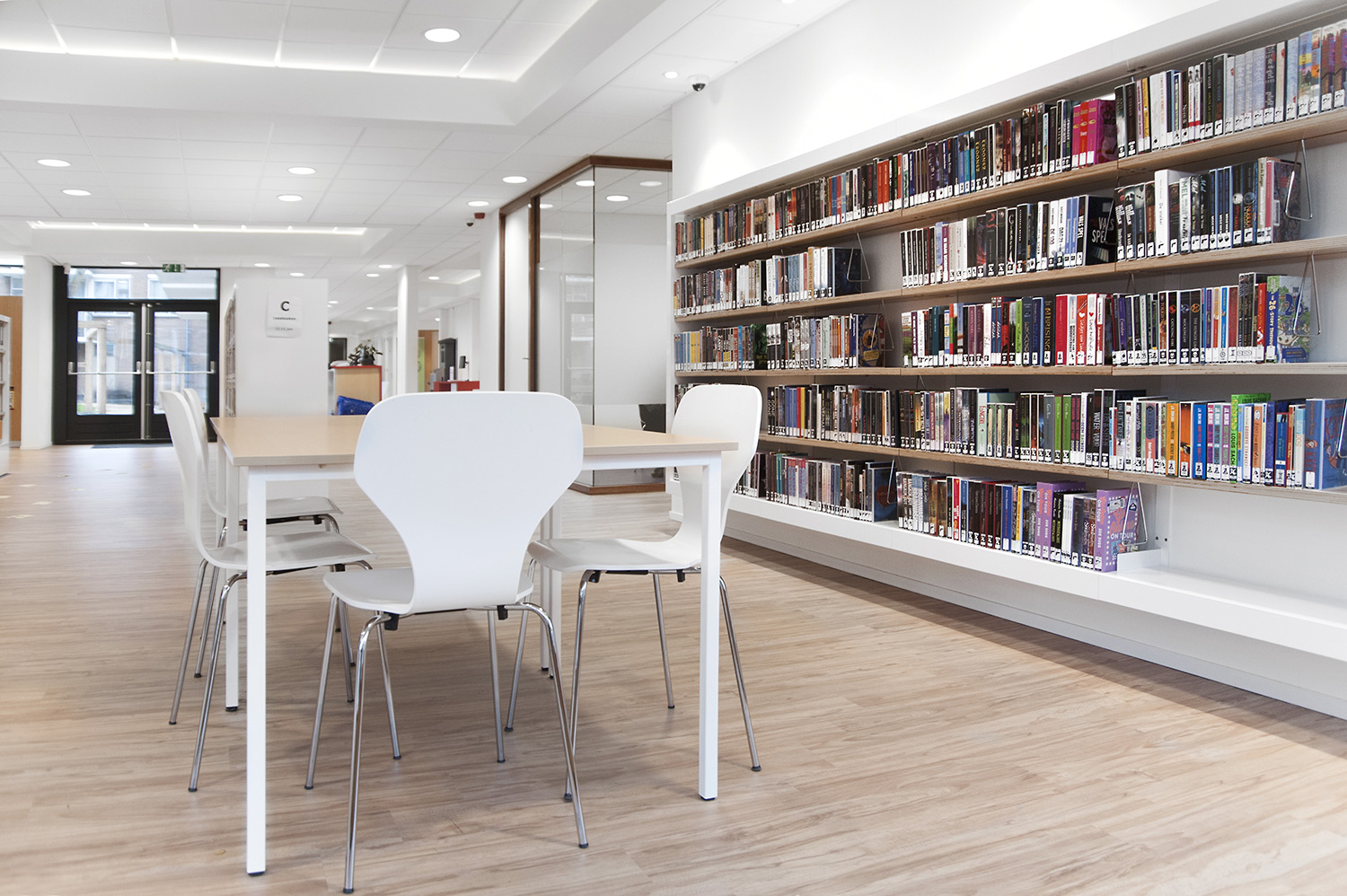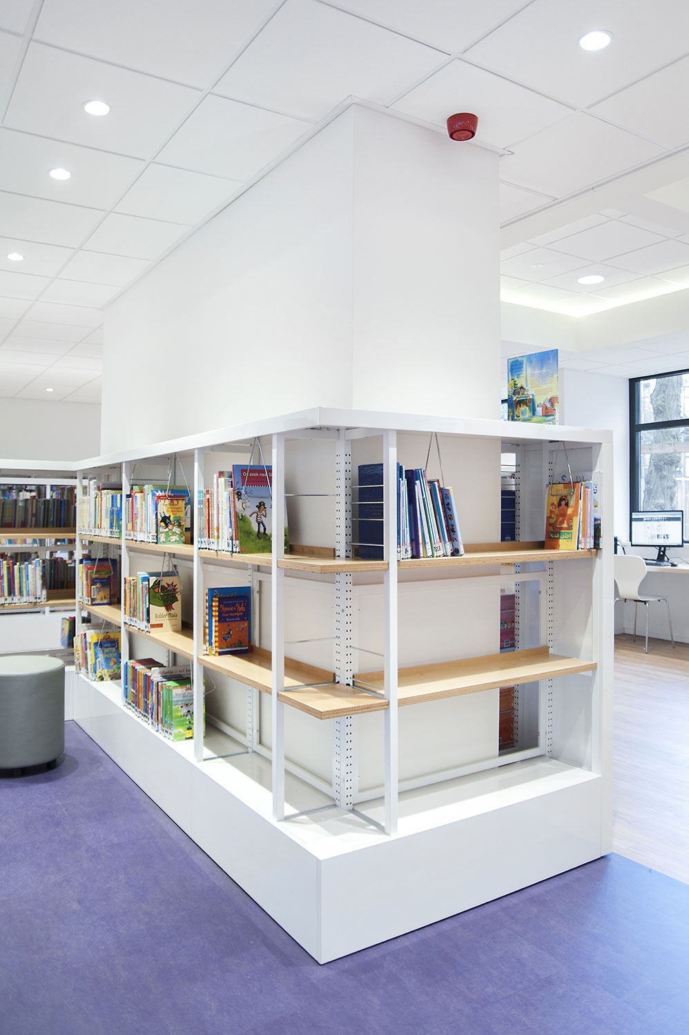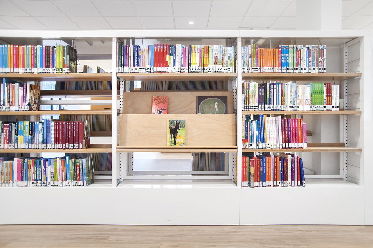The design of the library has been made by the archtiects +31ARCHITECTS and Millie’s. The interior is spacious and light. It is a combination of custom furniture and standard Uniflex library shelving. But even the library shelving is used in a way so that it almost looks like custom furniture.