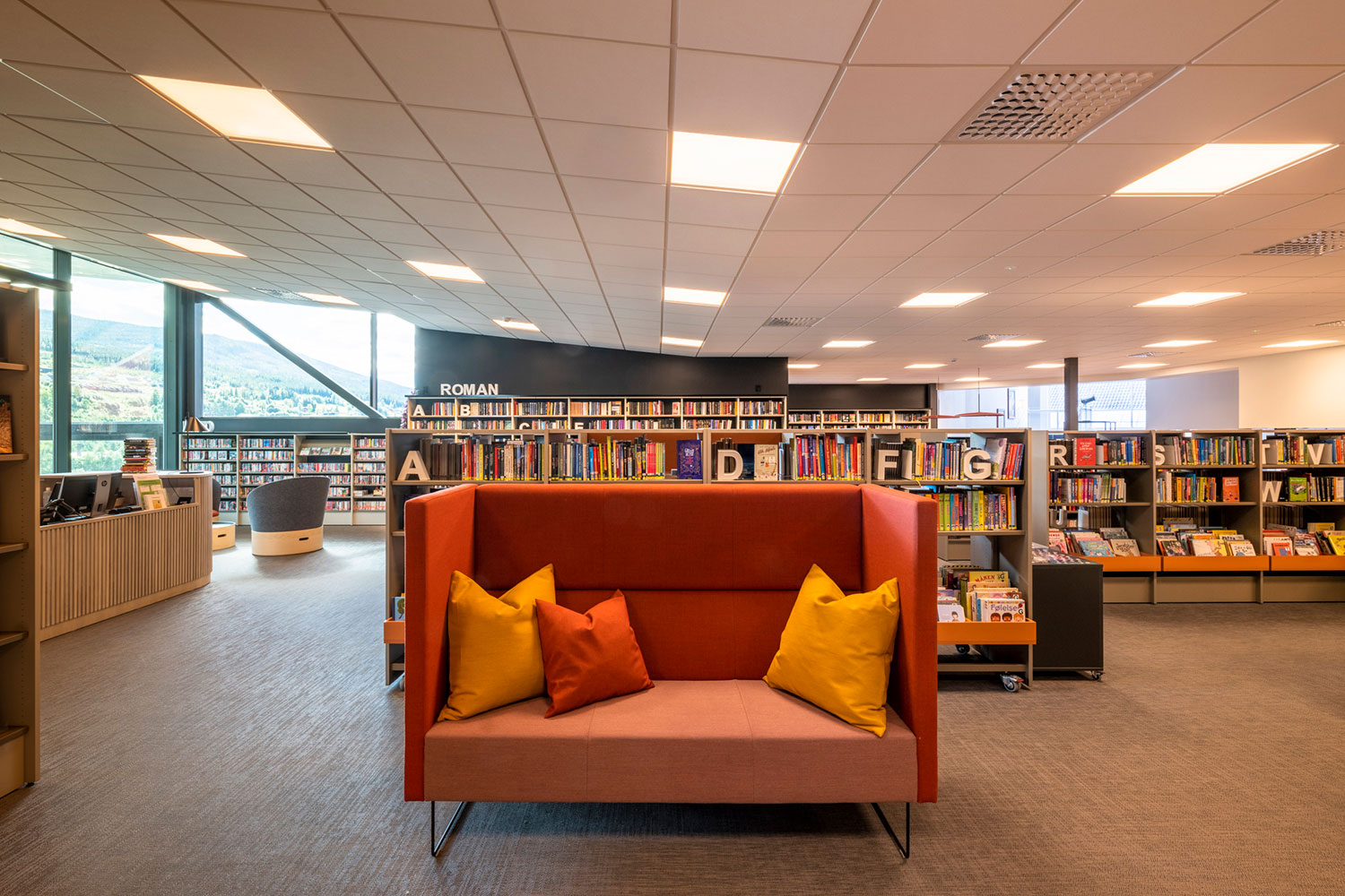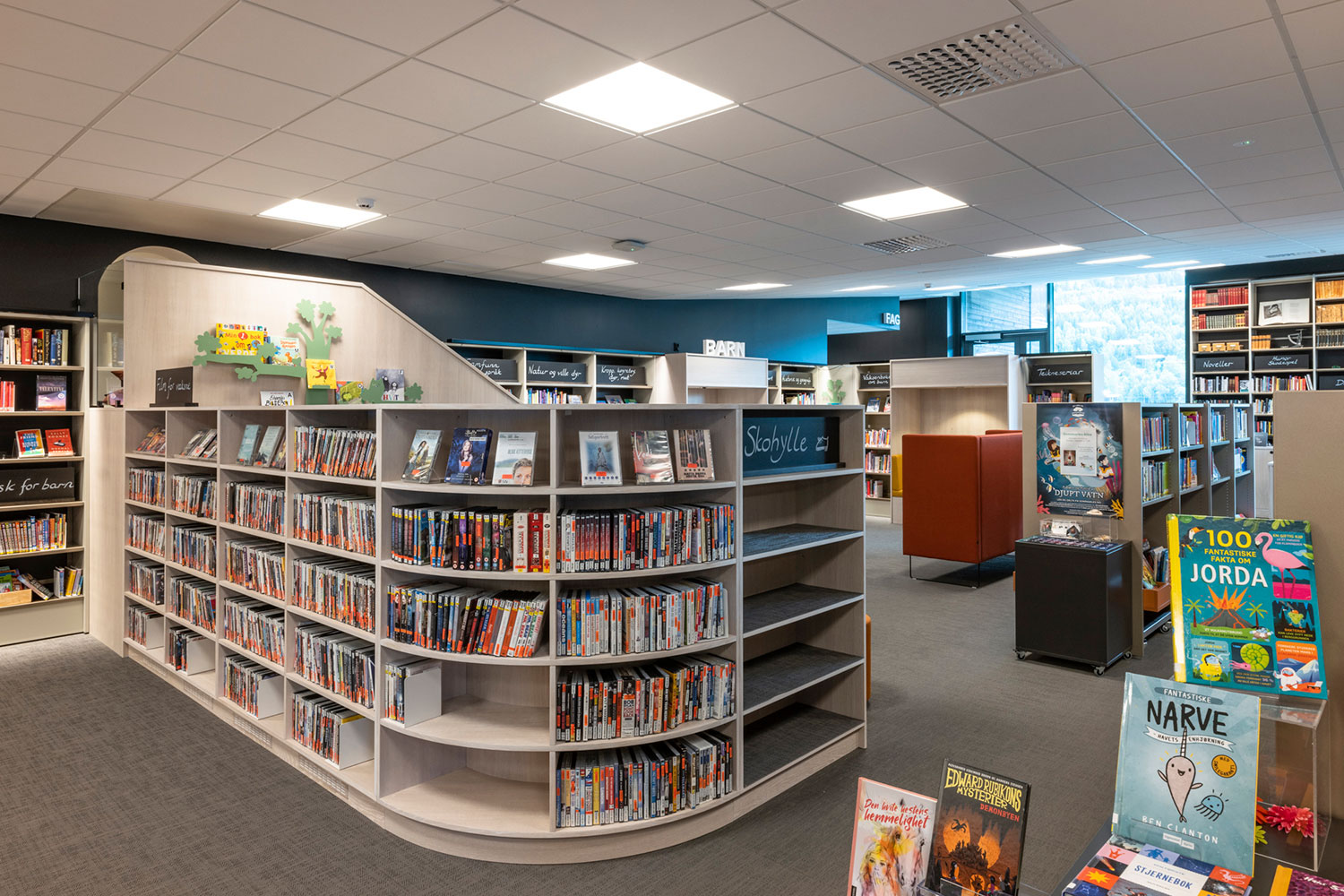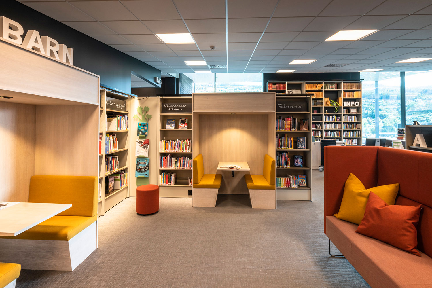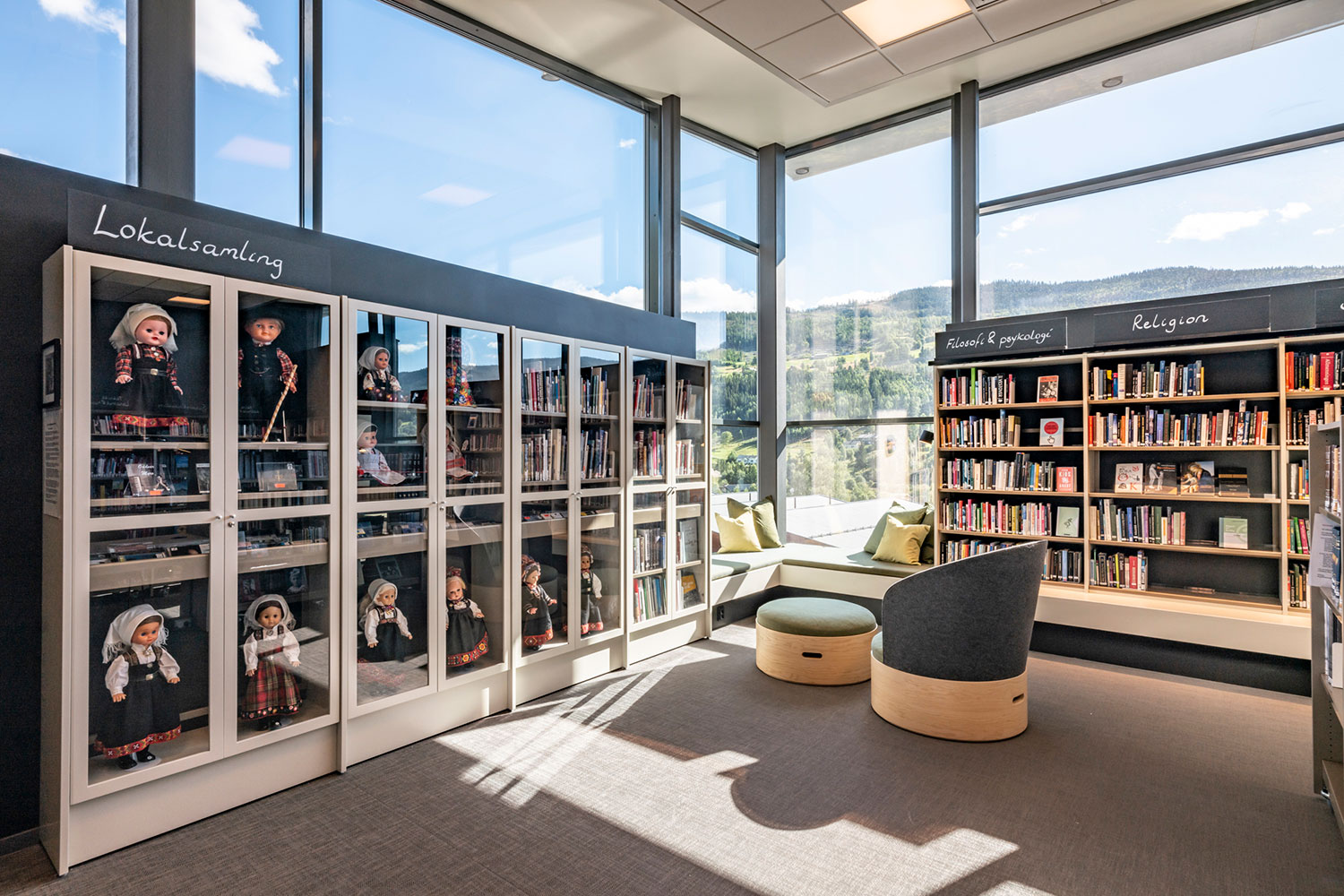Ål library has an amazing location on top of the new extension of Ål Culture House. The design of the library emphasizes the space, lighting and flexible, mobile furniture. The flexible interior design means that the premises can easily be adapted to the seasons, events and activities, and the colours used are inspired by the local rose painting tradition.