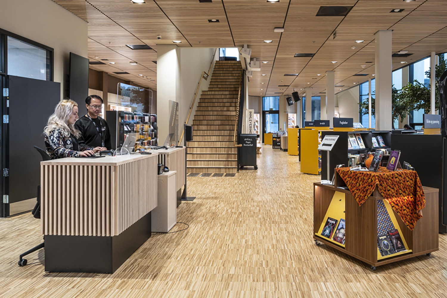 Åsane library is a combined school and public library with sections for children, young people and adults spread over 800 m2 over two levels. The school has direct access to the library from the top floor, and a common area also creates a connection to the cultural area and the café.