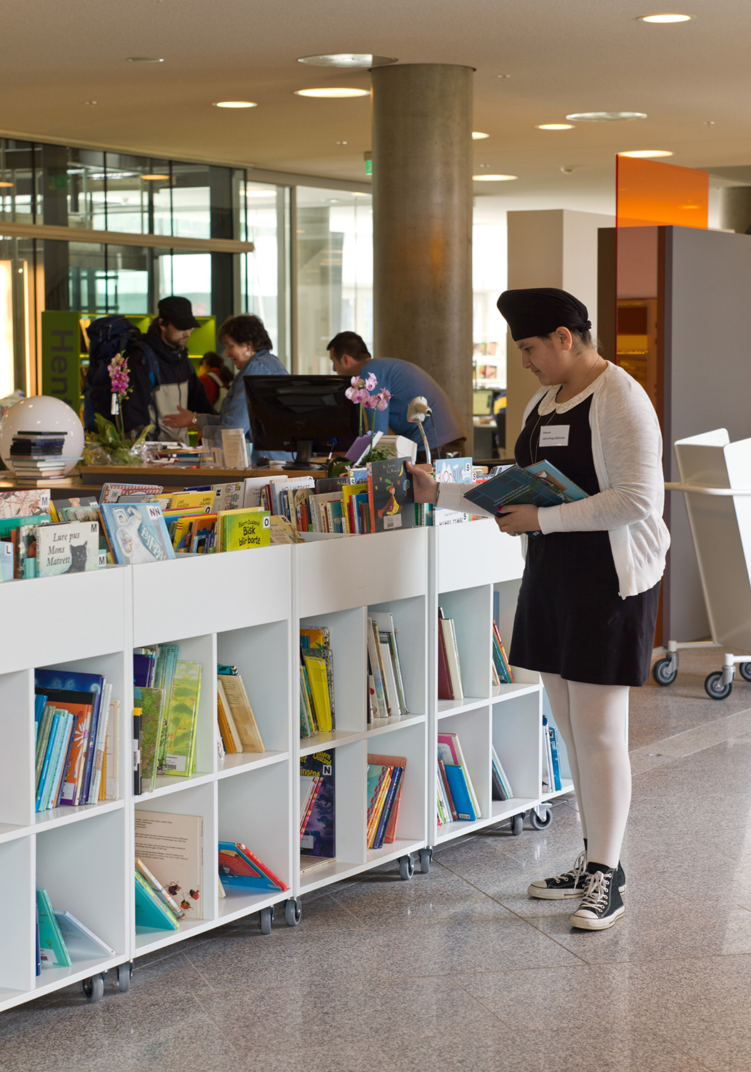 The architects were challenged by the library manager Berit Bjørkild to design her dream shelf. The mission was to design a shelving system with shelves, which could “sell” the books, inspired by the commercial bookstores. Customized shelves, lighting and unique interior solutions should help presenting the cover of the books in an optimal way. The customized shelves tilt slightly backwards, making it possible to display the front of the books without the risk of books falling off.