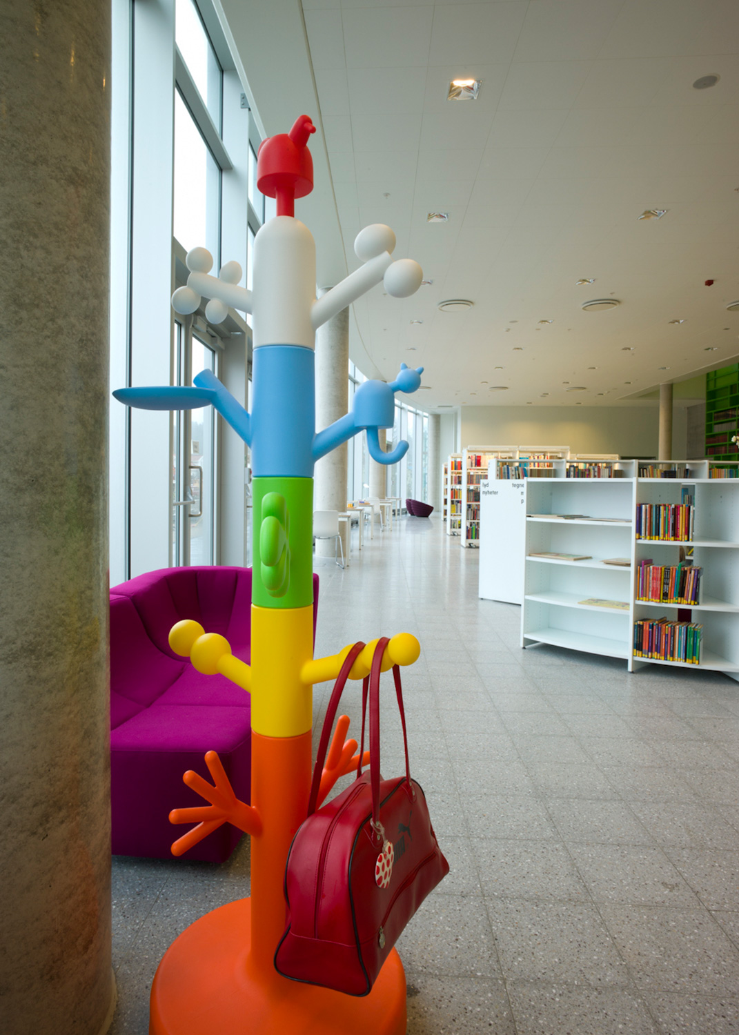 The light and airy library extends over three floors. A specially designed ceiling-to-floor green wall that contrasts brilliantly with the white shelving characterizes the interior. The panorama windows give a spectacular view over the river. Nature and tradition meet development and innovation.