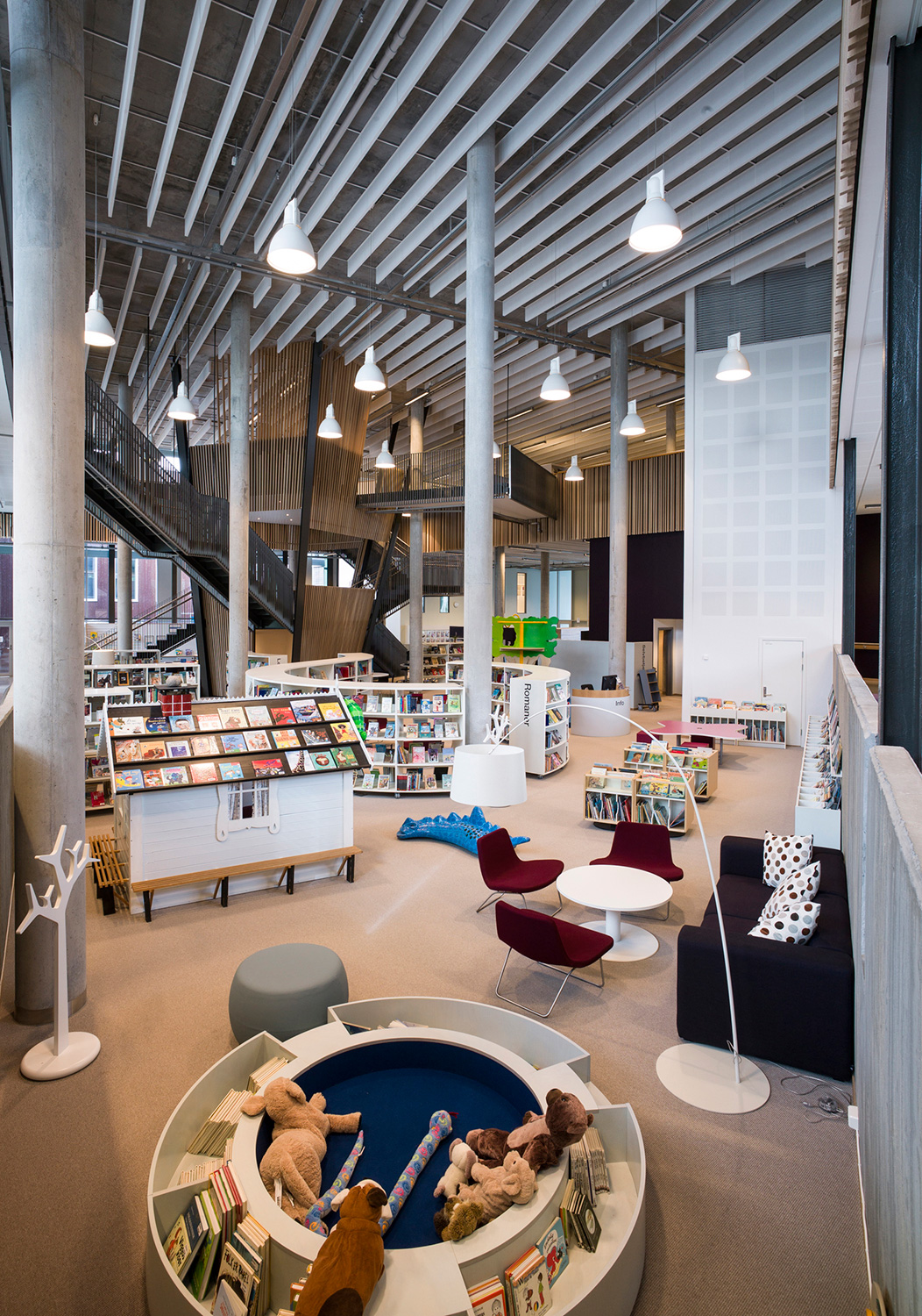 With its organic shapes and soft curves, this is a library distinguished by new thinking. This is not only reflected in the architecture but also in the shelving that follows the organic form. There are plenty of study desks and comfortable seating, information points and self-service stations, making this library a user’s delight.