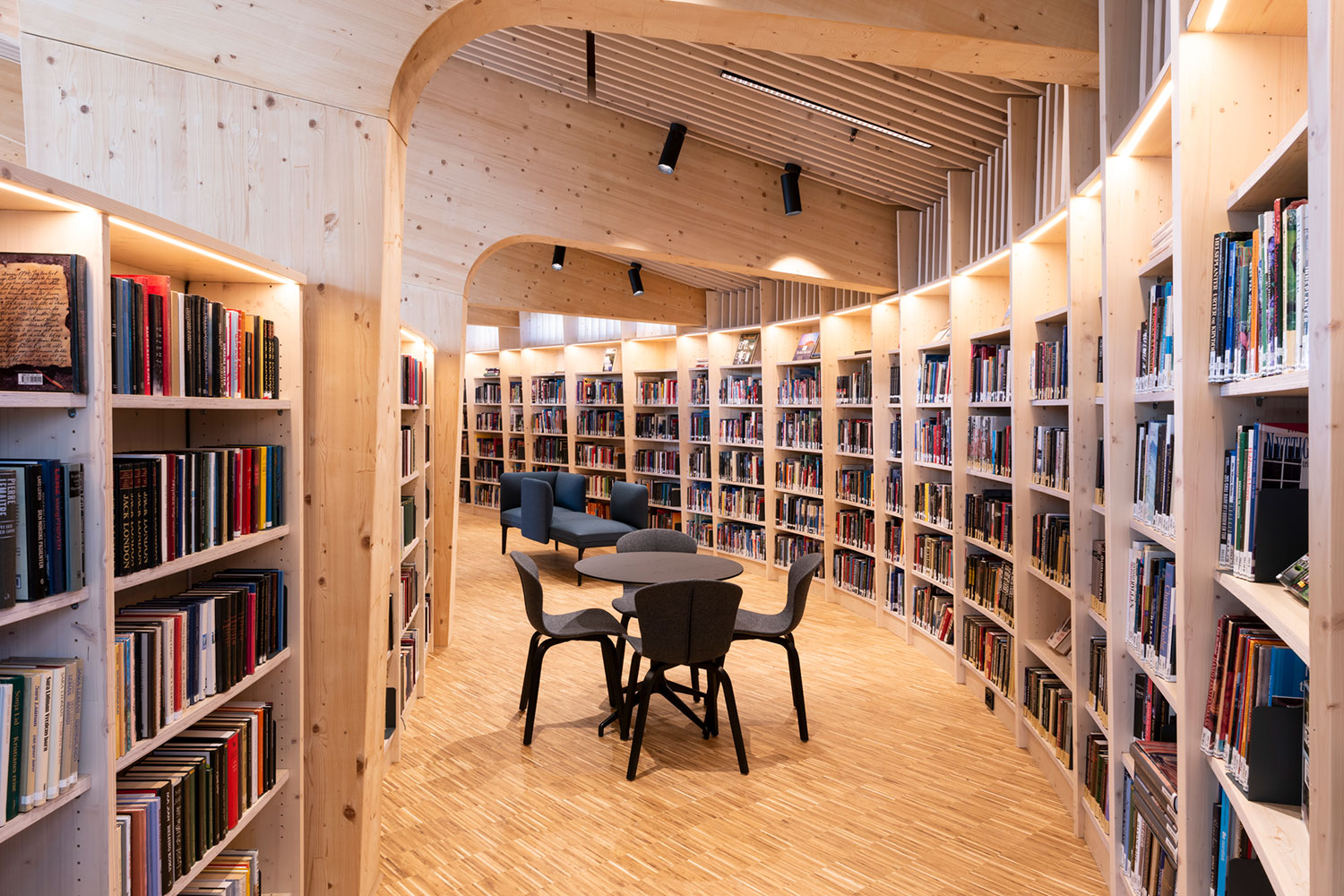 The organically shaped and spectacular building has become a magnet for both literary and architectural enthusiasts. The structure of the building is made of solid wood with an open atrium in the centre.