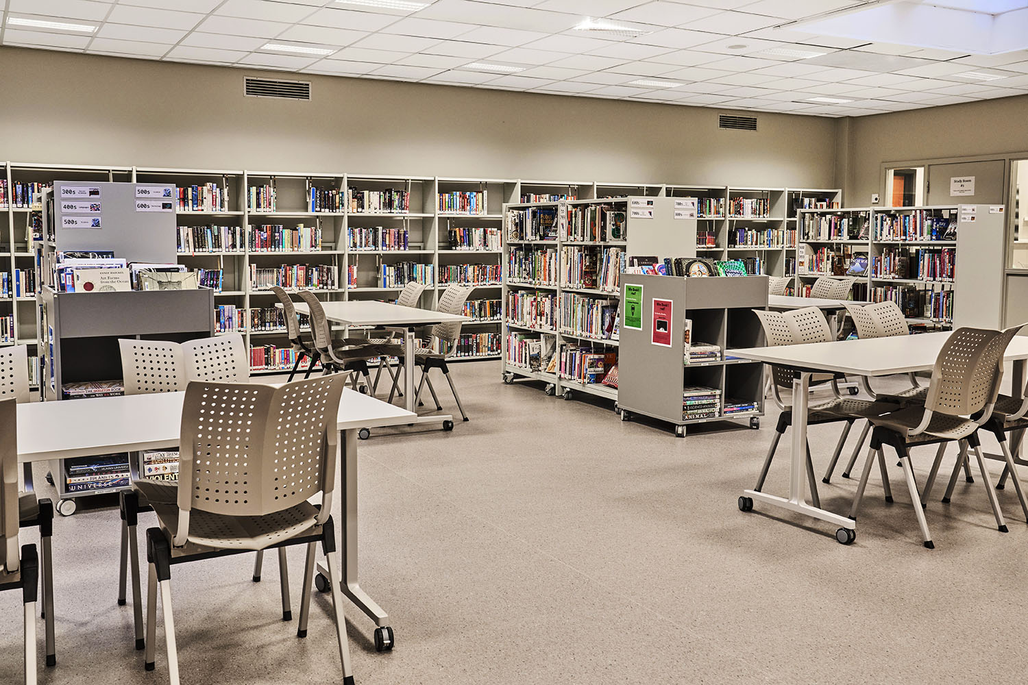 The library is spacious and equipped with many resources that provide opportunities for many different activities. Several of the library furniture have castors, which provide flexibility and can be easily moved when, for example, the floor area needs to be converted into events.