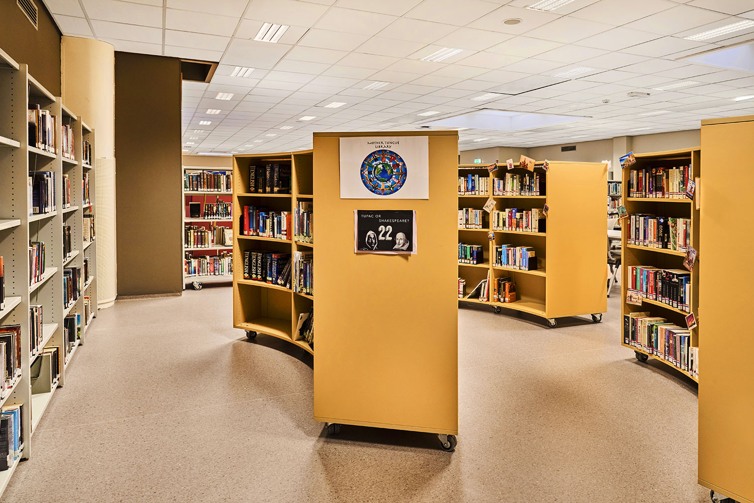 The round shelving systems create small spaces in the library and the sunny yellow color gives warmth and freshness to the room and stands in fine contrast to the neutral colors of the other library furniture.