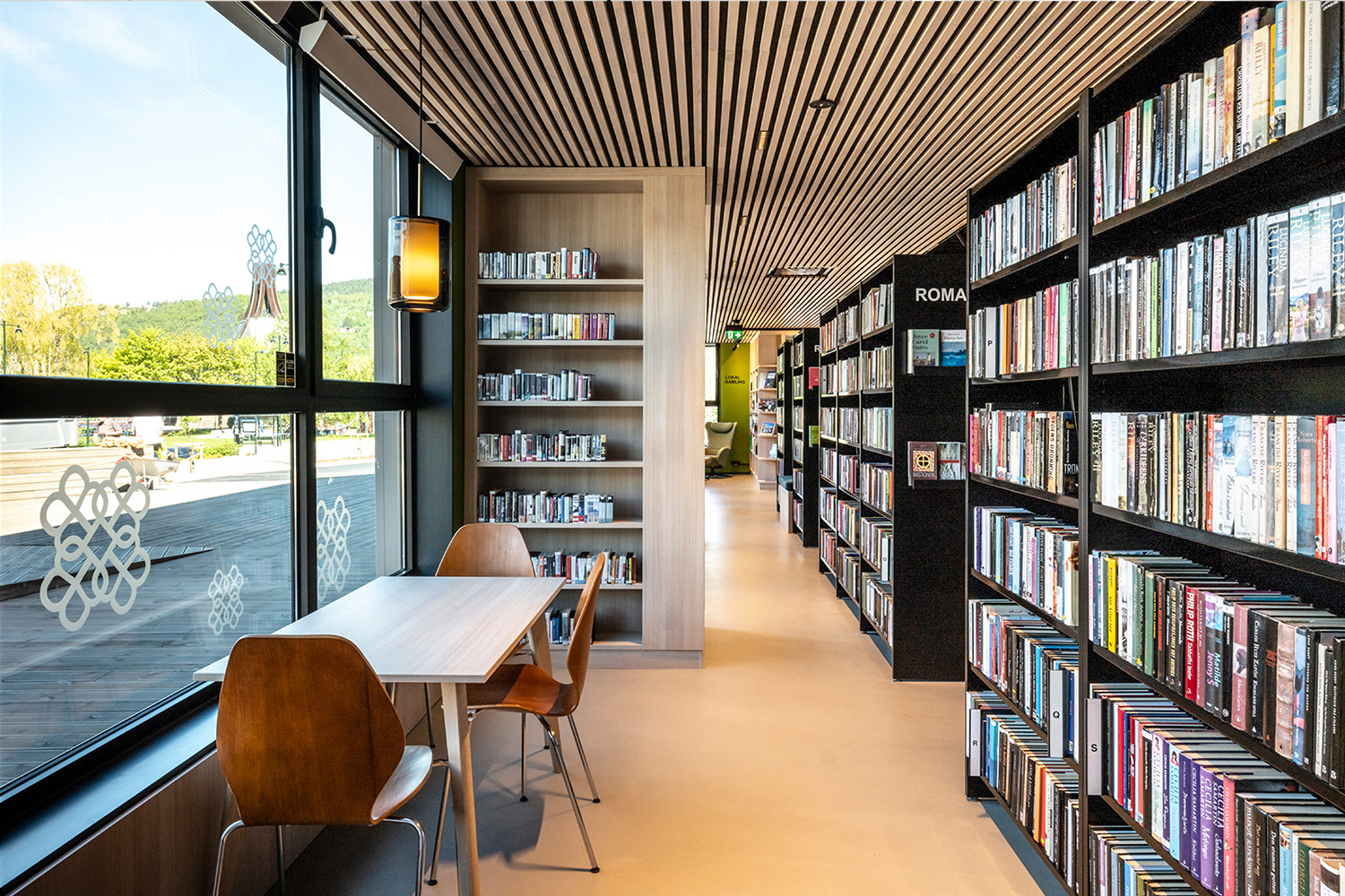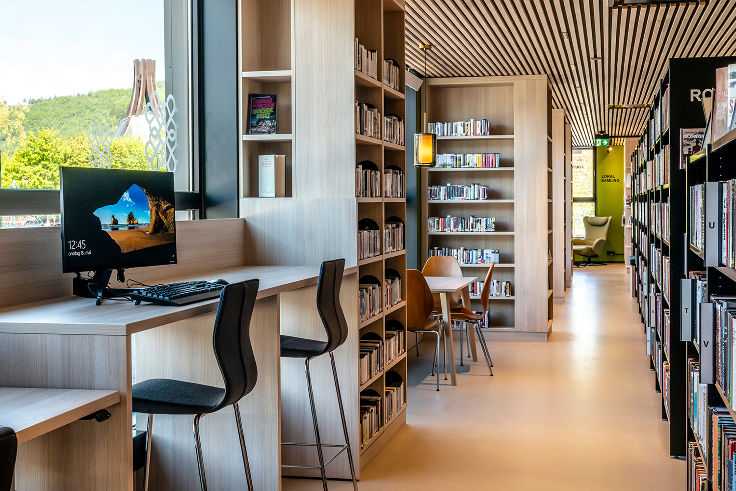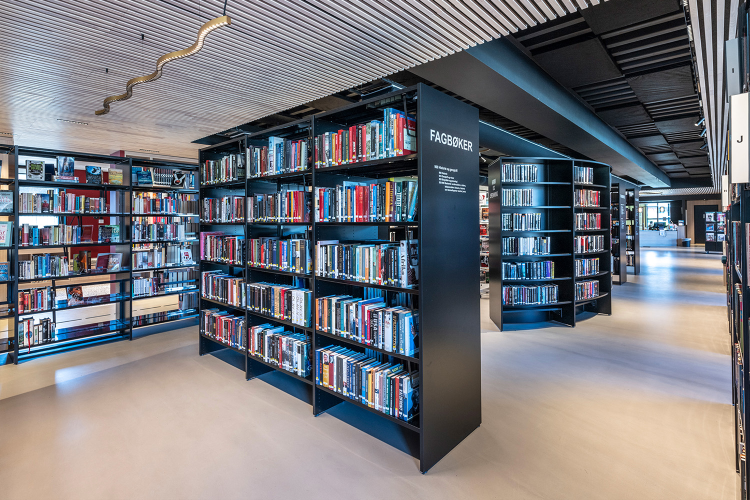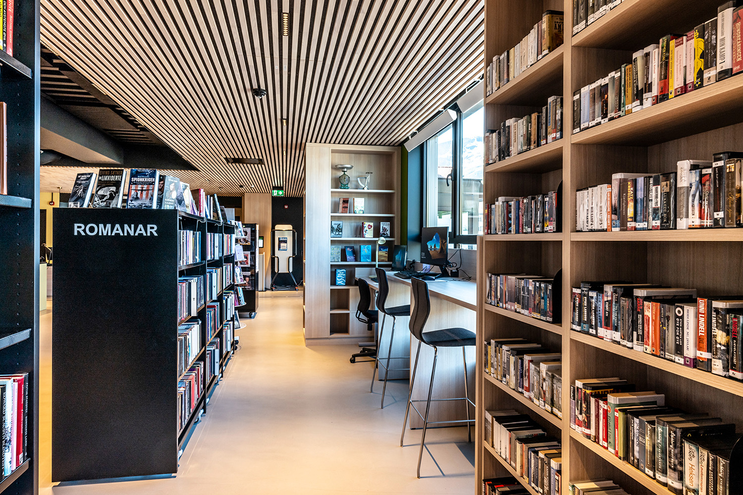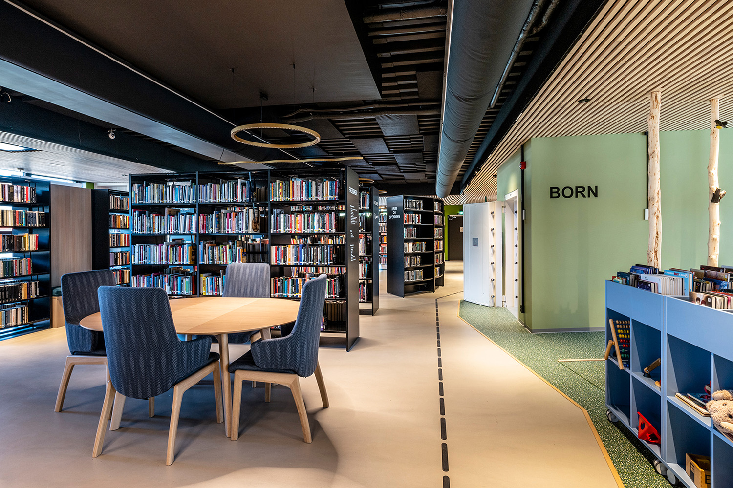 The black shelves in the centre of the room were supplied by BS Eurobib, but to make use of the high ceiling, all the light-colored shelves along the walls were custom designed. The library has become a popular spot to sit with friends, play games, read newspapers, study and more. Additionally, the library has extended its opening hours, making it possible to visit on weekends as well.