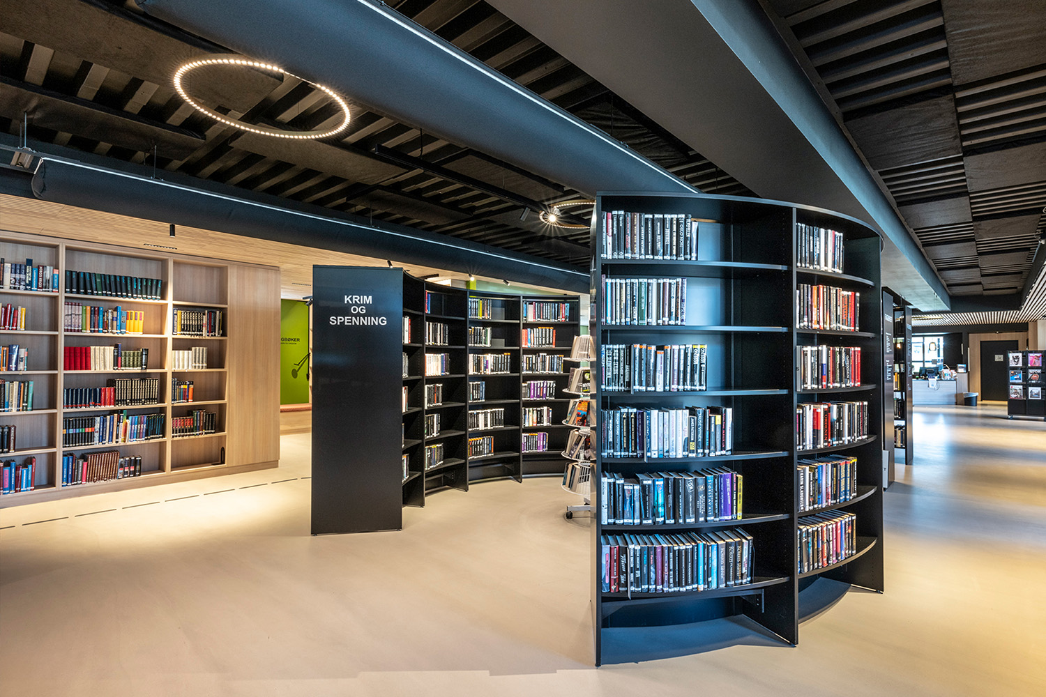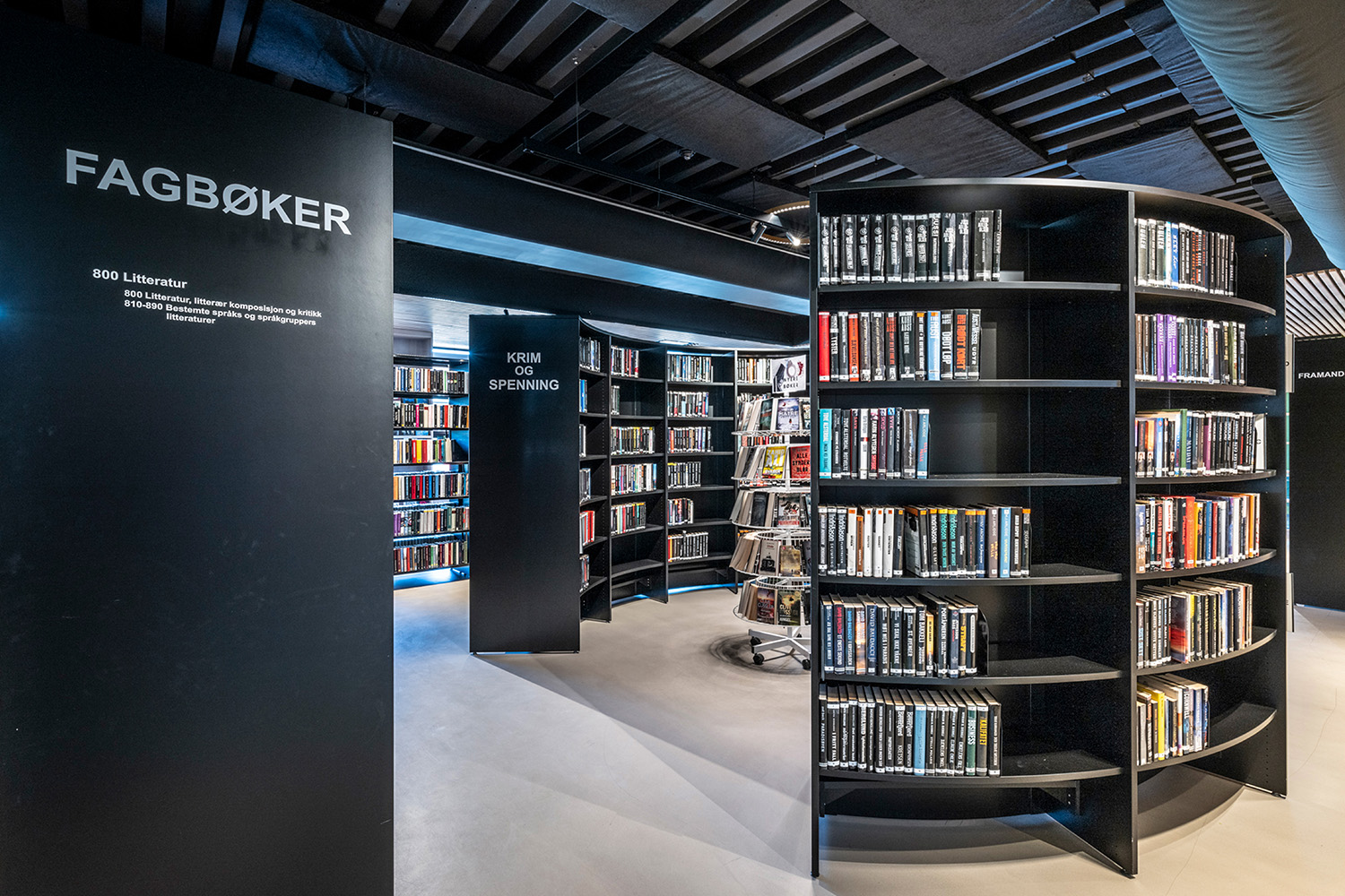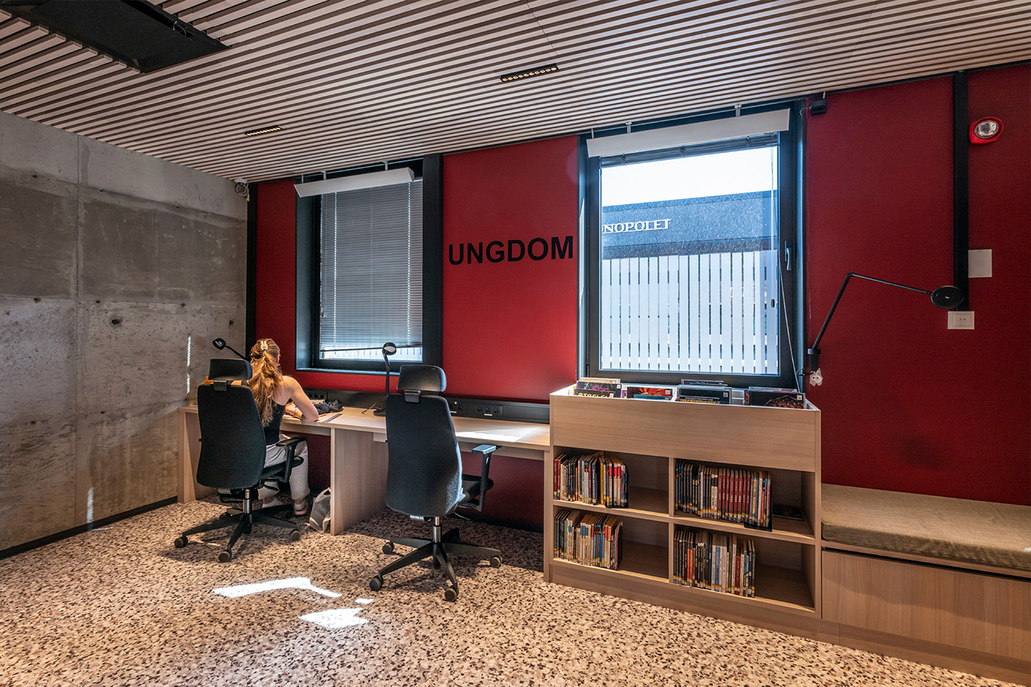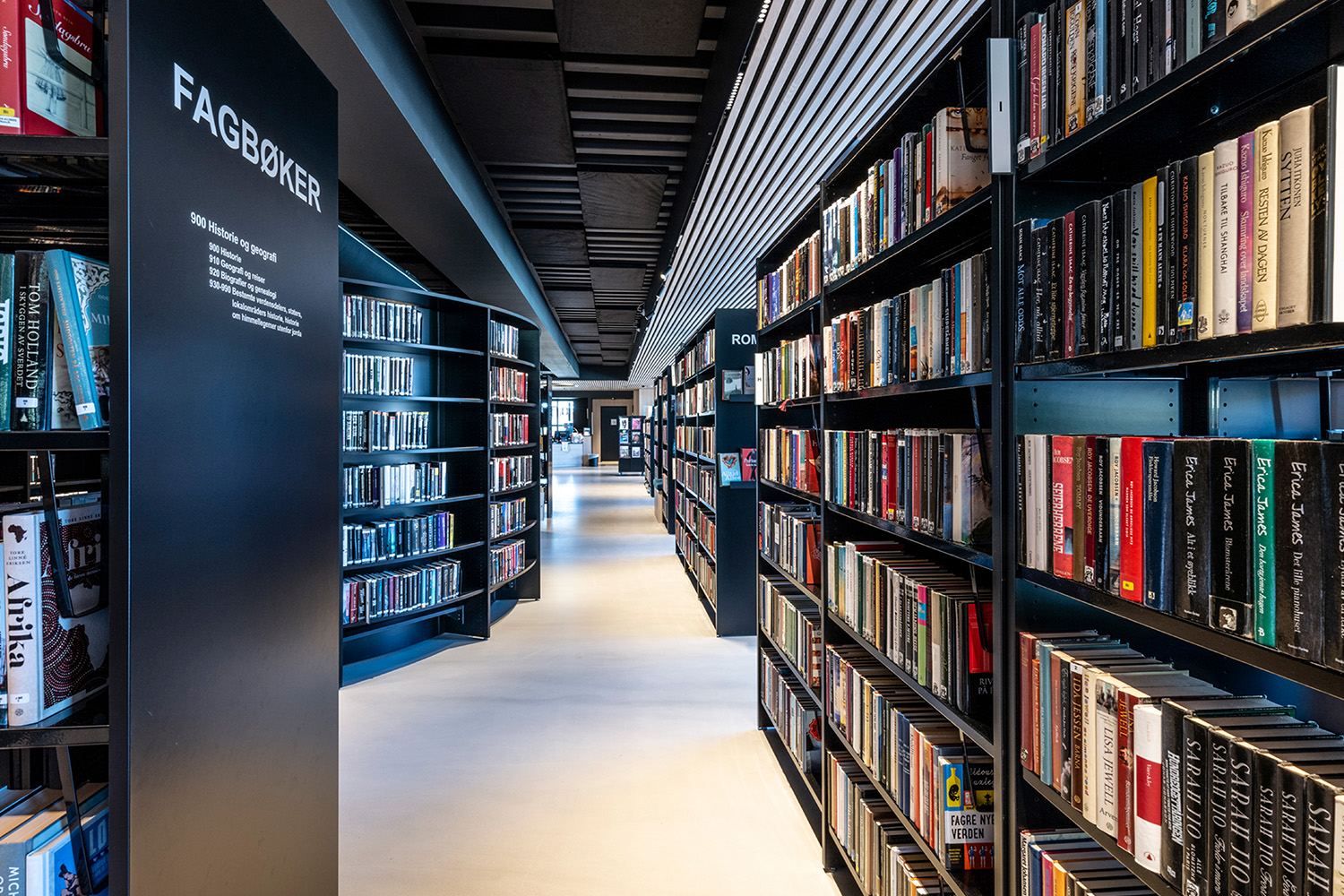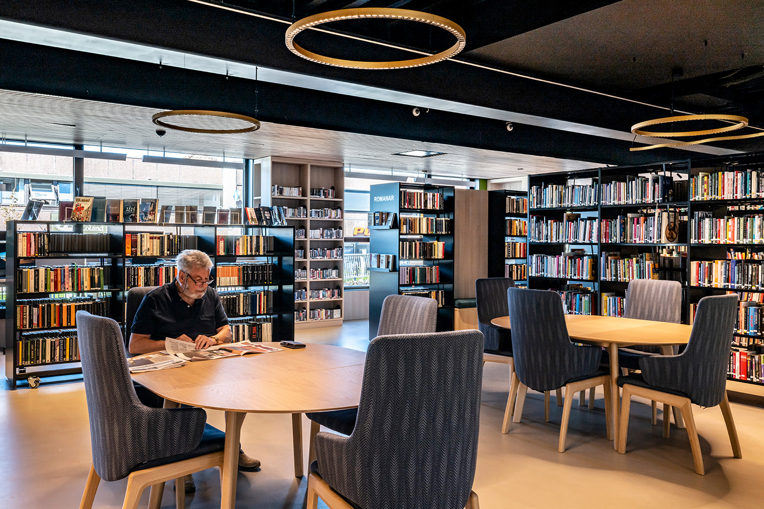The black shelves in the centre of the room were supplied by BS Eurobib, but to make use of the high ceiling, all the light-colored shelves along the walls were custom designed. The library has become a popular spot to sit with friends, play games, read newspapers, study and more. Additionally, the library has extended its opening hours, making it possible to visit on weekends as well.