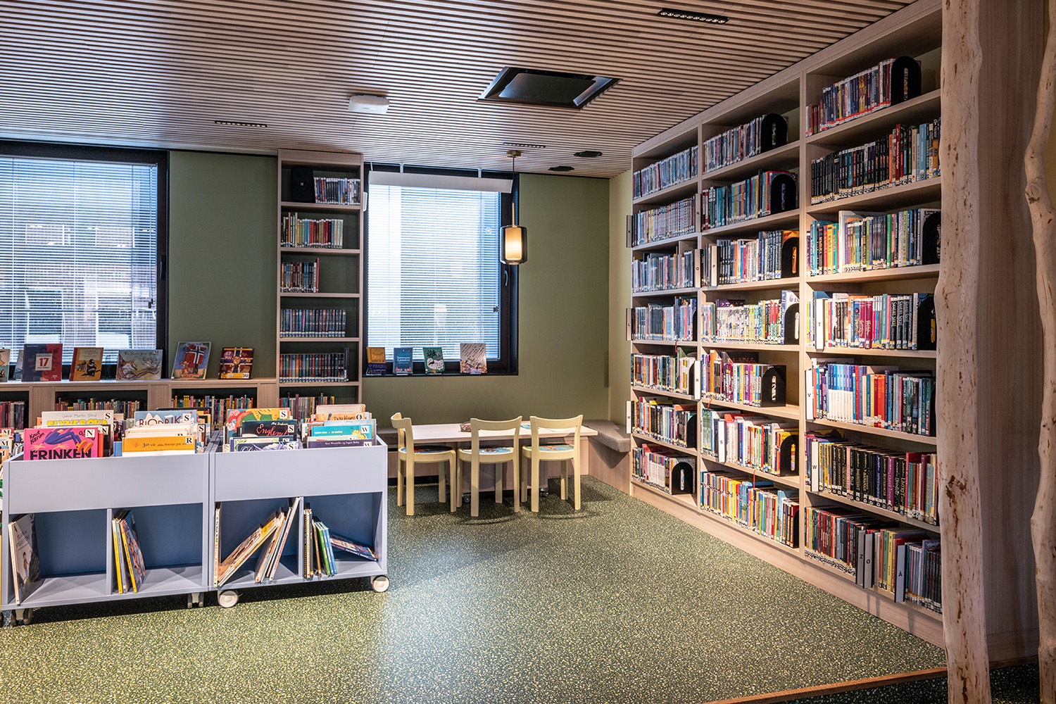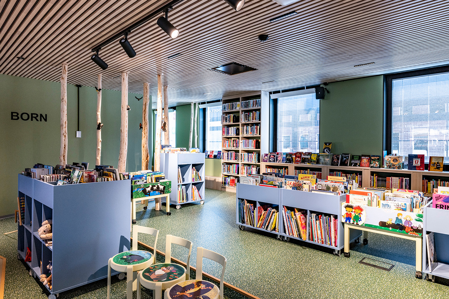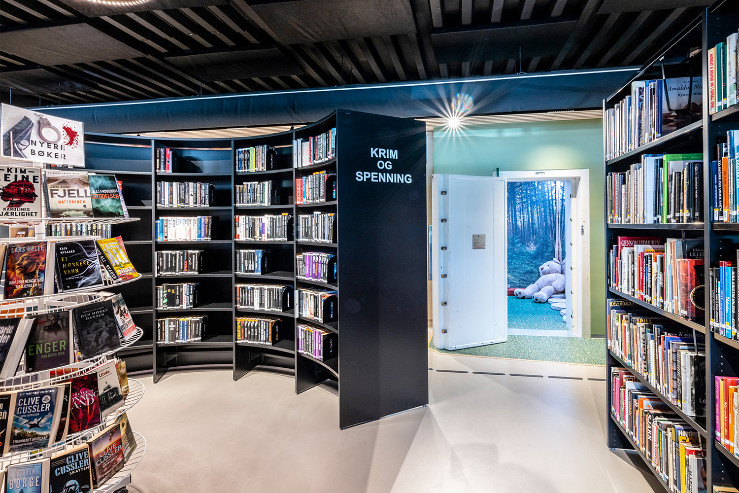 The Norwegian design team at BS Eurobib preserved the old bank vault to retain a piece of the building's history. It has now become a cozy reading room for children and has maintained a forest theme that is part of the rest of the children's section.