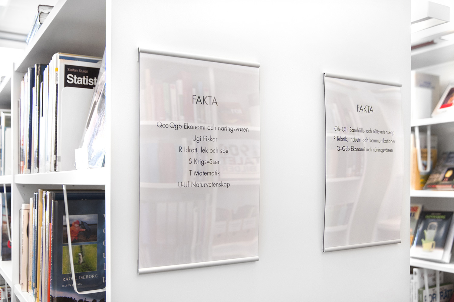 To make it easy for visitors to find what they are looking for, the library strives for using signage and marking by use of colours and symbols. End panels and pillars are already used for signage and clear texts show where to find what.