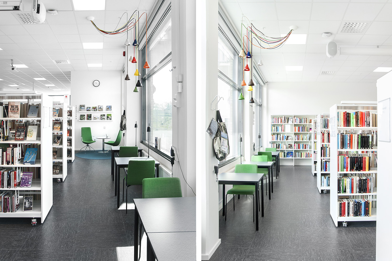 The library is equipped with white Frontline shelving system supplied with different functions such as magazine storage and display shelves. The shelving system is placed so that it is accessible no matter where in the room you are.