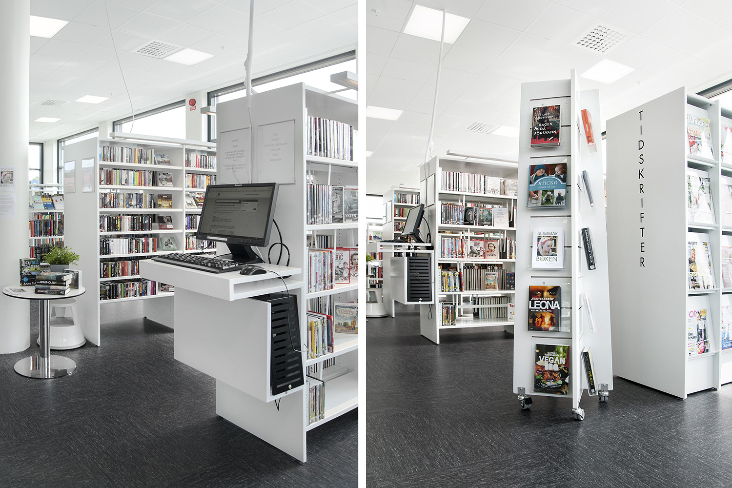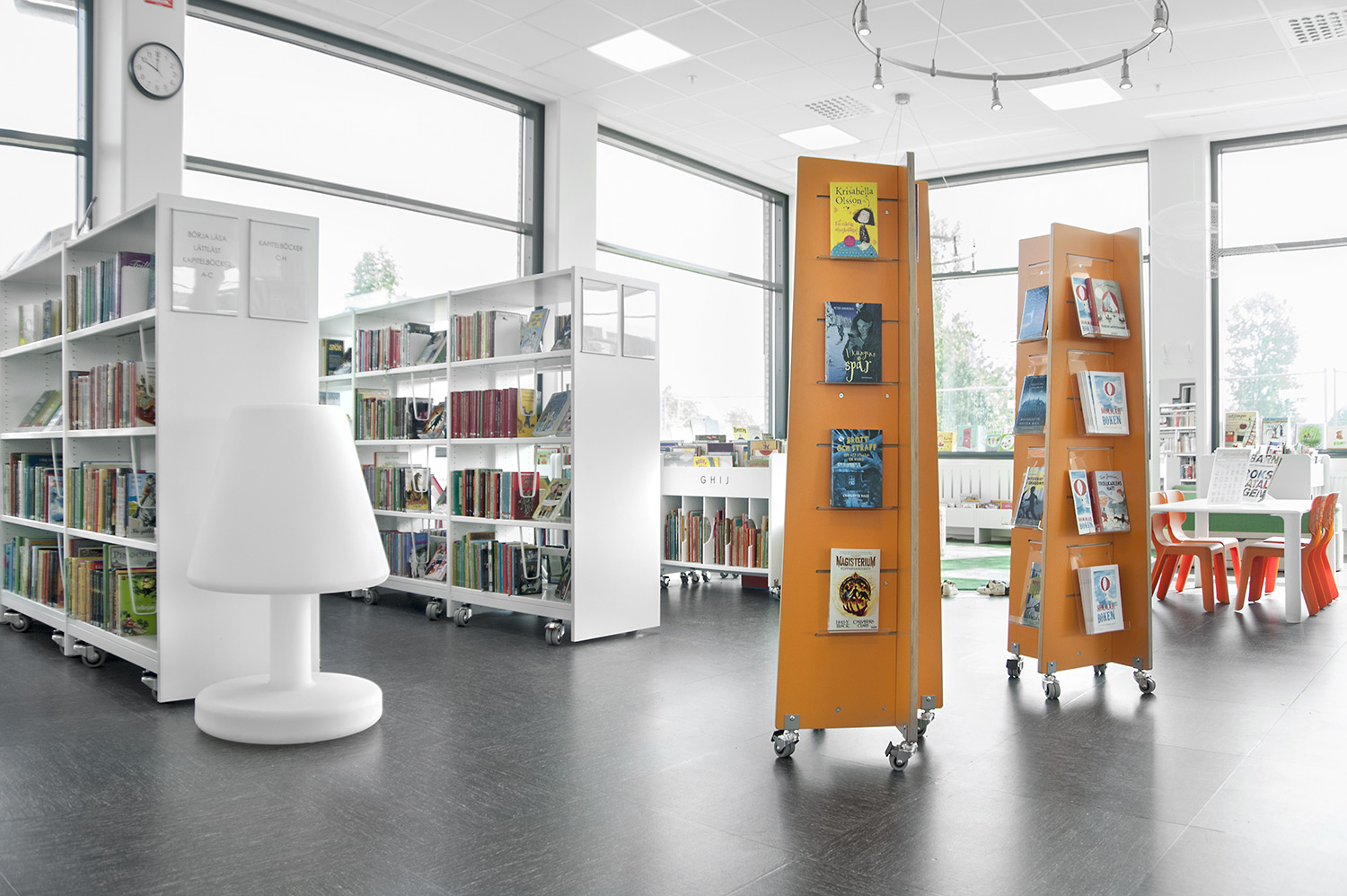 The library in Bara with an area of 400 m2 opened in autumn 2015 in new premises. From the beginning of the process the library was planned to become an unmanned open library and that turned out to be a great advantage for the planning and building process. Together with the library employees, Lammhults Biblioteksdesign designed interior solutions which the municipiality used as a base for the decision making.