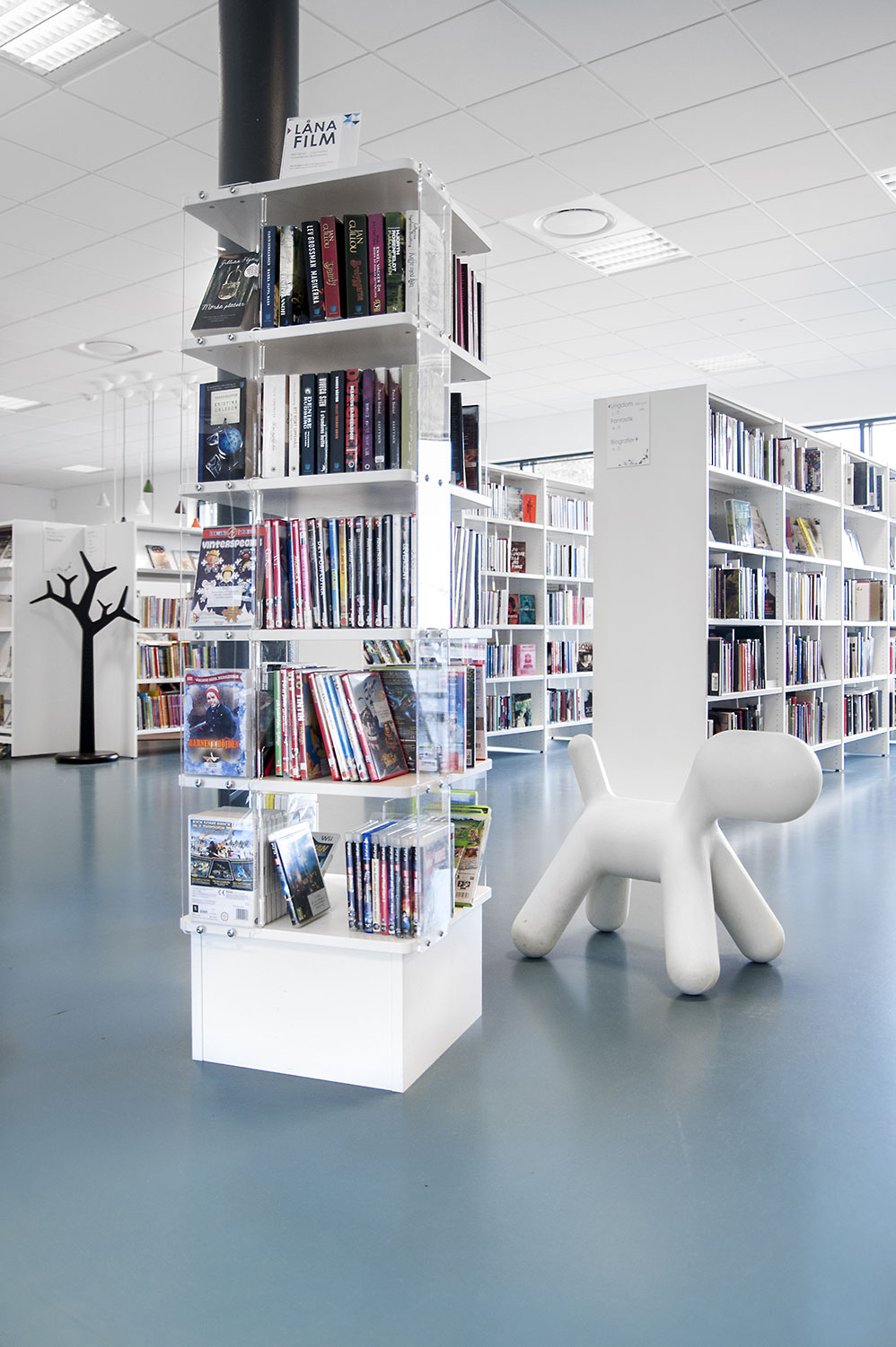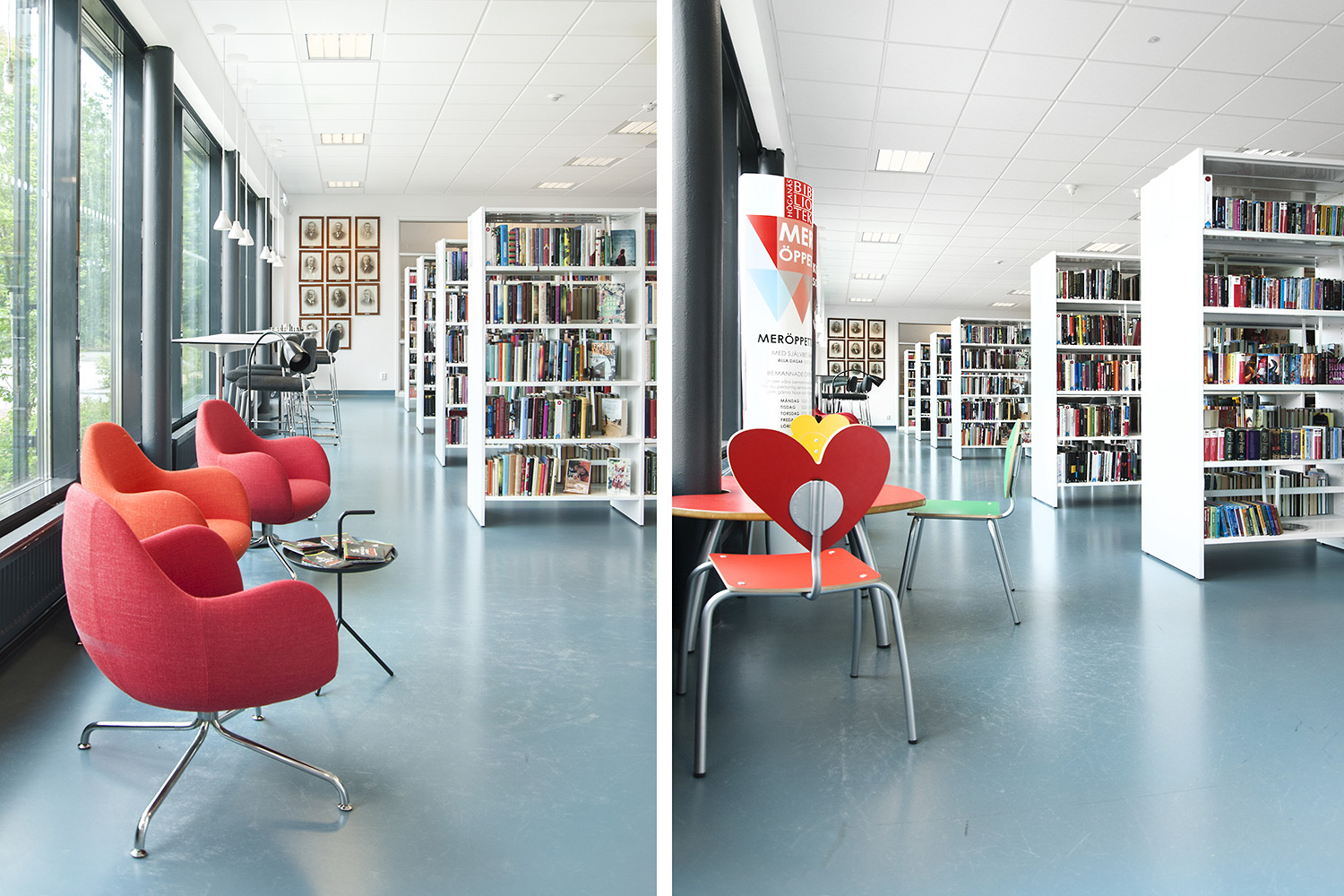 Throughout the library Frontline shelving system is used; magazines are displayed and stored in Ordrup magazine display cabinet and the Concertina counter is the central information point of the library.