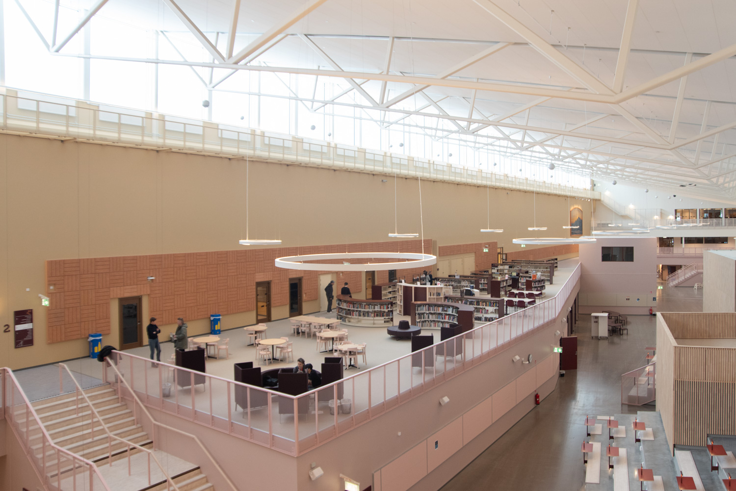 The core of the building is a central square that forms a link between the city of knowledge and the rest of the city centre. From here, the visitor is led into a spacious atrium, where the activities of the city and the school meet in a common and public space. The library is also located here, where a generous amount of daylight comes from large glass sections near the roof, which invite visitors to look up at the sky and follow the different characteristics of the seasons.