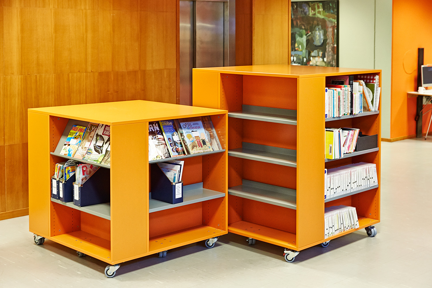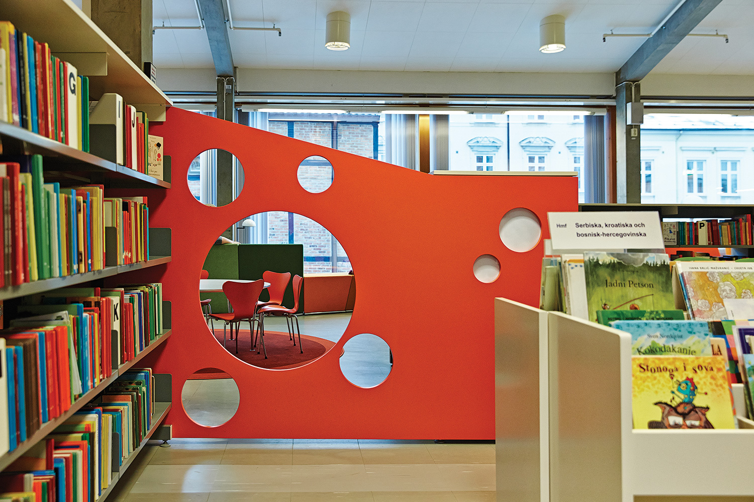The main library in Lund has been in the same building since the 1970s. Over the years it has been gradually renovated and modernized. Finally it was the children’s department’s turn and our own interior designer carried out the colourful refurbishment. The area is divided into two sections: one for the younger children and one for adolescents. These different areas have been created by use of colour, carpets and colourful walls between the shelving.