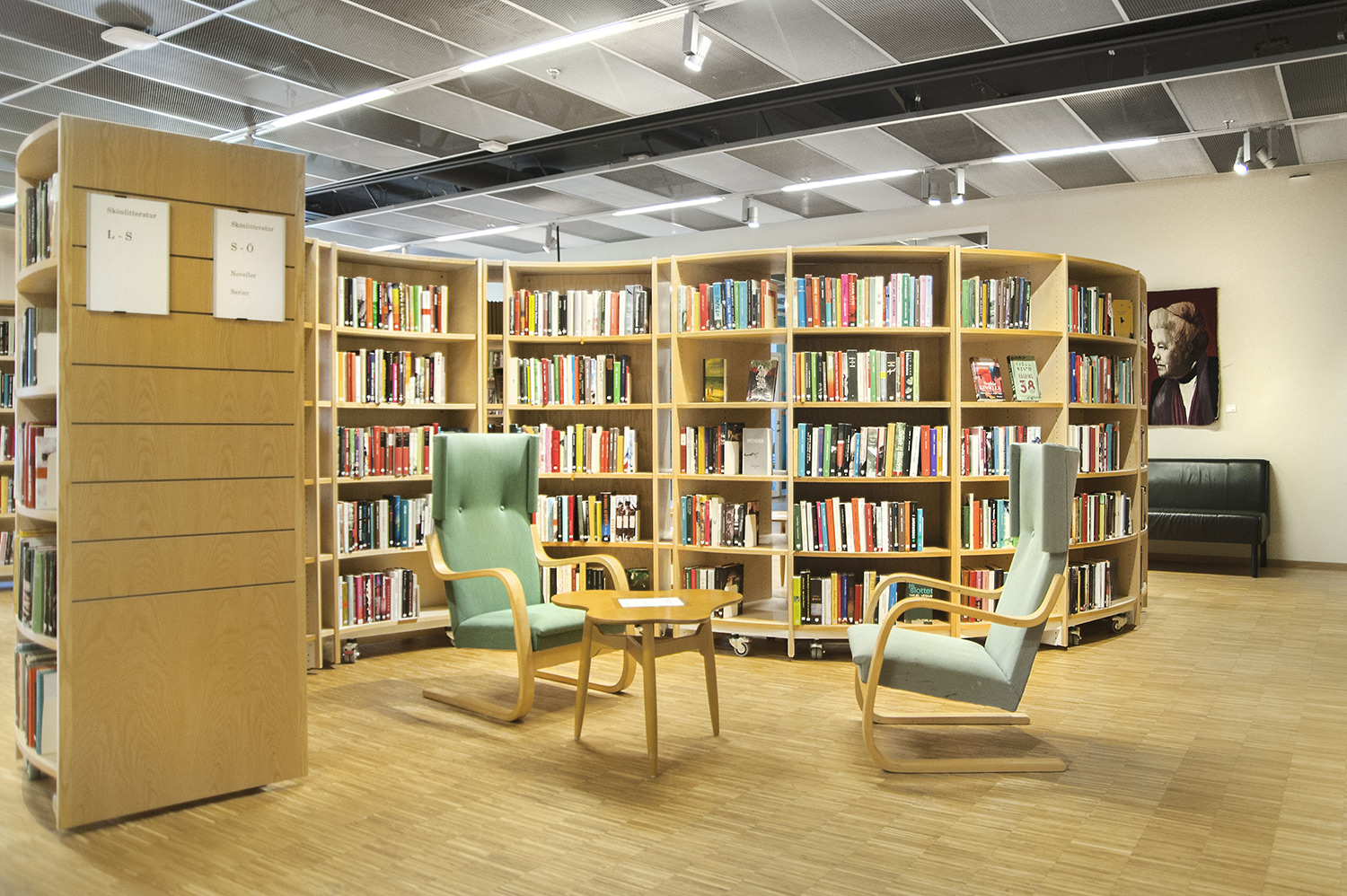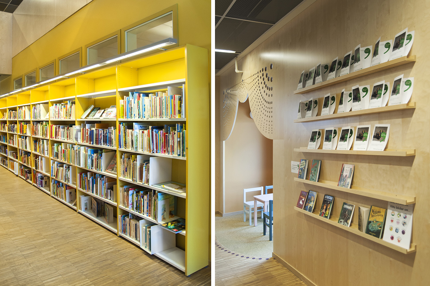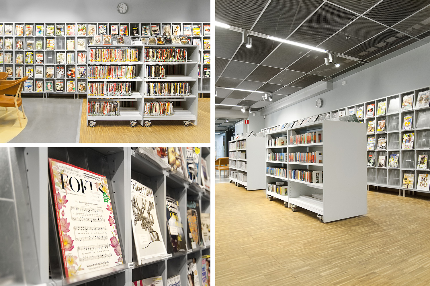 Throughout the library a combination of Frontline and the round Slimline shelving systems are used to create different departments. Instead of a overall wooden surface on all shelving systems, the library has chosen three different wood veneers: oak, birch and ash. In the children's/youth department lacquered Linnéa book browsers in differnt heights are used for picture books.