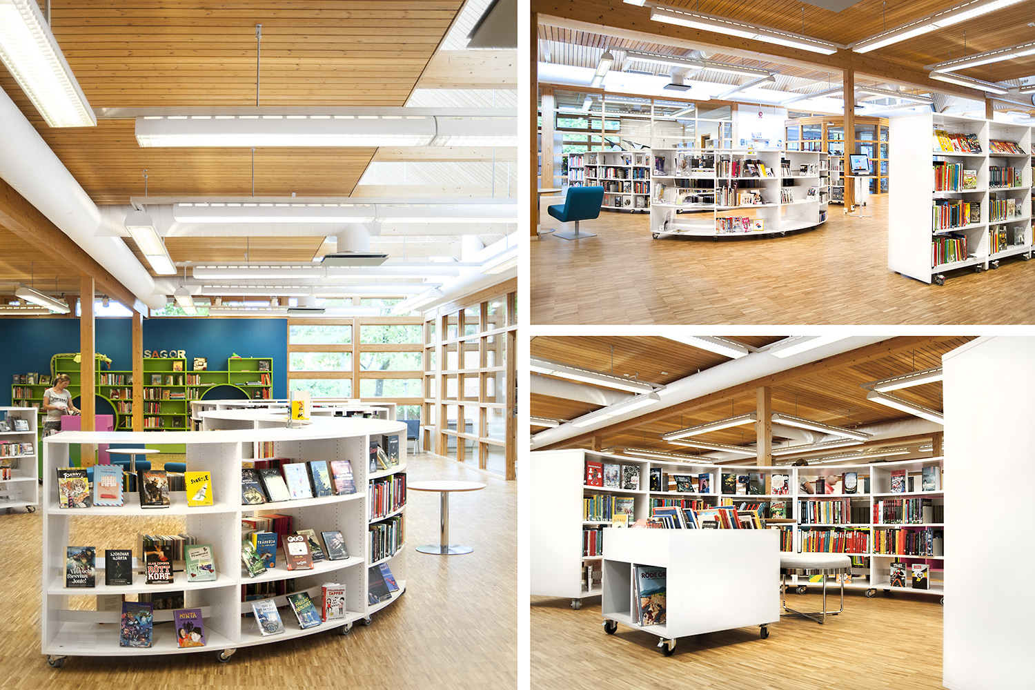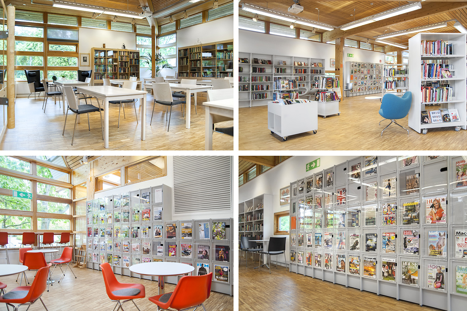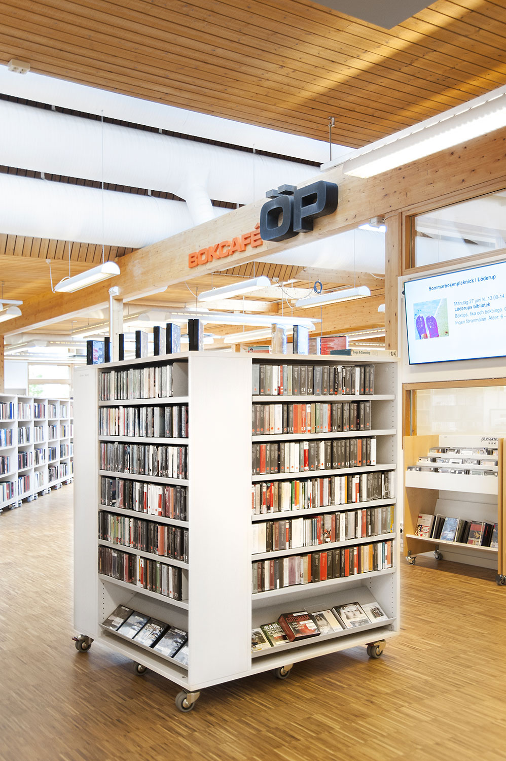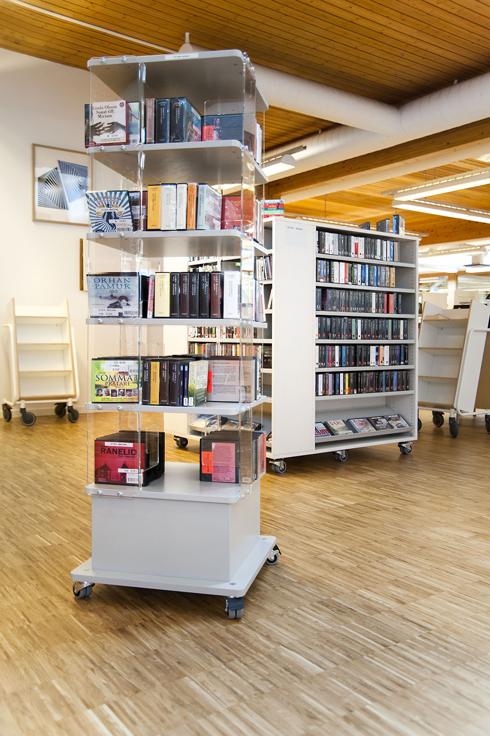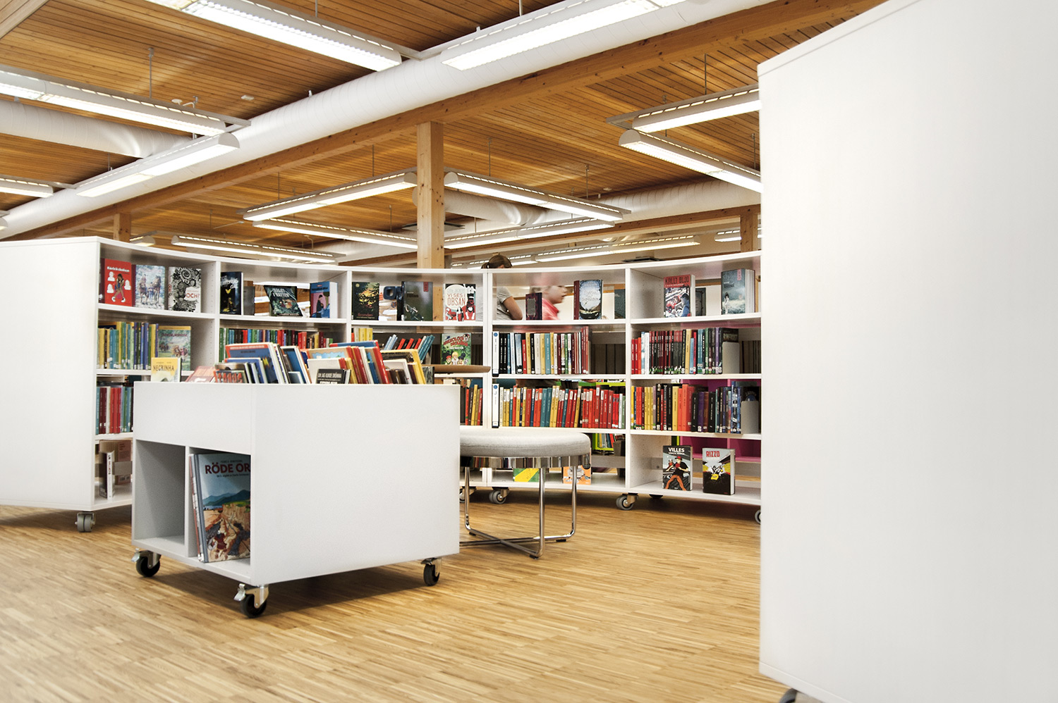 All Frontline shelving systems are mounted with castors for flexibility and can be moved for lectures and cultural events. The Ordrup magazine display cabinet has a perfect spot in the library, its position making its content easily accessible, while Info pods with integrated LED light are placed near the entrance for information and help from the librarians. Book Tower on castors are used for freestanding display of audiobooks.