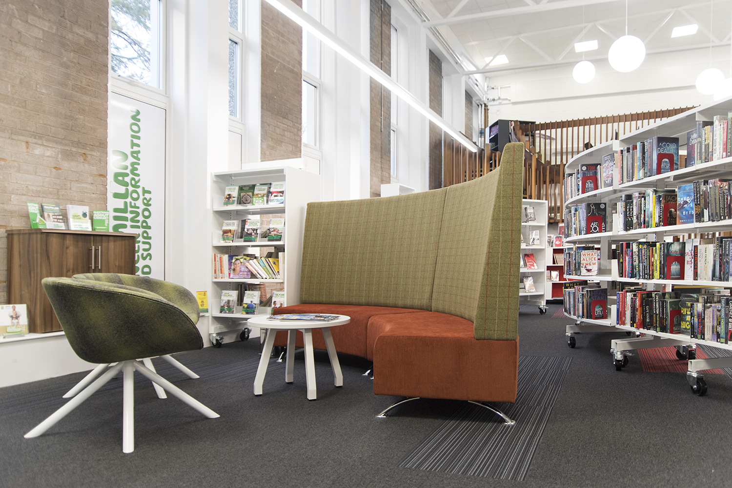 Thedesignconcept were excited to work on a local project and are proud of the finished result. The design includes our 30/60 shelving range on castors for complete flexibility, the children’s area has a statement story-telling chair and character furniture while soft, comfortable seating is available for other users who wish to make themselves comfortable and enjoy their new surroundings.