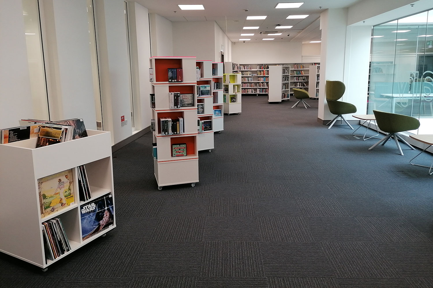 The open plan library, with a glazed panel overlooking the mall below, allowed us to use our creative flare. We installed brightly coloured wall graphics and created a house-like landscape which is striking to passers- by and busy shoppers.