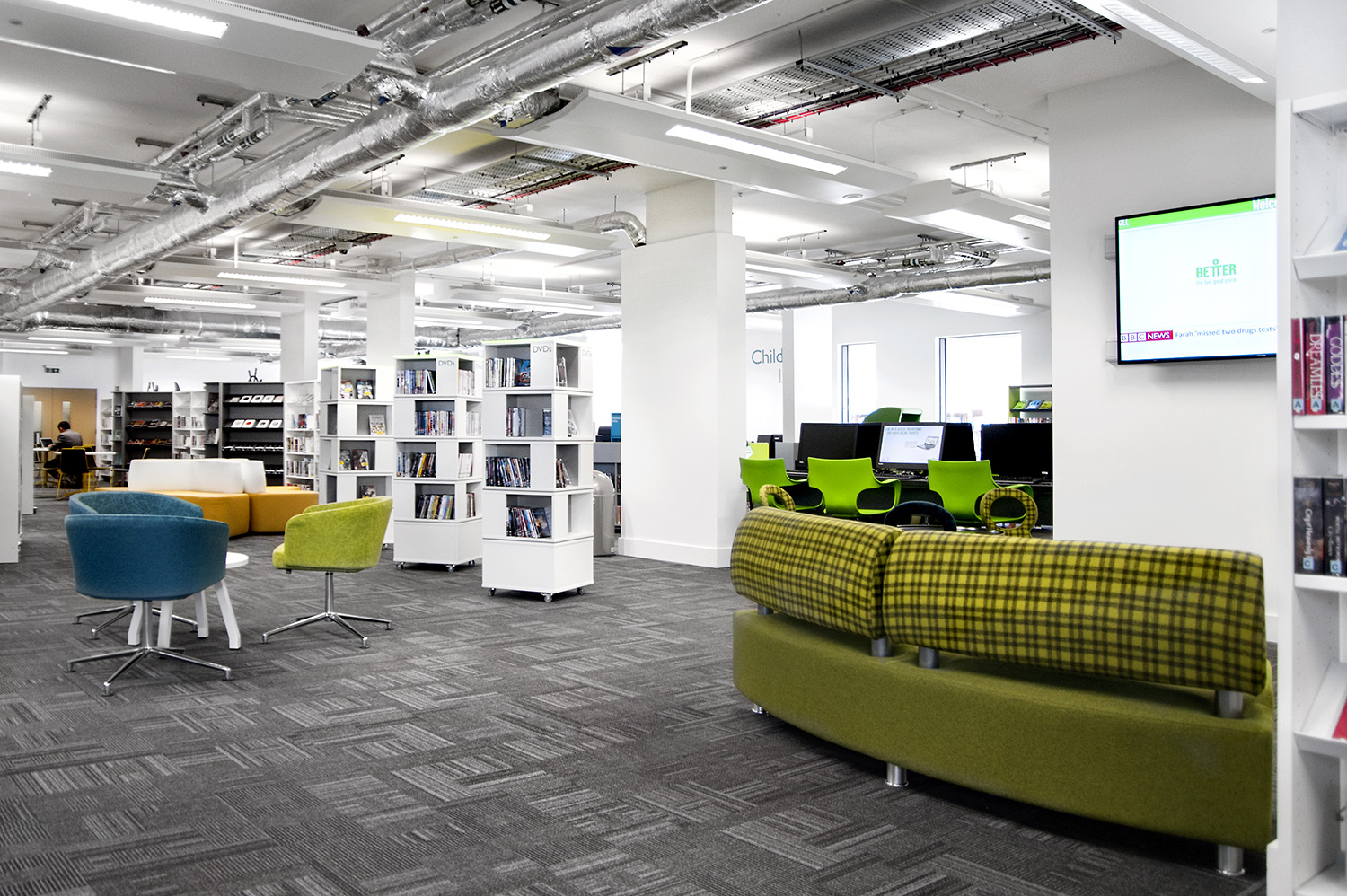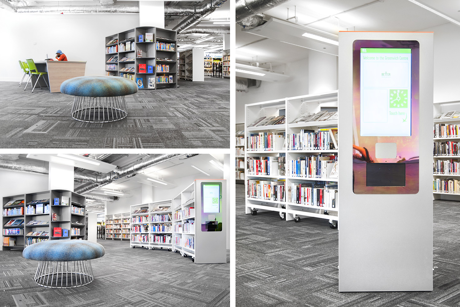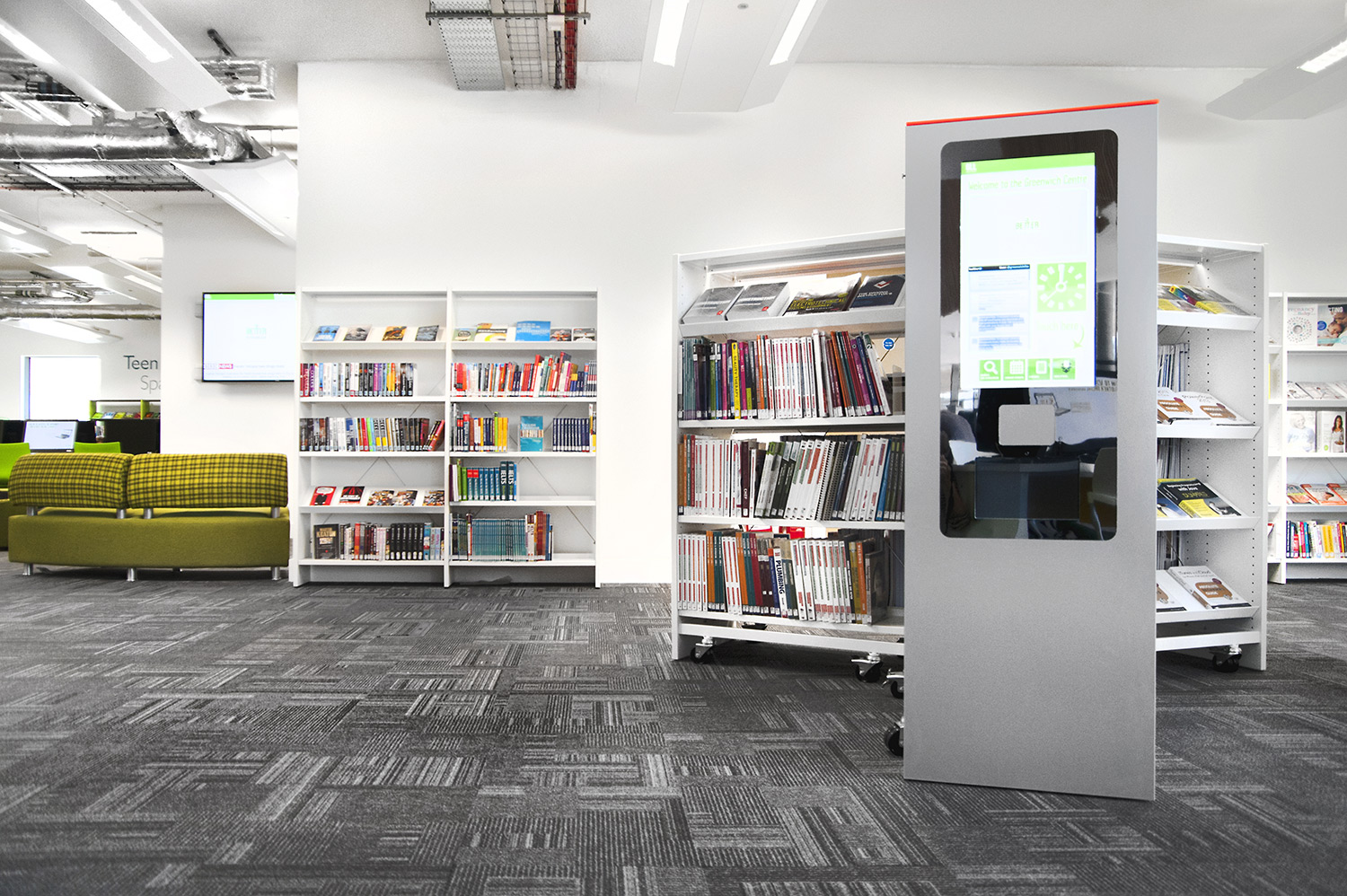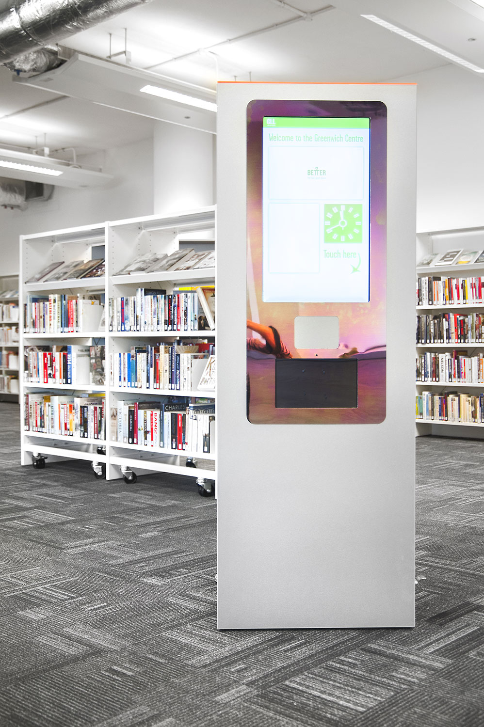 Throughout the library, digital end panels allow customers to browse for specific books and authors as well as giving access to the library’s app which highlights new books and facilities that are available for each customer.