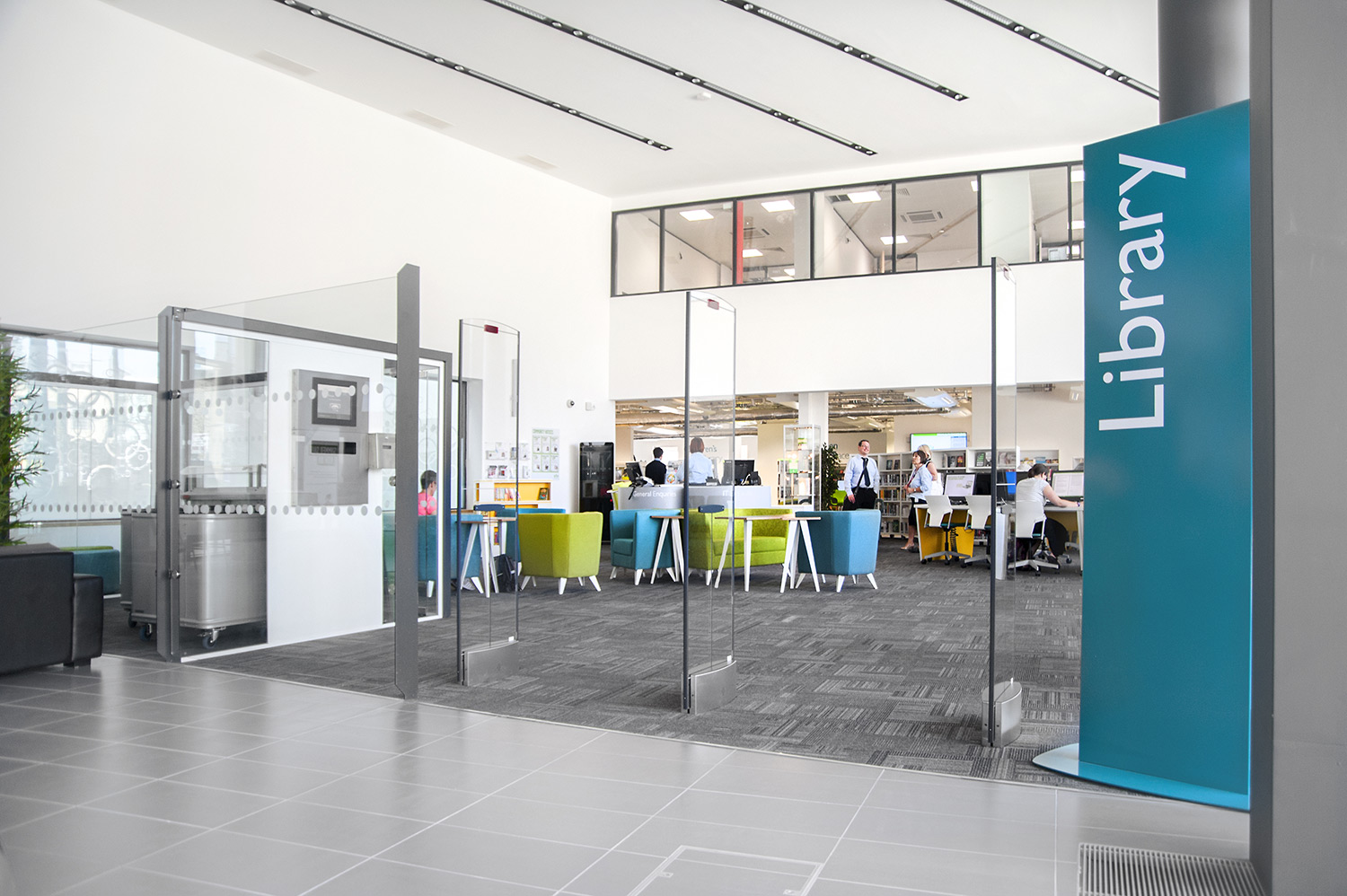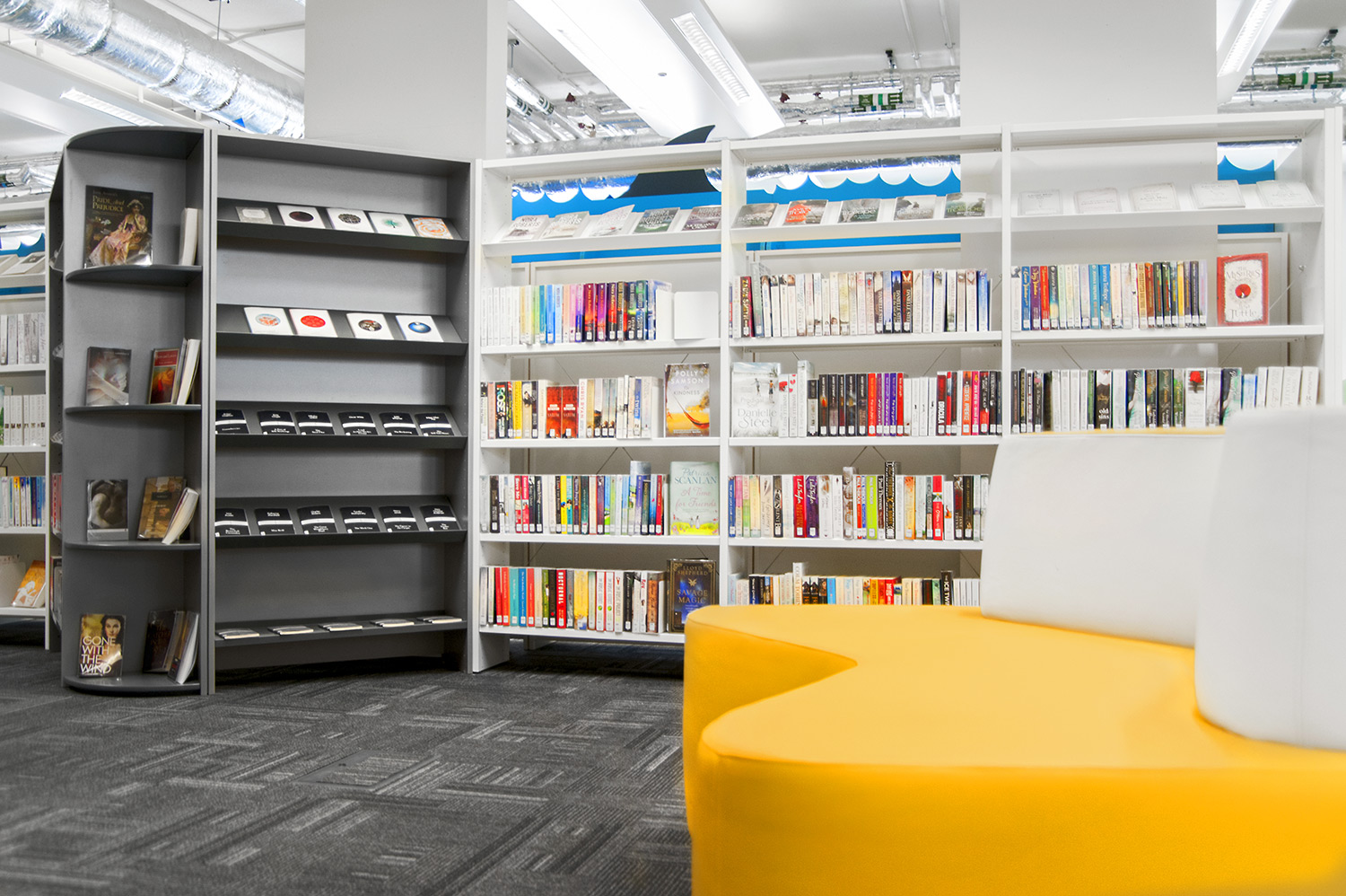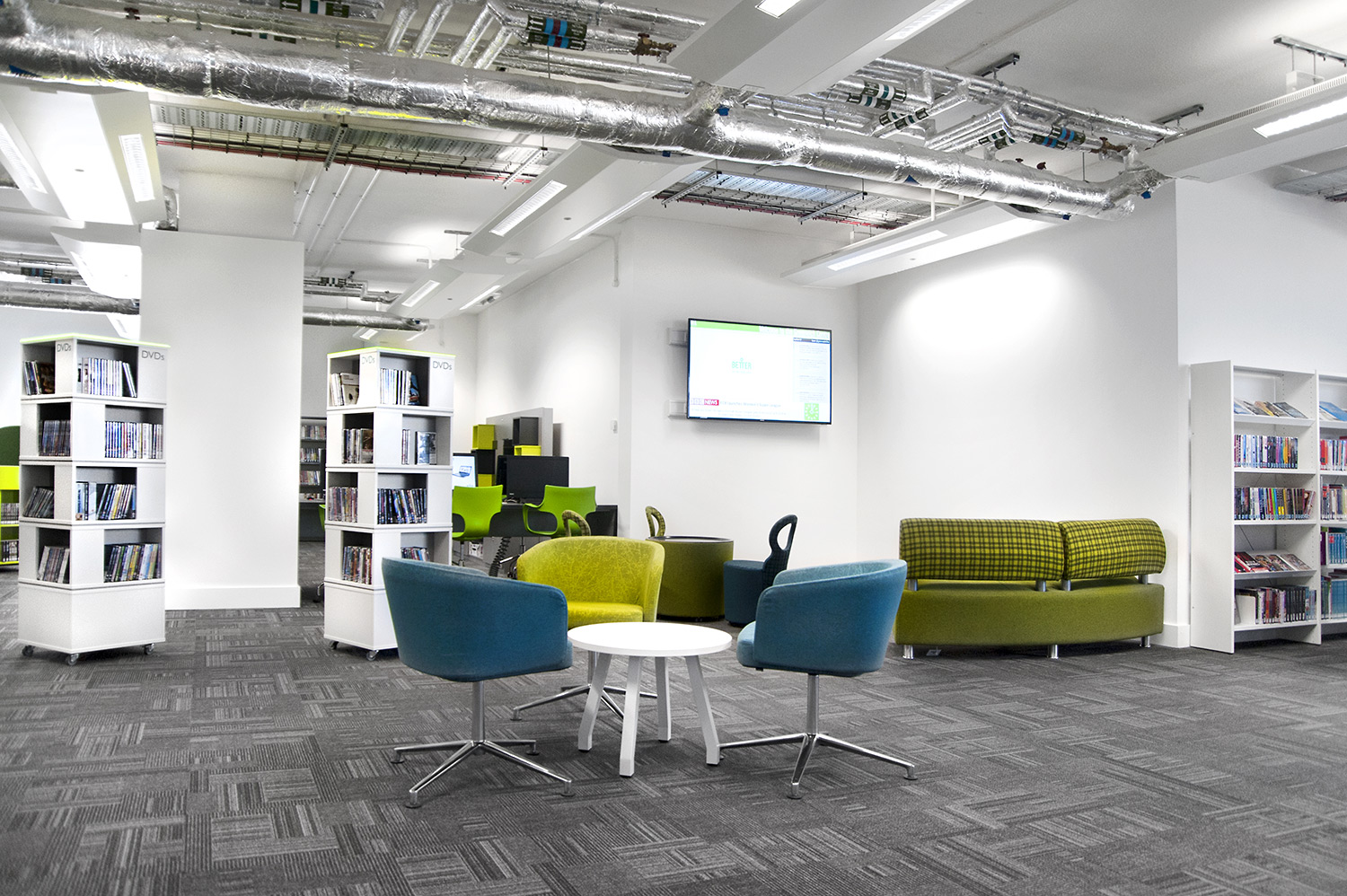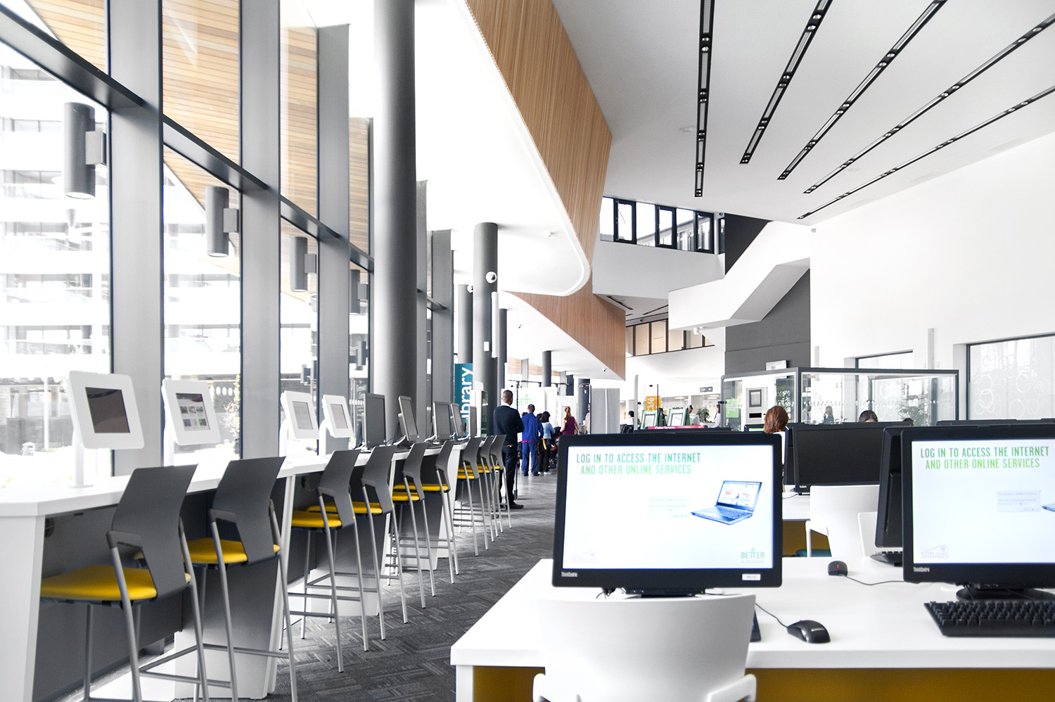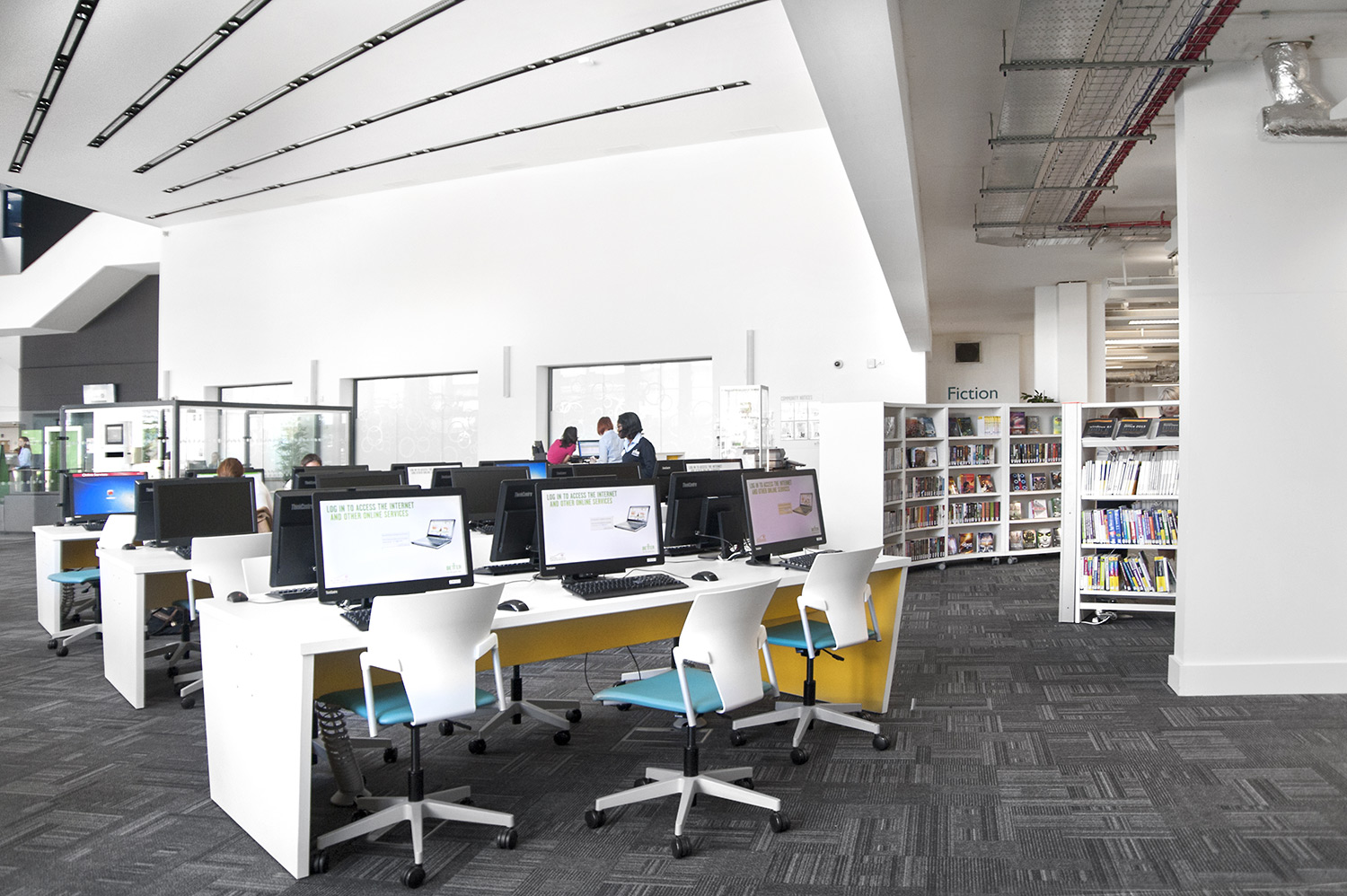 Throughout the library, digital end panels allow customers to browse for specific books and authors as well as giving access to the library’s app which highlights new books and facilities that are available for each customer.