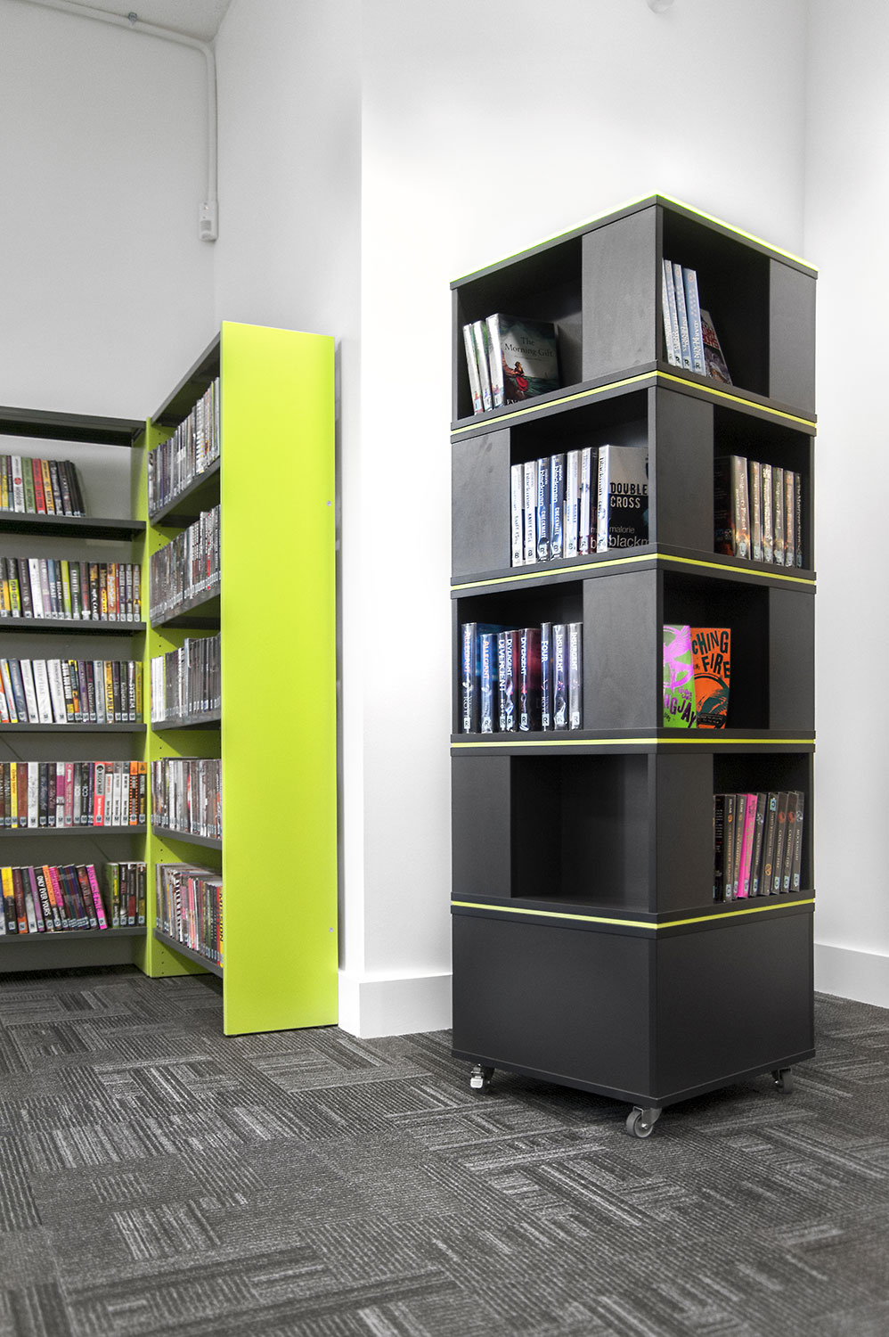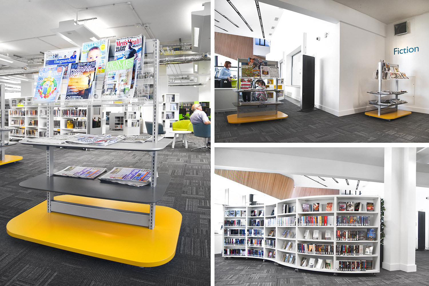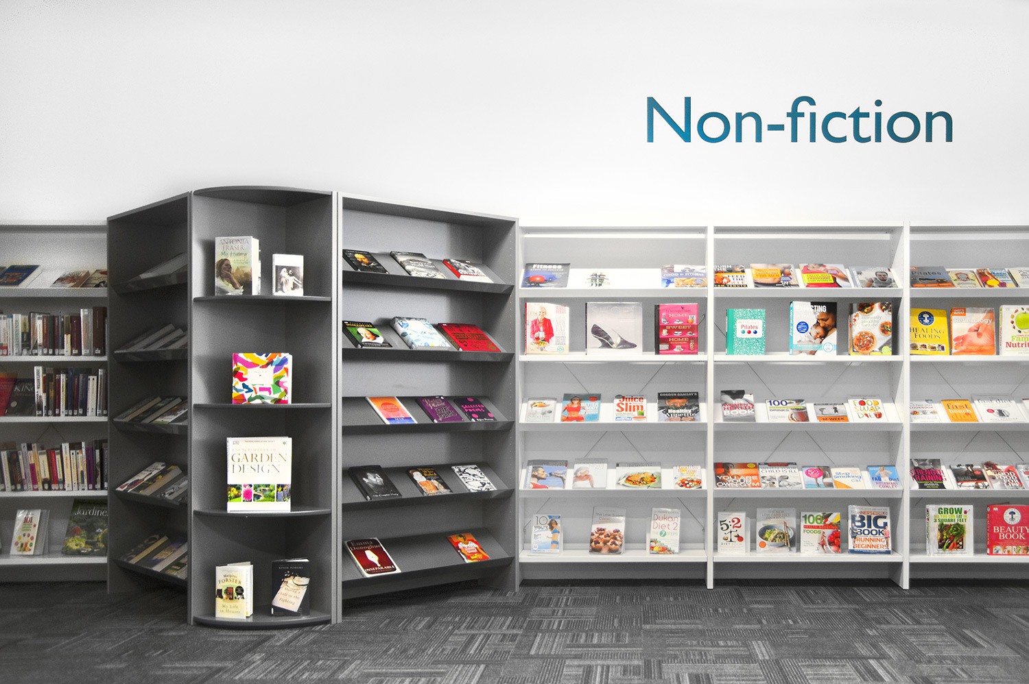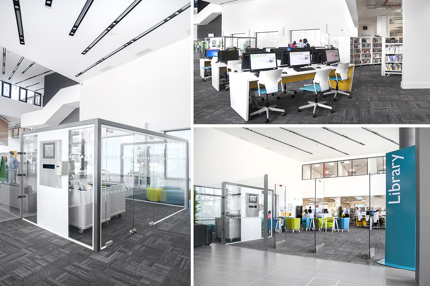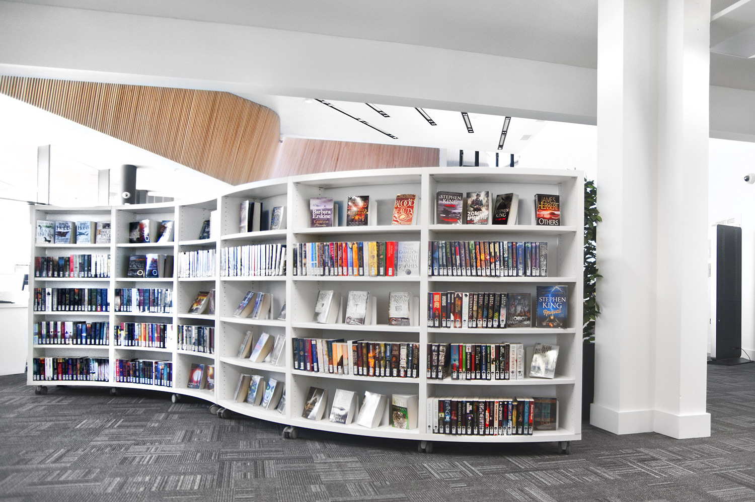 Throughout the library, digital end panels allow customers to browse for specific books and authors as well as giving access to the library’s app which highlights new books and facilities that are available for each customer.