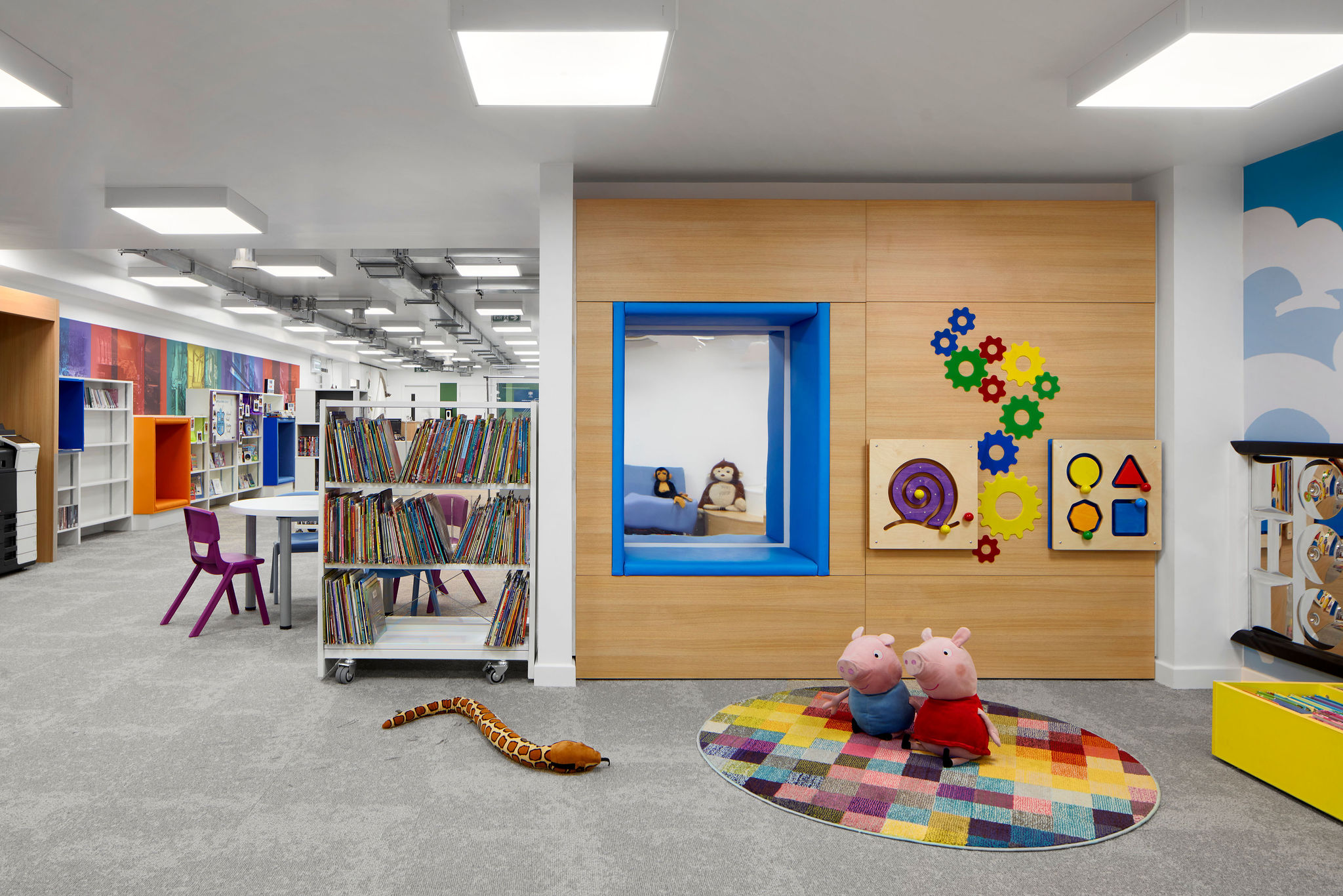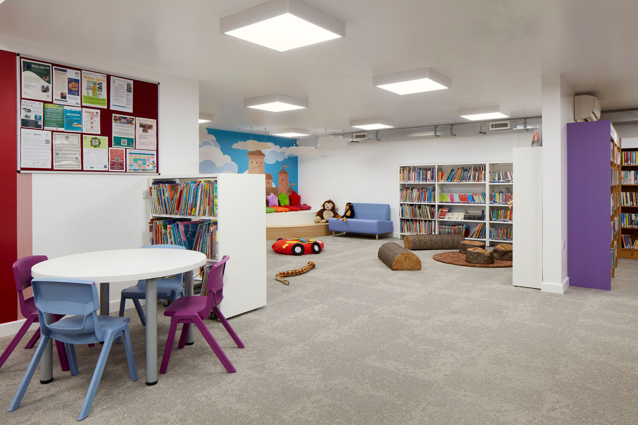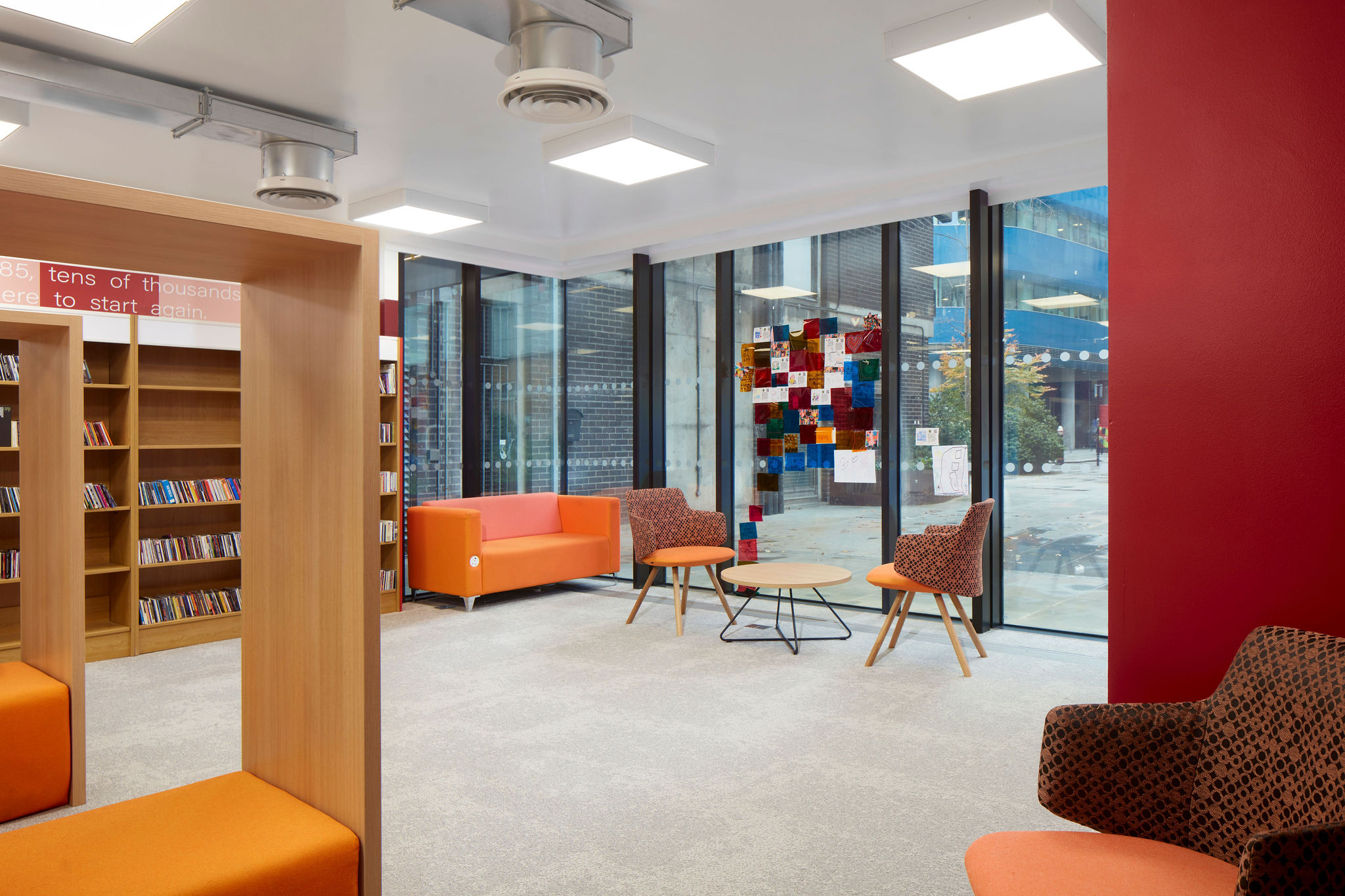 Our brief was to create a modern, vibrant, welcoming design that reflected this heritage of the area. The reception area was redesigned to consider the needs of the Housing Estate team as well as the Library Service and to reflect use of the library, which was predominately by families with young children and City workers. The low level island mobile shelving allows for easy flexibility and movement to open up and expand the space for group activities whilst the cocoon seating encourages a safe nook for quiet reding.