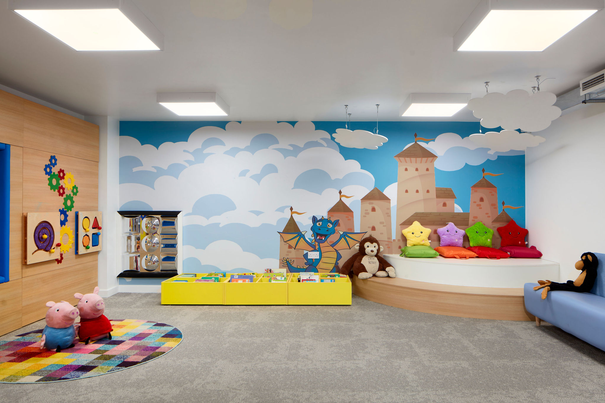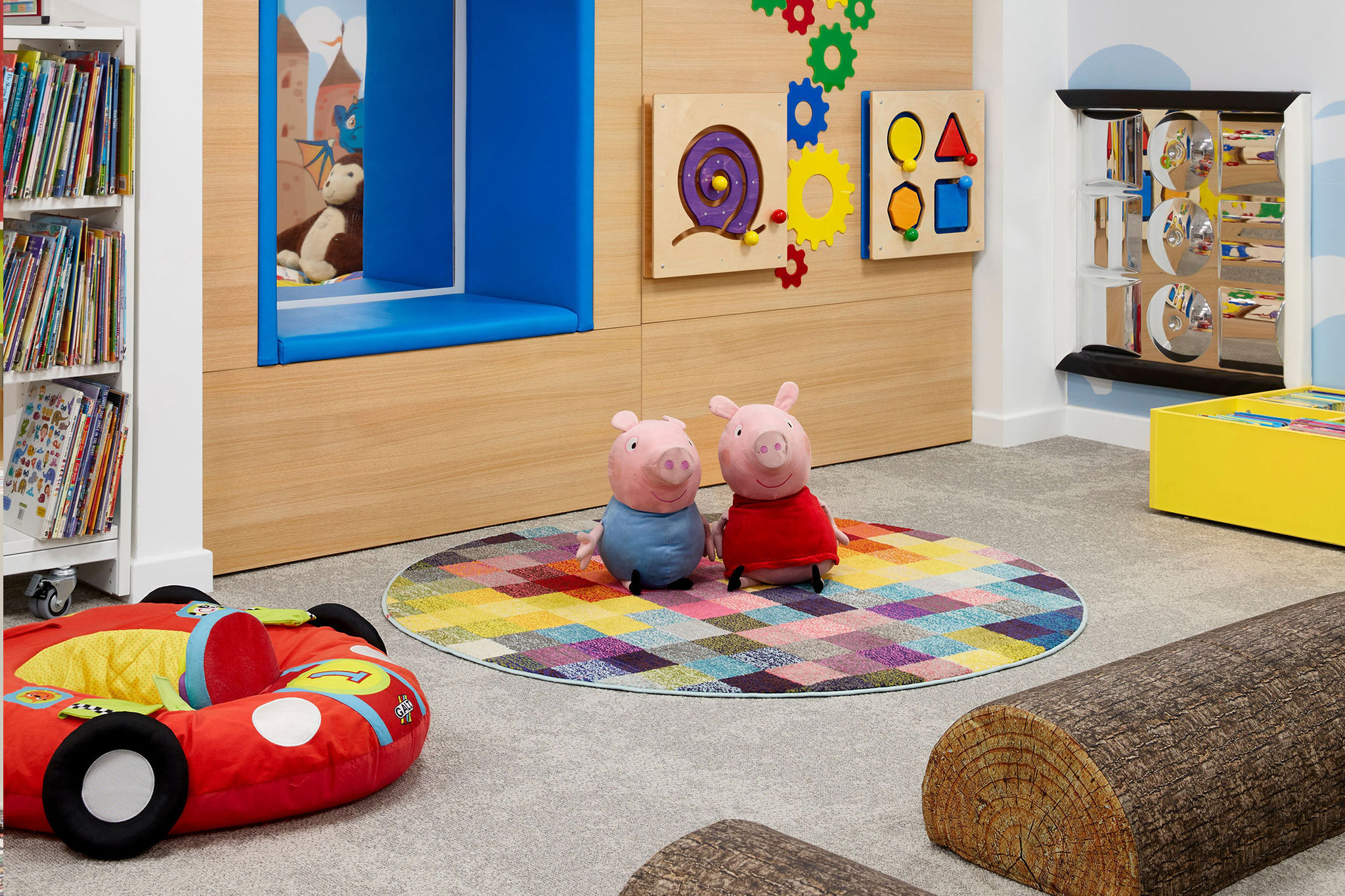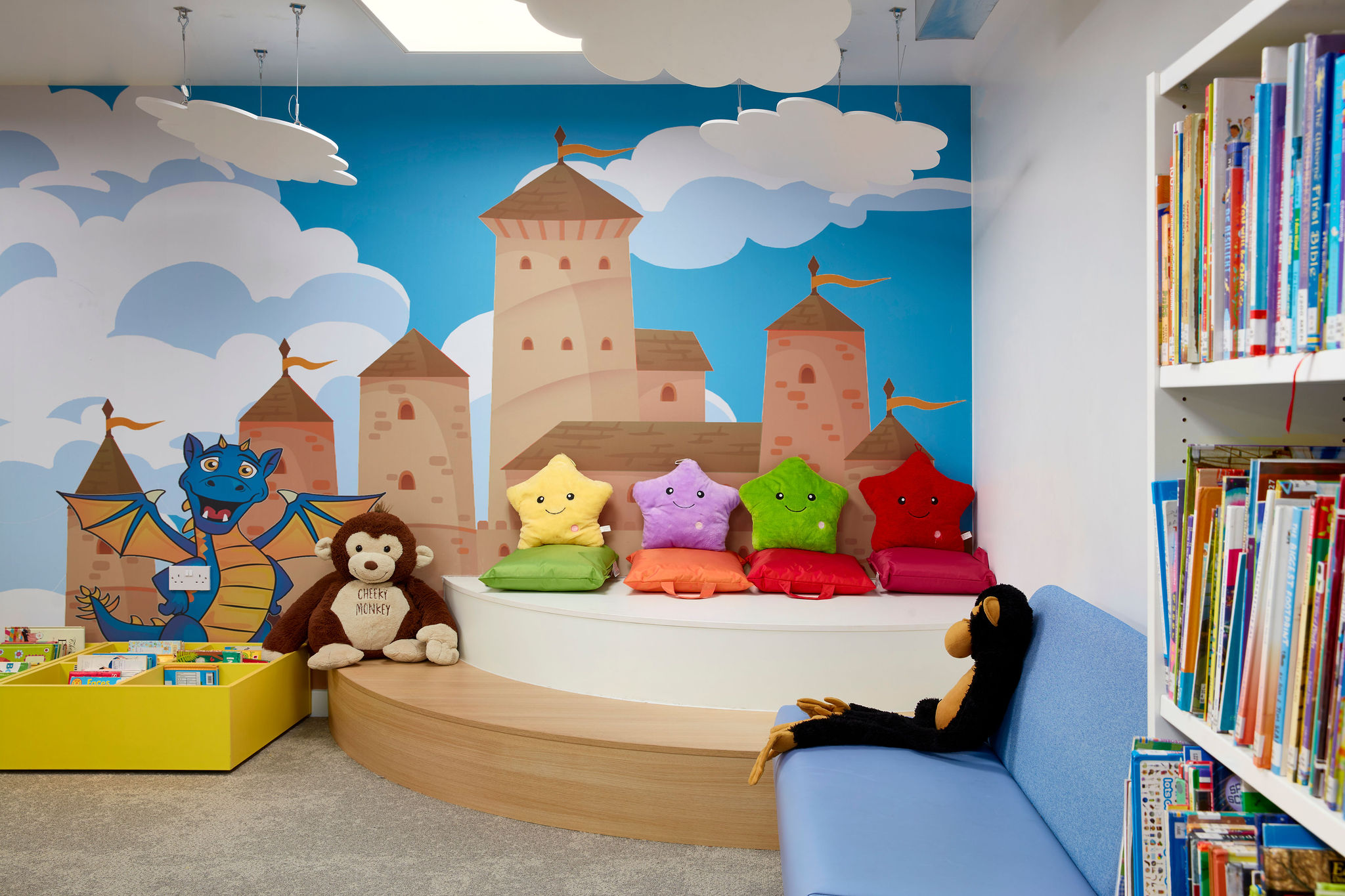 Our brief was to create a modern, vibrant, welcoming design that reflected this heritage of the area. The reception area was redesigned to consider the needs of the Housing Estate team as well as the Library Service and to reflect use of the library, which was predominately by families with young children and City workers. The low level island mobile shelving allows for easy flexibility and movement to open up and expand the space for group activities whilst the cocoon seating encourages a safe nook for quiet reding.