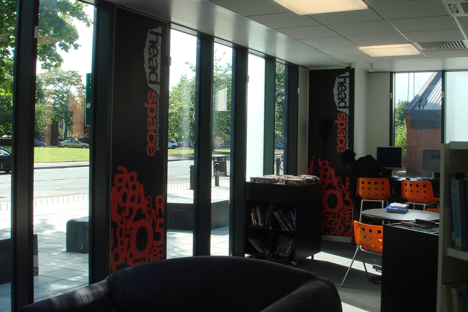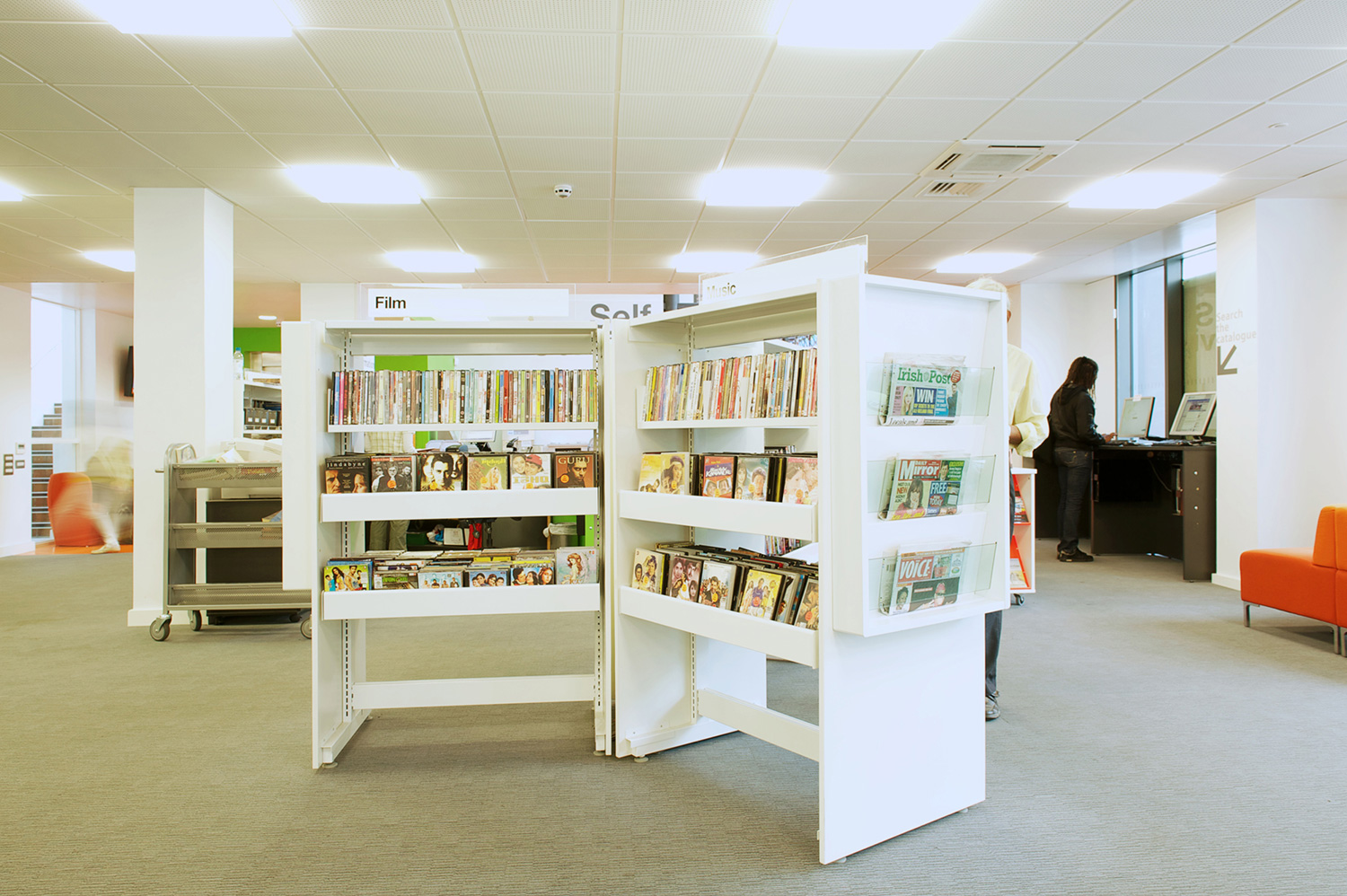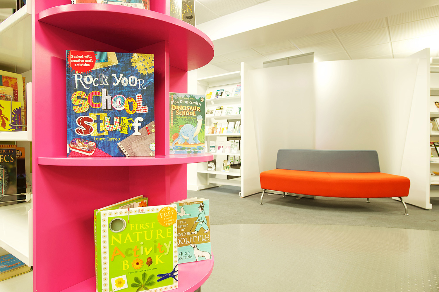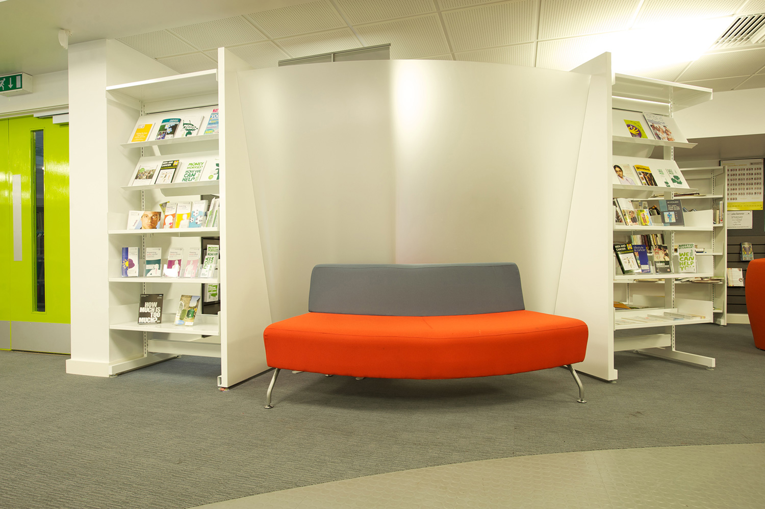 The library is equipped with Classic Steel Shelving System and specially made key pieces of furniture, designed to highlight the current quick pick furniture. The library share the same basic concept as Beswick, Brooklands and the Central Library in Manchester, but the unique colour themes and a couple of characteristics details give the library its own identity.