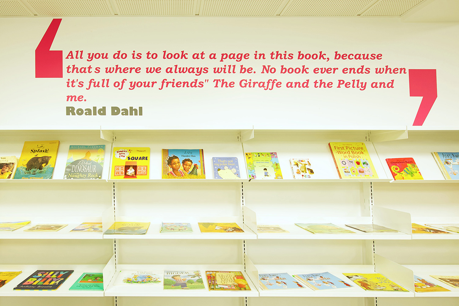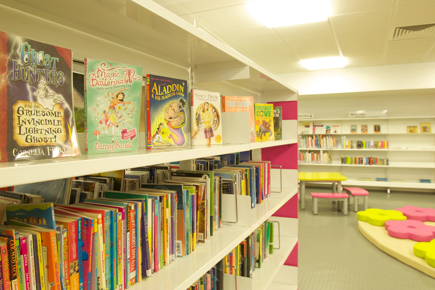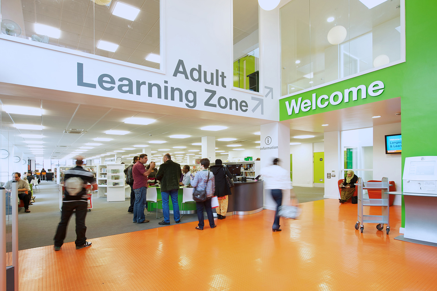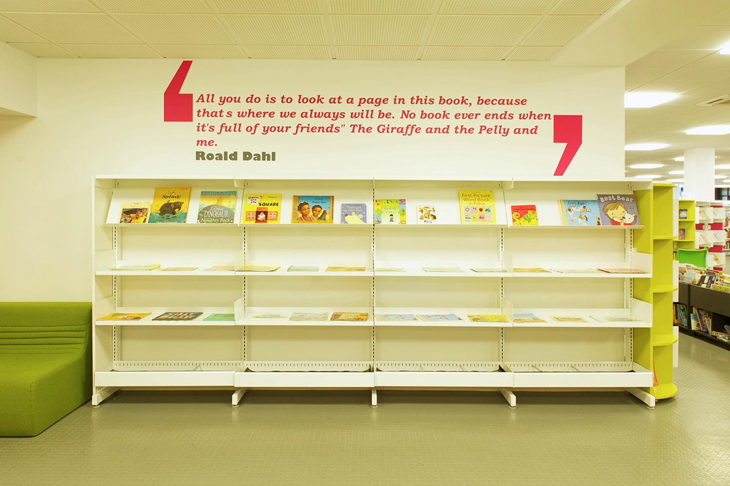 The library is equipped with Classic Steel Shelving System and specially made key pieces of furniture, designed to highlight the current quick pick furniture. The library share the same basic concept as Beswick, Brooklands and the Central Library in Manchester, but the unique colour themes and a couple of characteristics details give the library its own identity.
