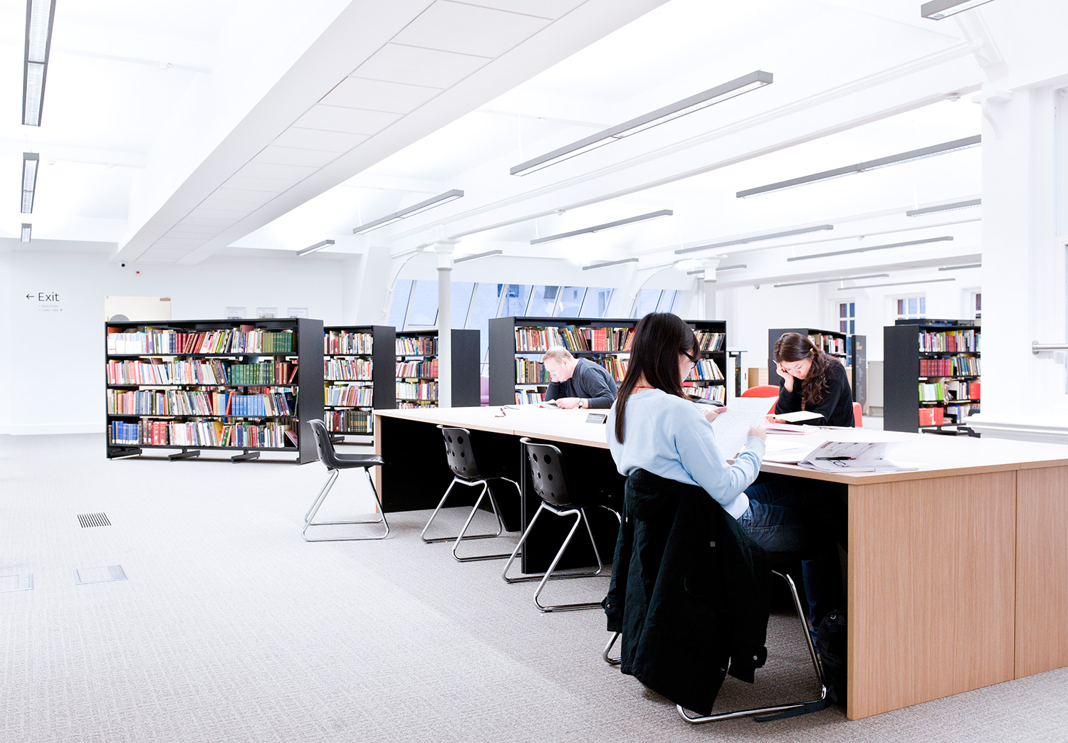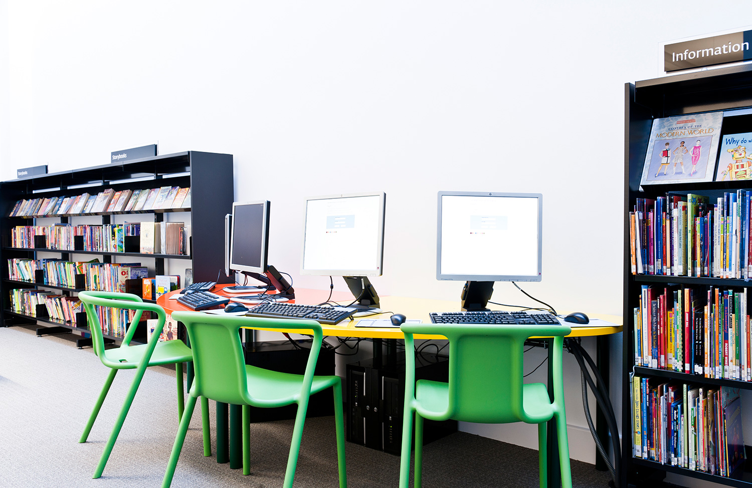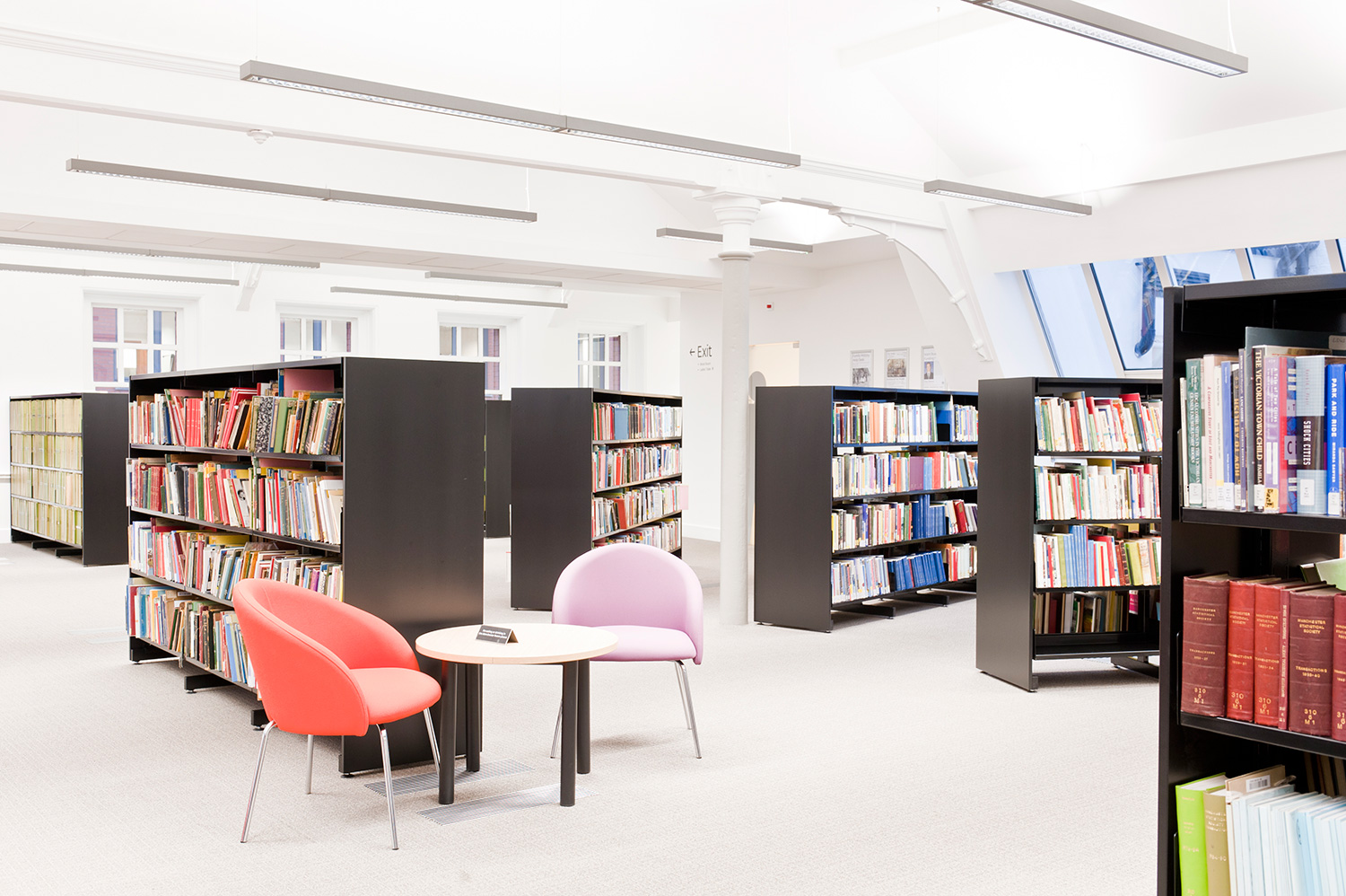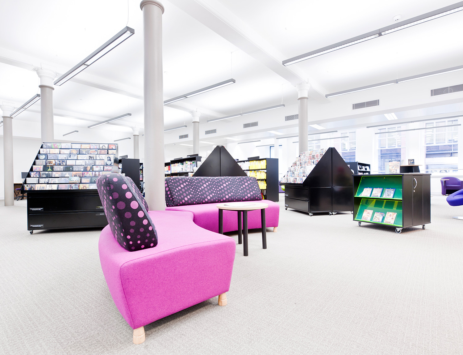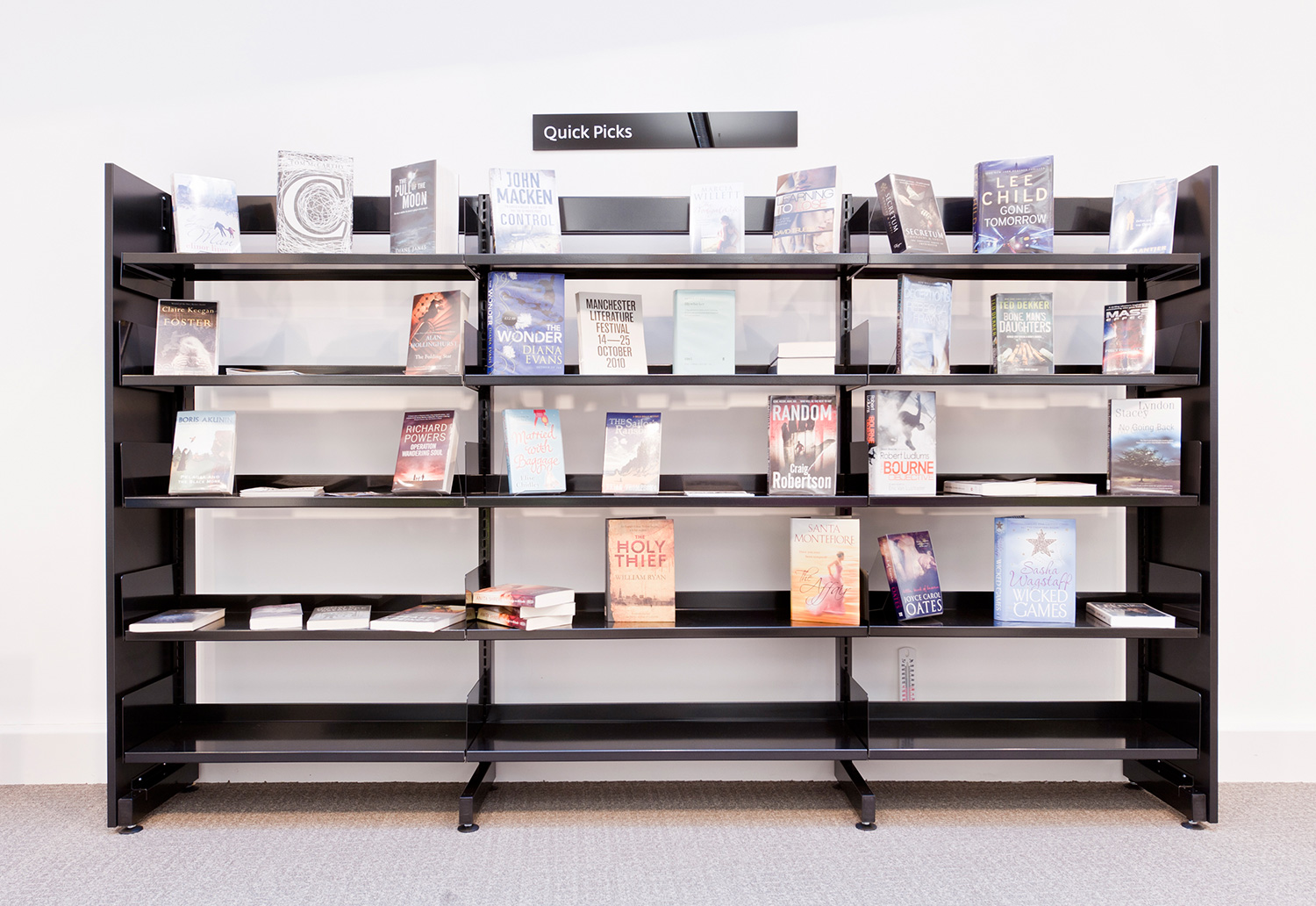 The library is equipped with Classic Steel Shelving System and specially made key pieces of furniture, designed to highlight the current quick pick furniture. The library share the same basic concept as Longsight, Beswick and Brookland, but the unique colour themes and a couple of characteristics details give the library its own identity.