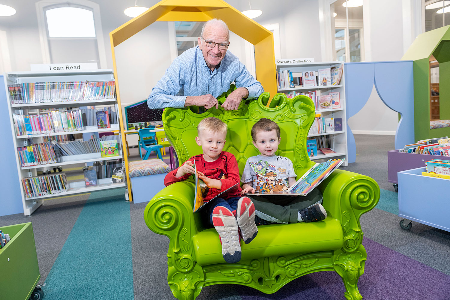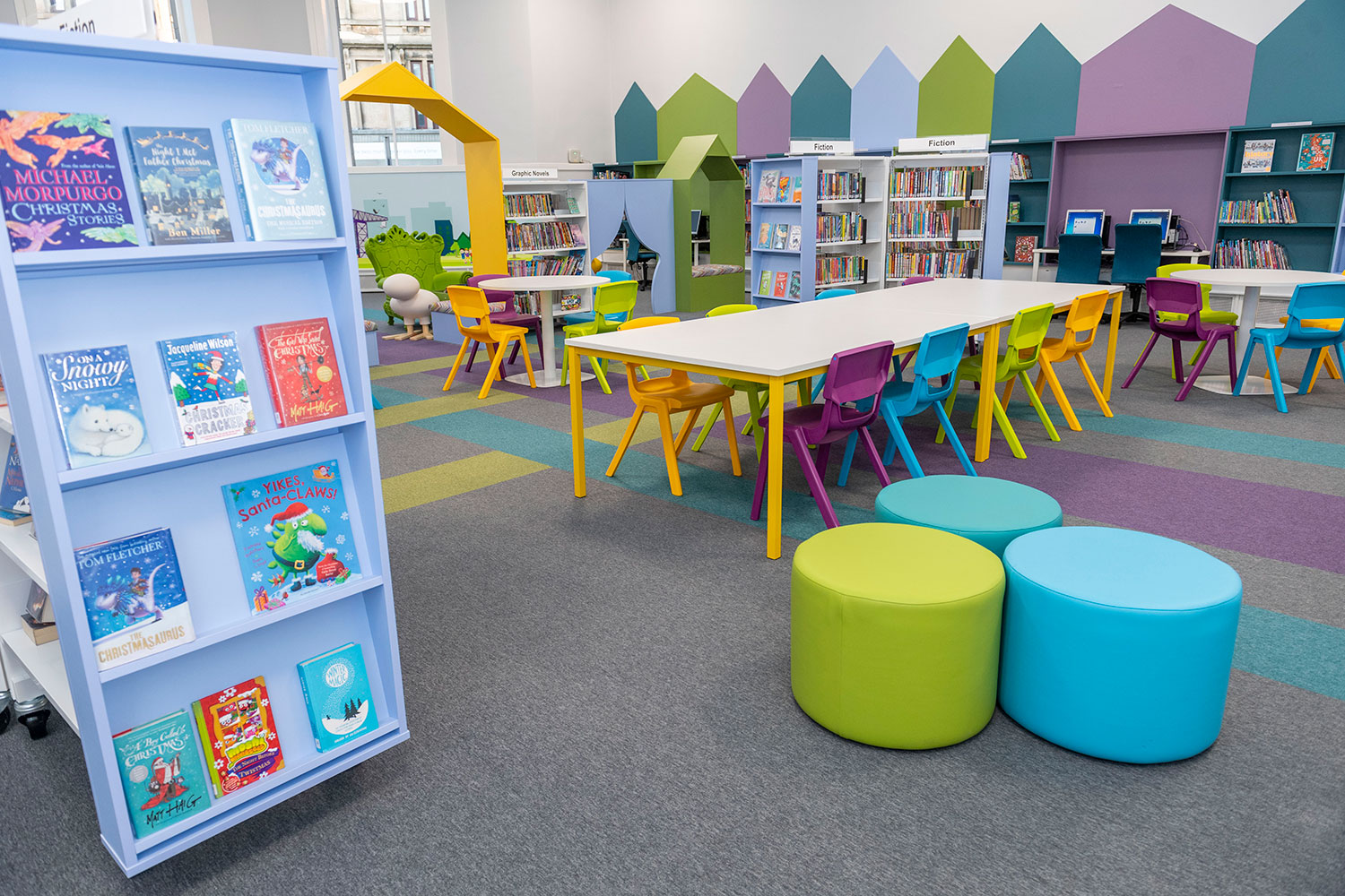 The Children’s Library has been completely revamped. Brightly coloured walls, shelving and furniture capture users attention and creates a space where youngsters want to spend time. A multi-platform stage can be used for events and a sensory nook, the first available in Glasgow, provides a safe space for children with additional needs.