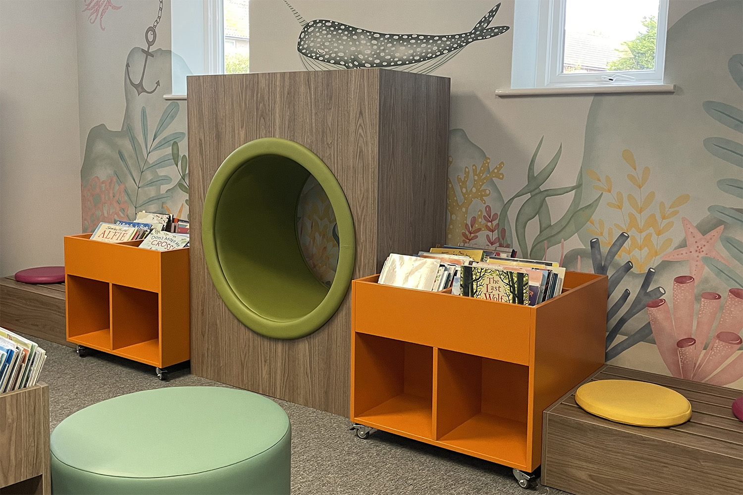 Upon entry into the library visitors are greeted with a modern display unit with built in benches in a layered effect to create a feature at the entrance. Height-adjustable info pods are clearly visible from the main entrance and we created a non-obtrusive approach allowing customers to wait/browse and not feel crowded. There are un-obstructed aisle, circulation, and thoroughfares throughout with no dead ends in the main open plan areas. There is a clear route to the Children’s Library, Staff Help Points and beyond from Main Entrance. The central laptop bench is perfect for “bring your own device” Display shelves on the end panels showcase the latest books and mixed in with graphics to create a welcoming environment. A quiet, soft seating area and the use of Cocoon seating in the open plan areas creates extra privacy.