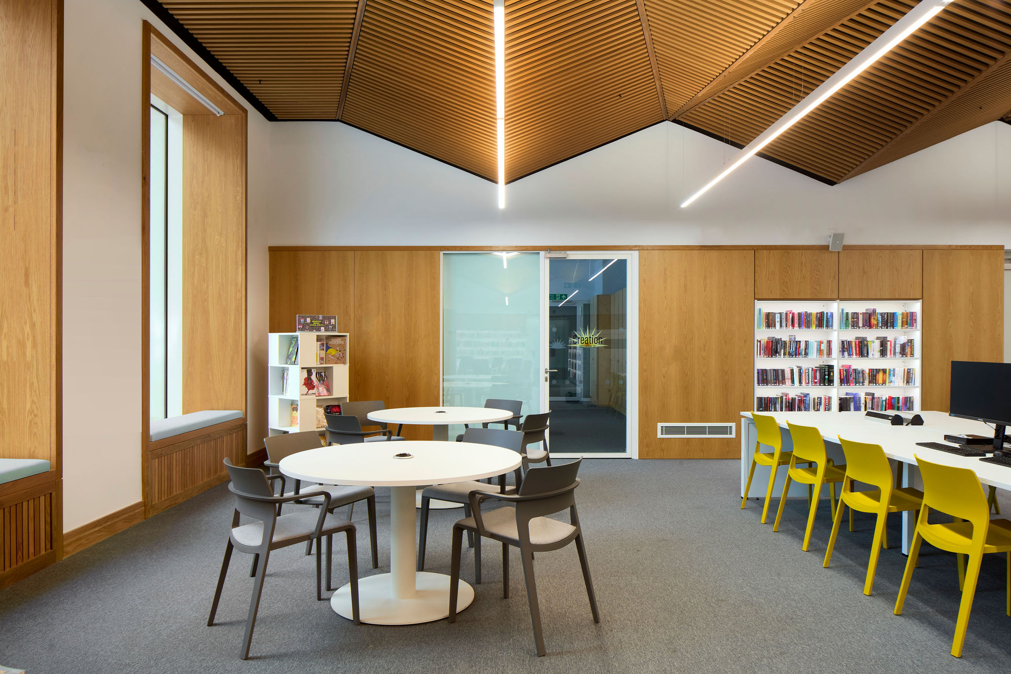 The new Library is situated on the ground floor of an urban block with residential accommodation in the floors above. The spaces are accessed via the main Library entrance during normal working hours and via a separate secondary door after hours. The library and community spaces face onto the new public square. The Community spaces comprise a total 198sqm floor area, with a multi-use room. There are two meeting rooms in the library and the multi-use room is used as a Stay-and-Play facility in the weekday mornings.