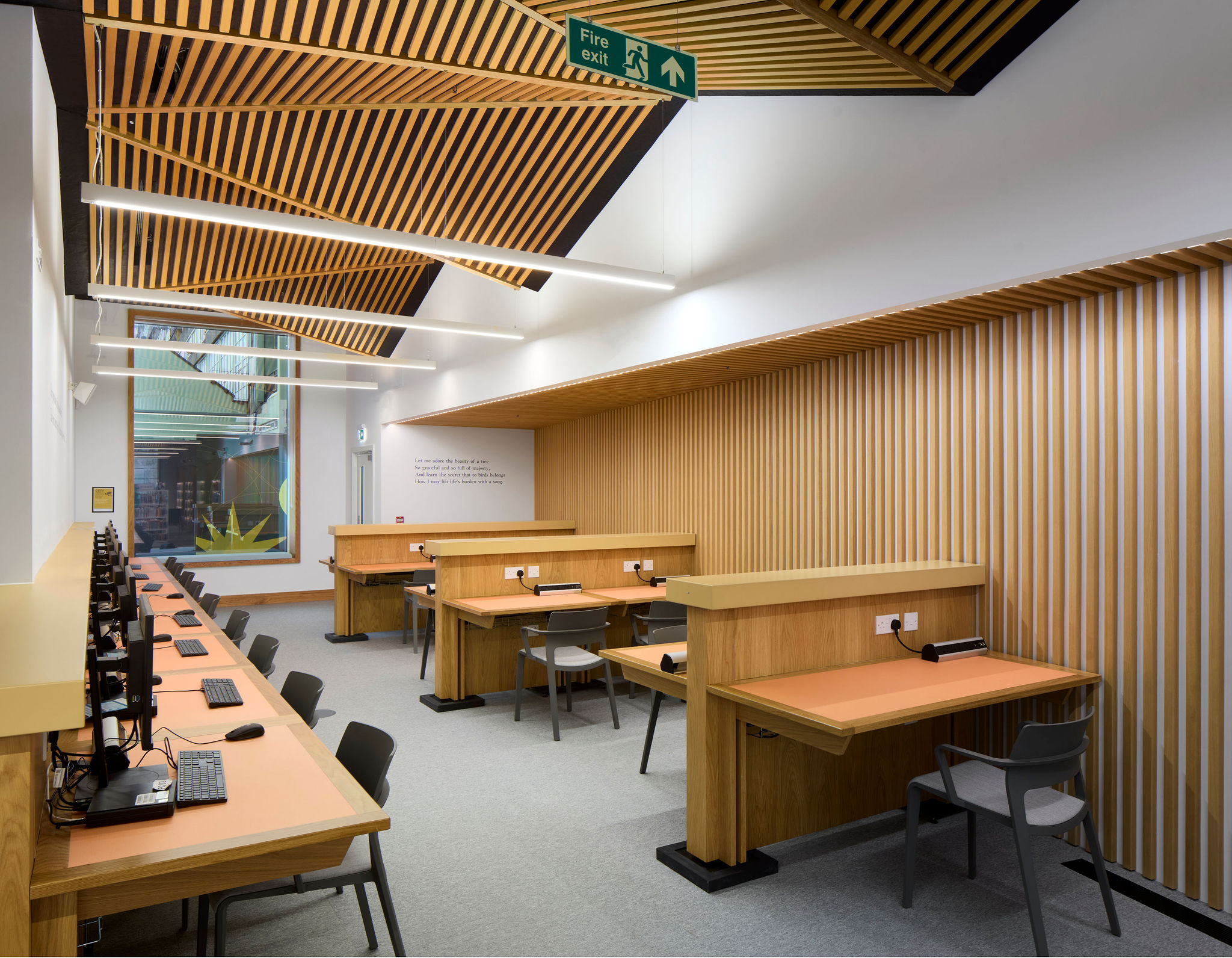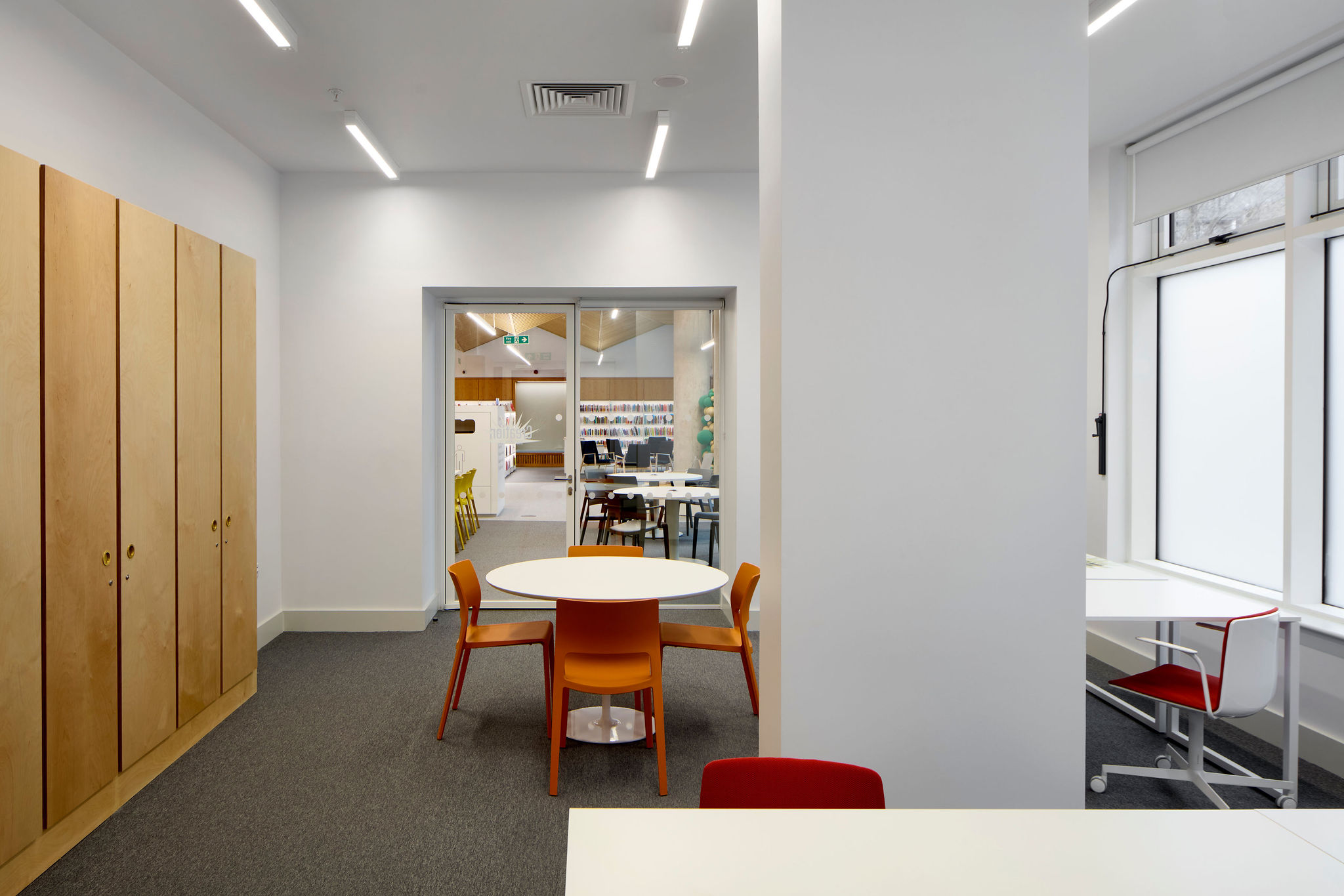 The library is fully accessible with level access. It has generous storage for bulky and small items. The natural lighting makes the space feel light and bright.