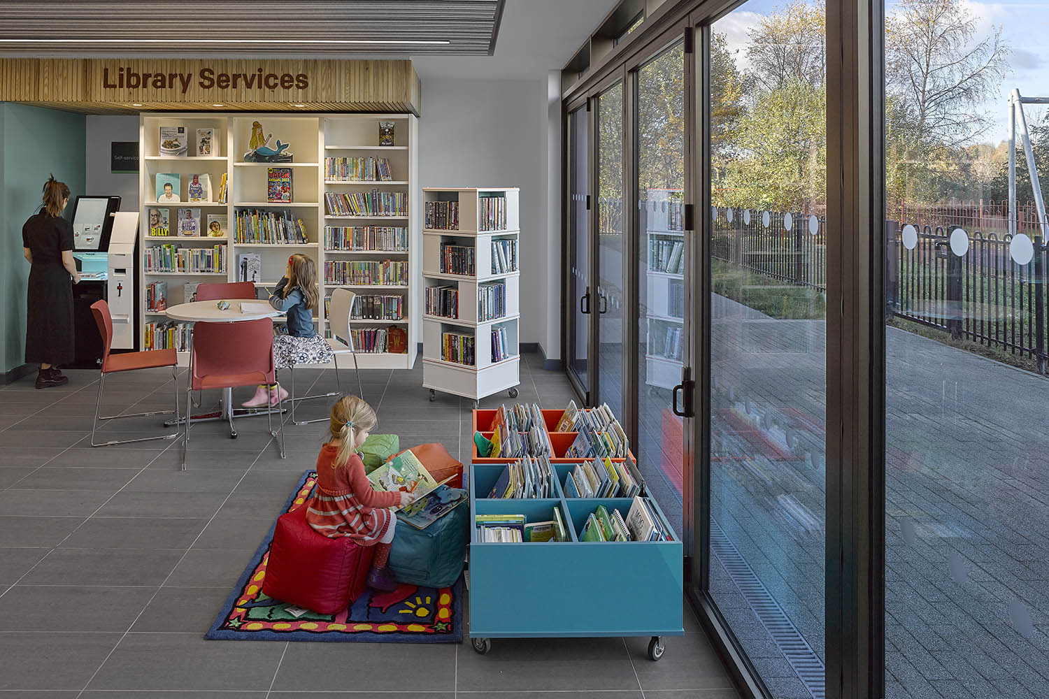 The library is small, but perfectly formed and bi-fold doors bring the outside in. They open the library up onto a beautiful patio with seating areas. It includes self-service book borrowing and free public computers. A reception/social area, providing a reception for community hub users and seating. The library was designed for self-service and focuses on two universal offers – reading and information.