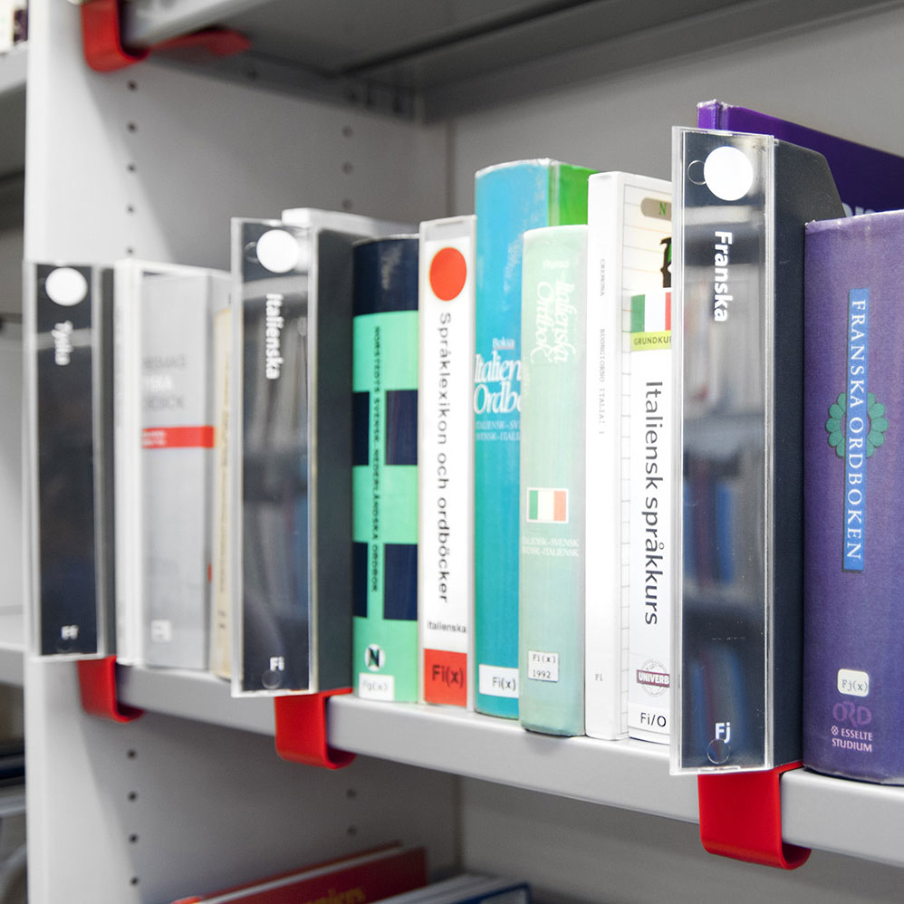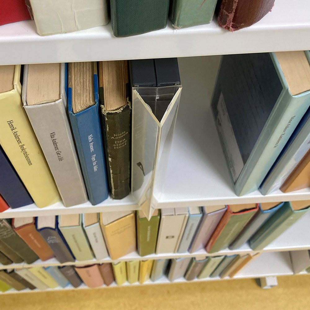 Foldable label holder protruding from the shelf.