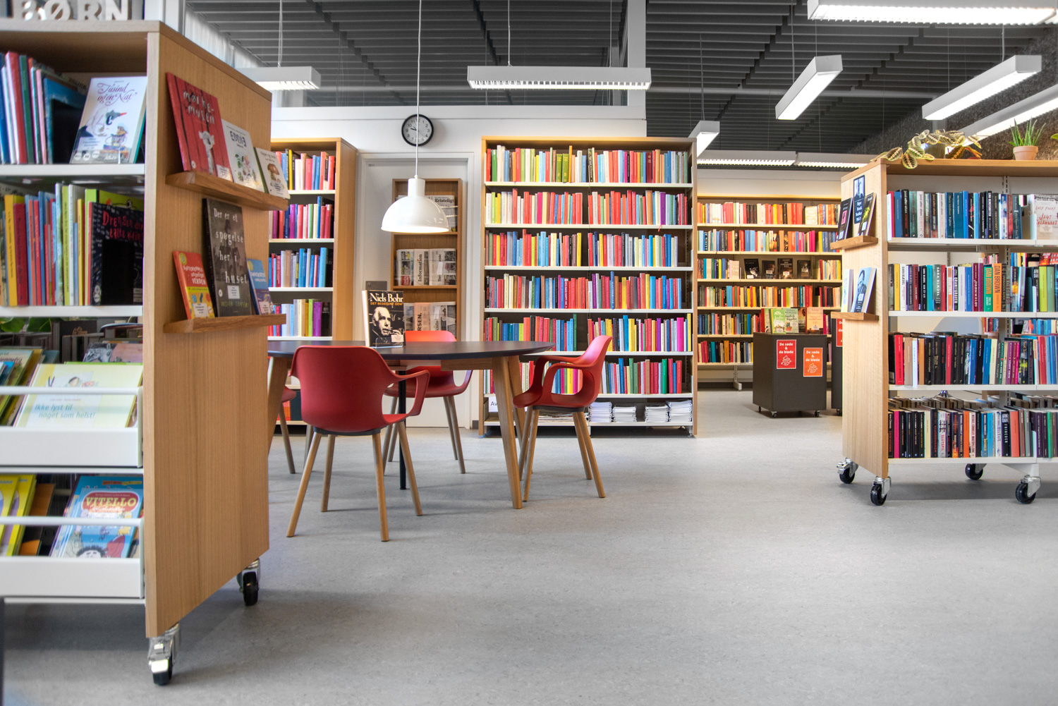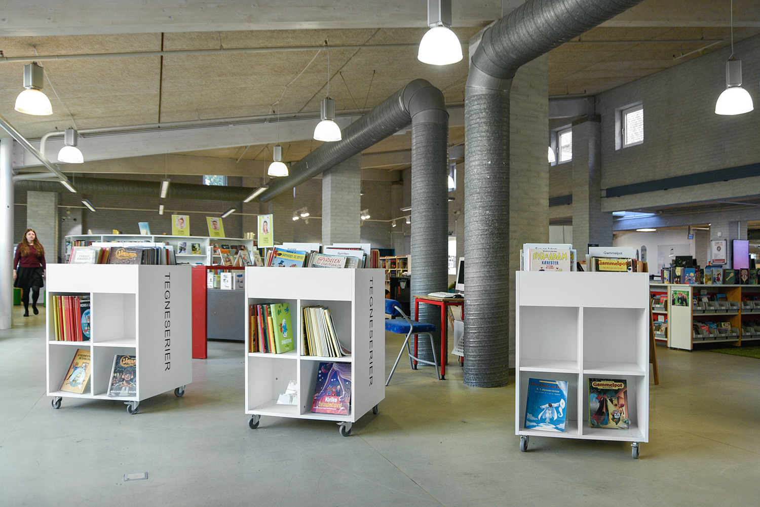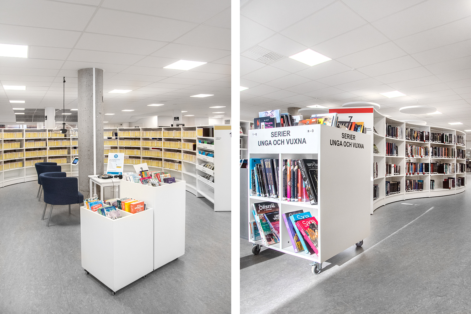 Sara is a functional yet modern browser that presents and stores all types of books and medias in an uncomplicated and visual manner. Depending on the height, the browser can fit both children and adults and be used in all areas of the library.