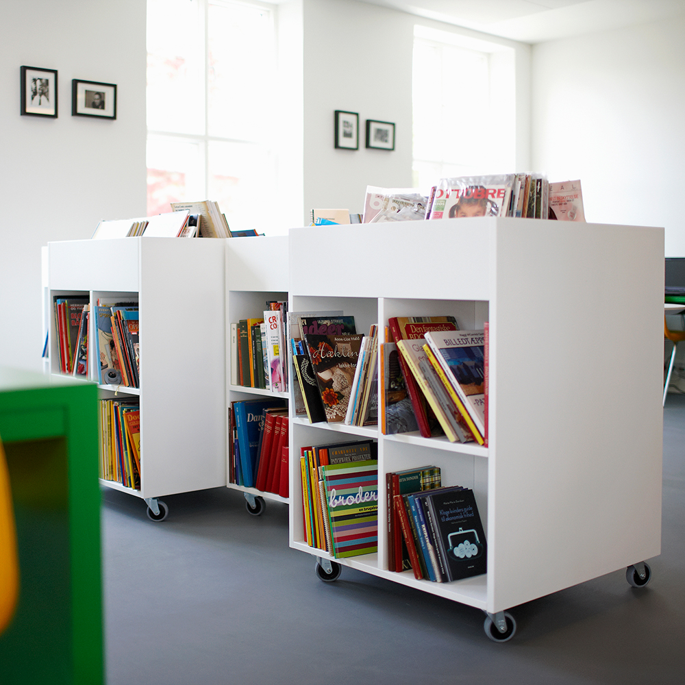 Sara Maxi is a book browser with four display compartments at the top and eight storage compartments underneath. Ideal for both children and adults.