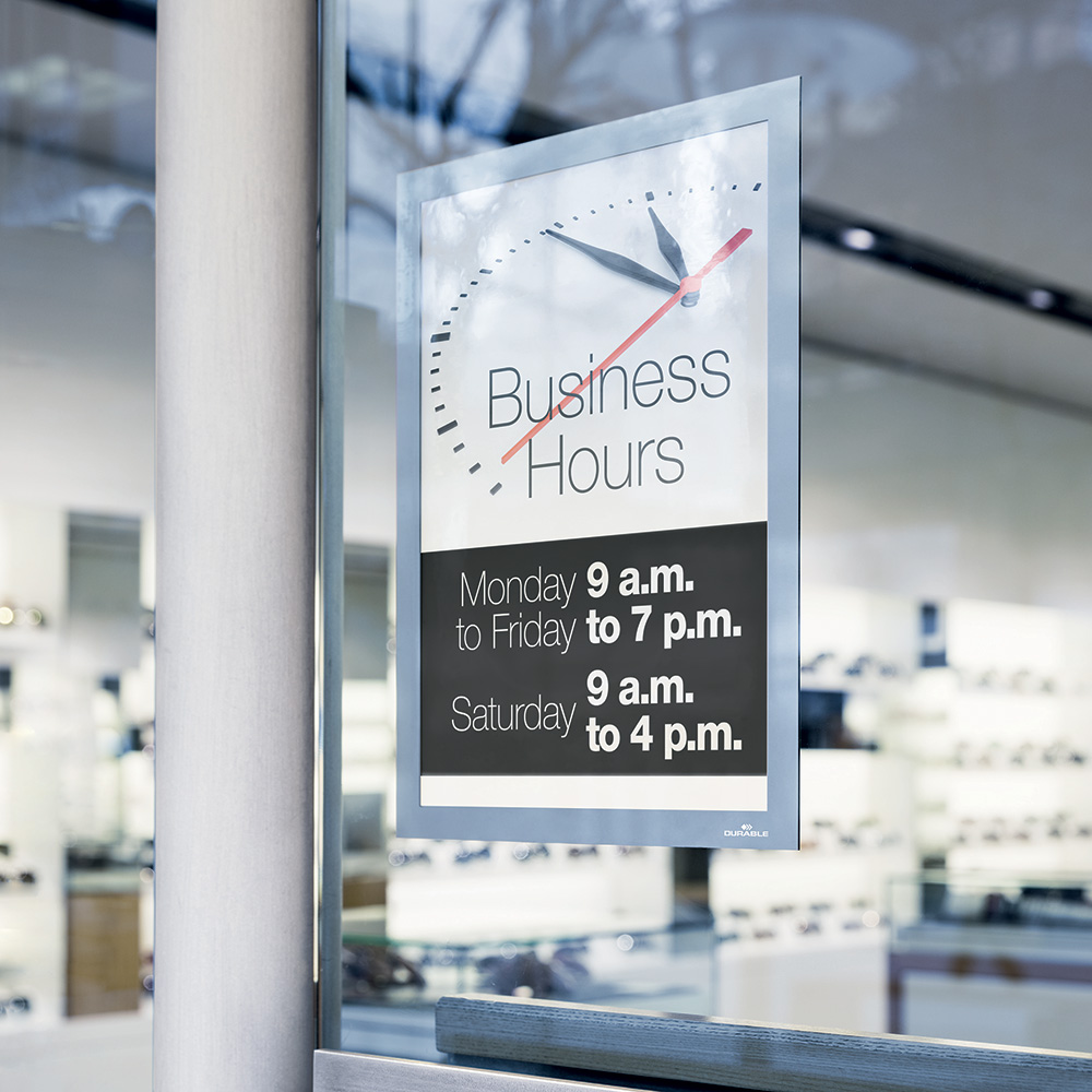 The static magnetic frames (Duraframe® Poster Sun) attach static completely without glue (without the risk of bubbles forming). Ideal for advertising and information on larger windows and other glass panels.